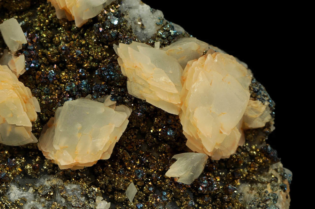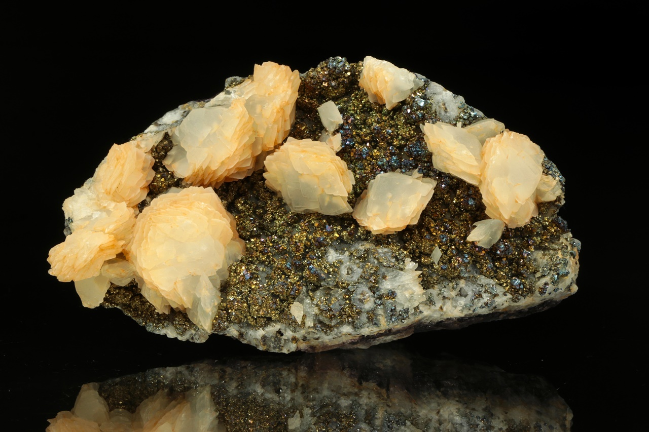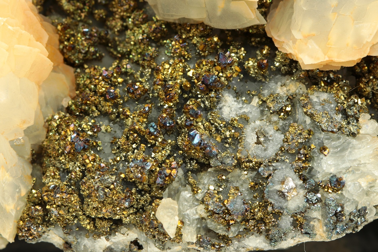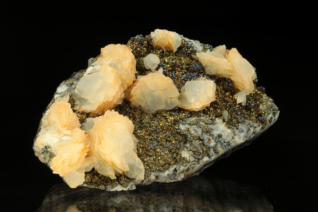 Vějiřovité agregáty průsvitného kalcitu narůstající s drobným pyritem na podložce z hradbového ametystu.