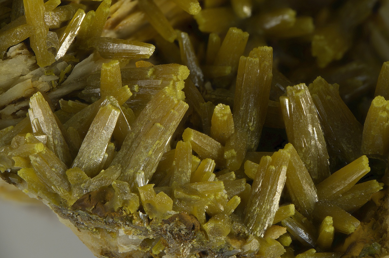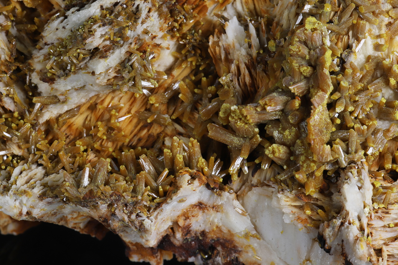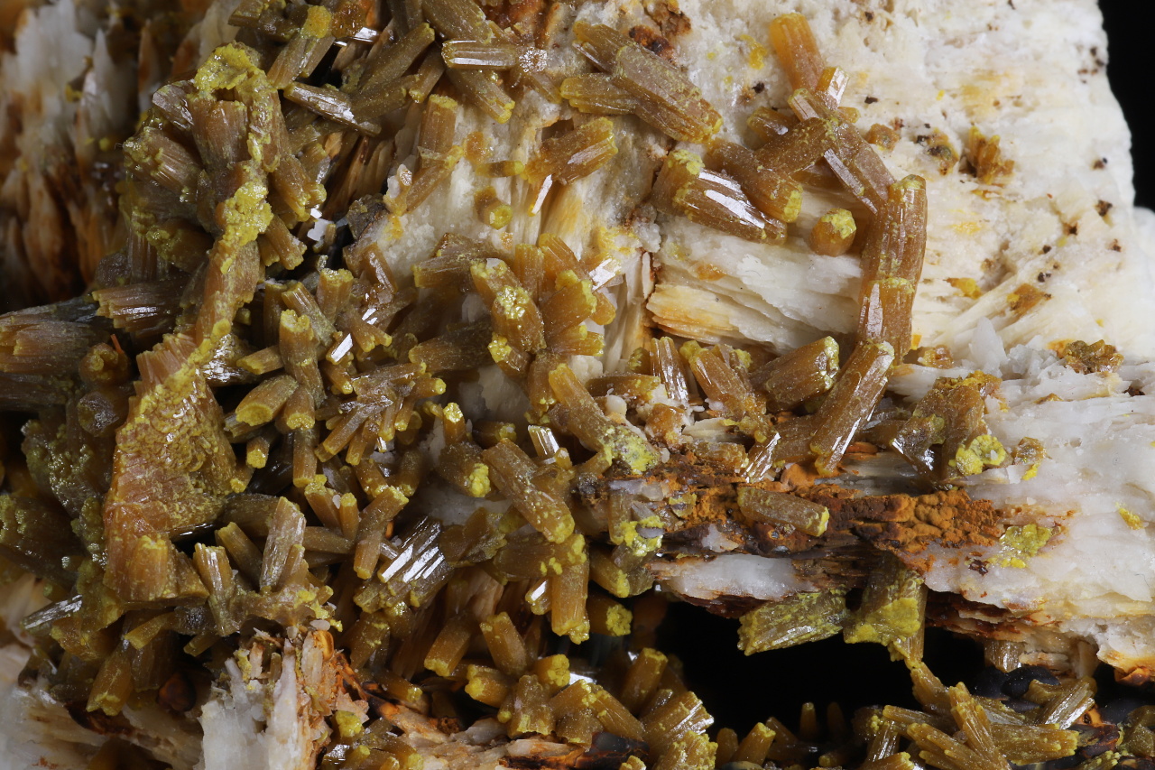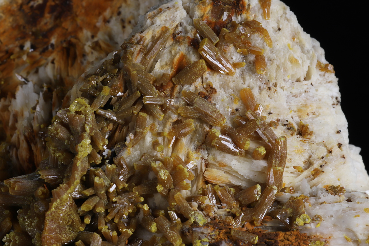 A very aesthetic druse of shiny brownish-orange pyromorphite crystals, 7-8 mm in size, with yellow-green tips on white baryte. A quality collection specimen from the classic famous French locality of the Les Farges mine.