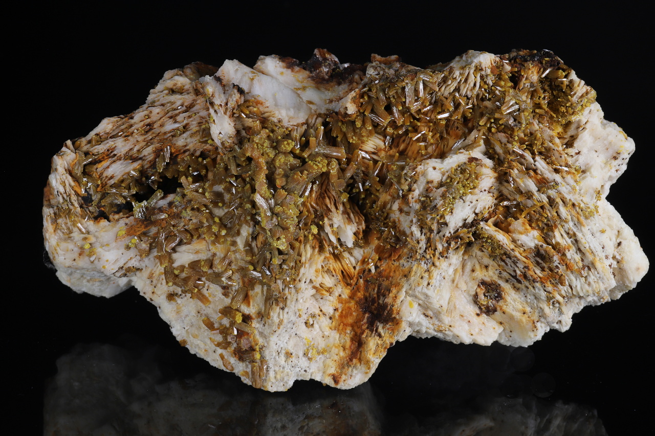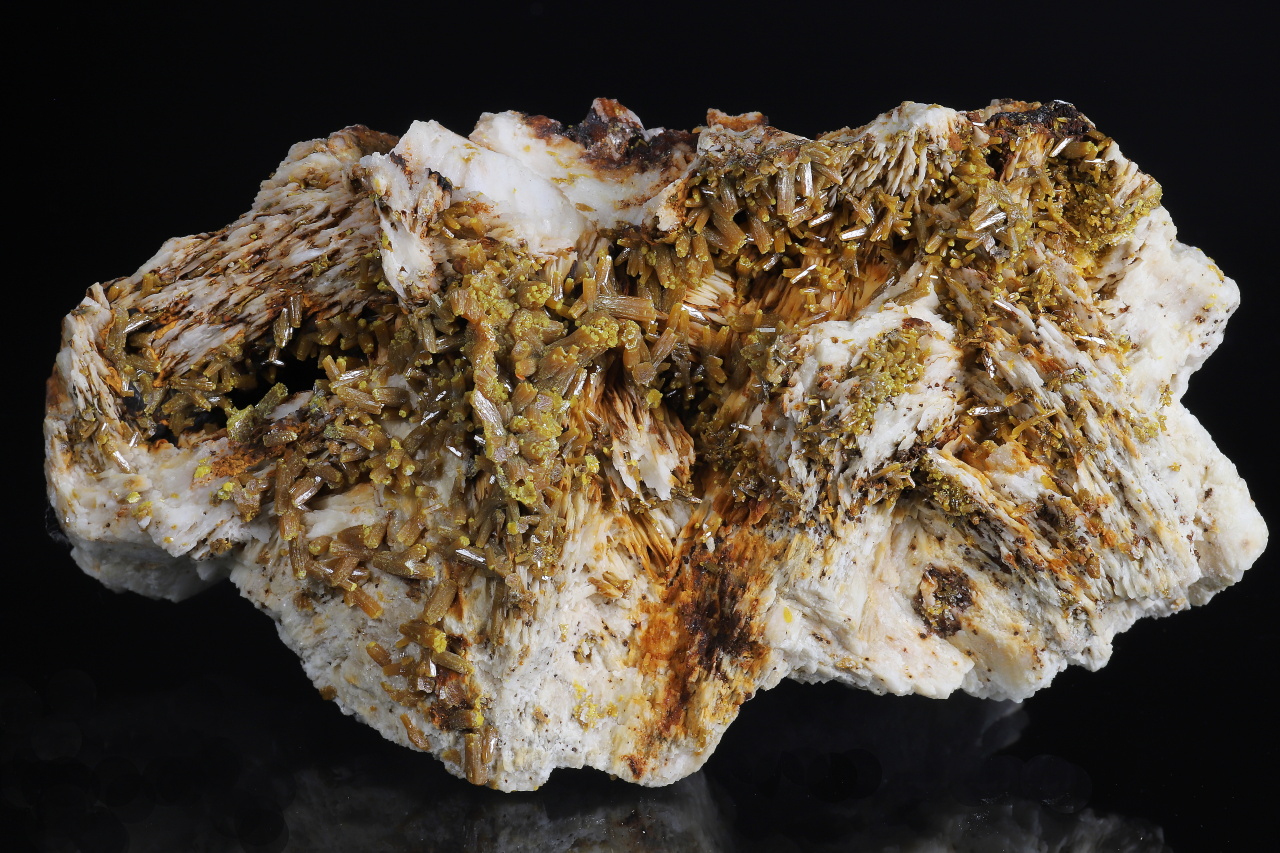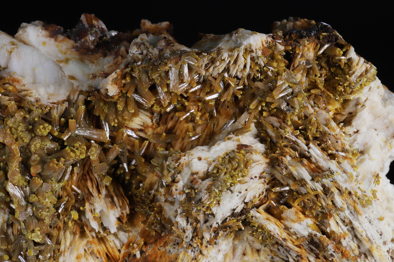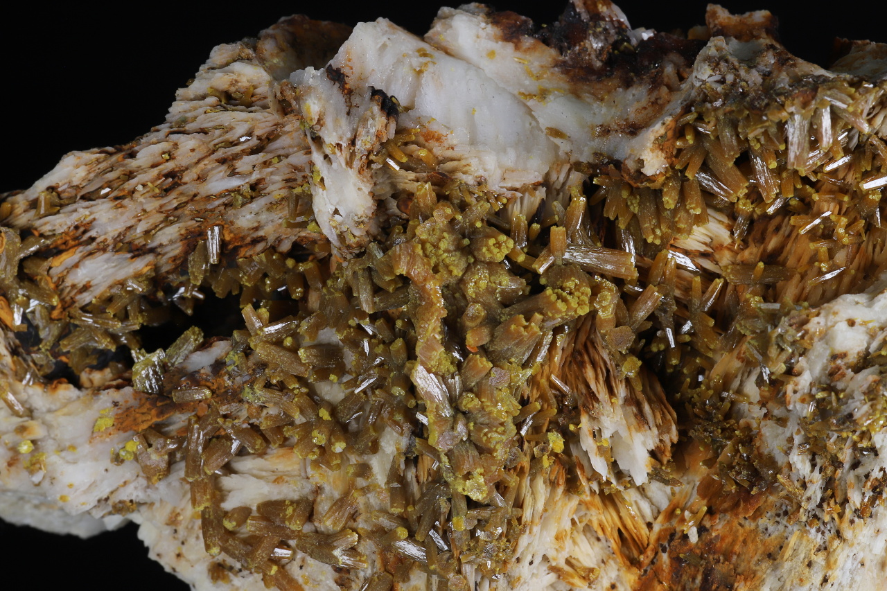 A very aesthetic druse of shiny brownish-orange pyromorphite crystals, 7-8 mm in size, with yellow-green tips on white baryte. A quality collection specimen from the classic famous French locality of the Les Farges mine.