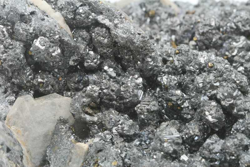 Beautiful example of black lustrous crystallized bournonite from the Cavnic locality, Romania. A lovely rich sample of bournonite crystals up to 5 mm in size grown on tabular crystals of semi-transparent baryte.
