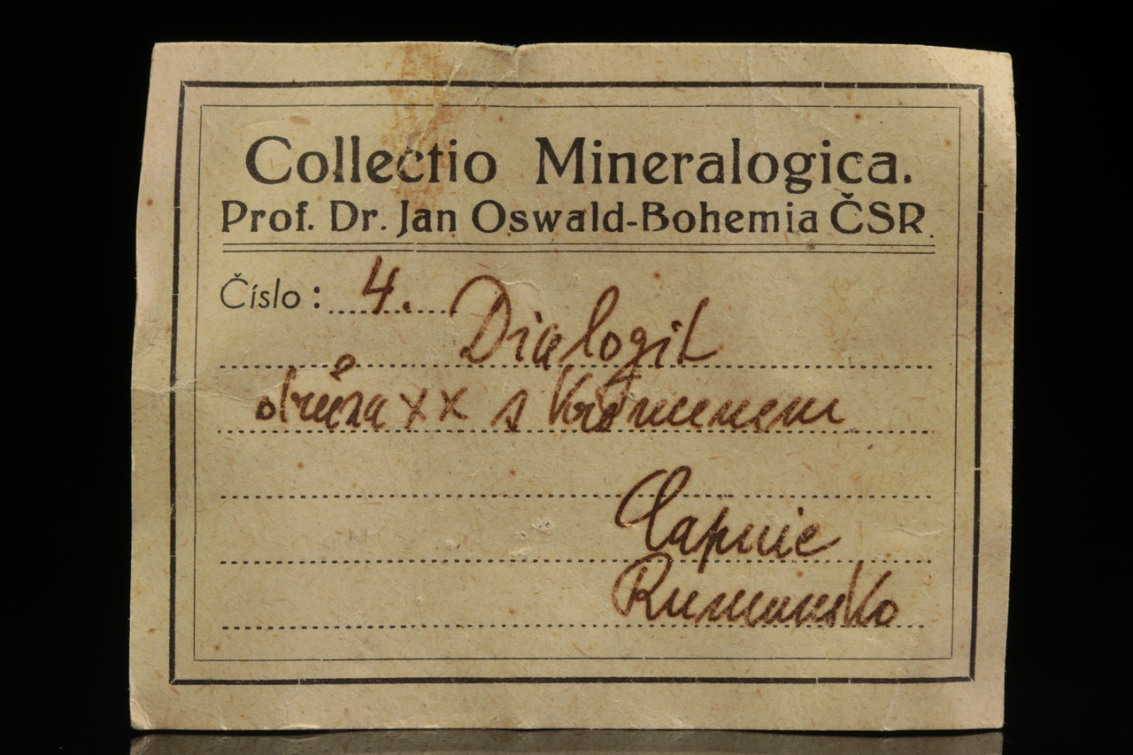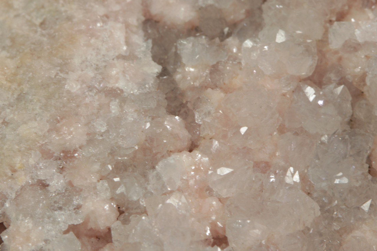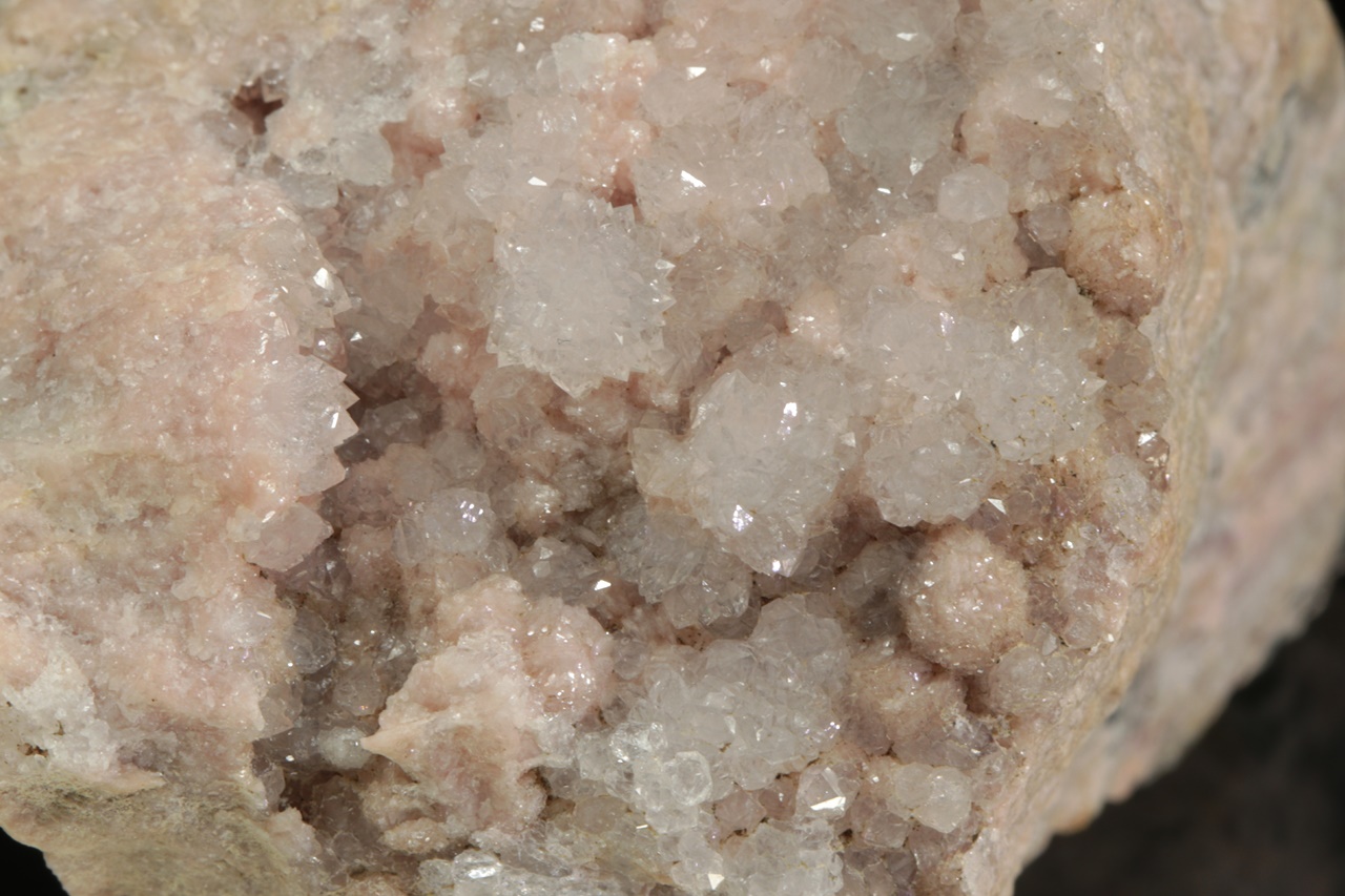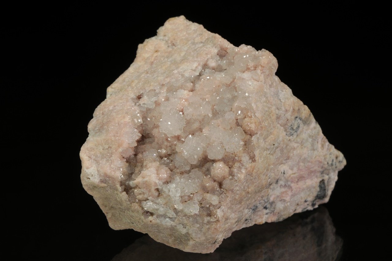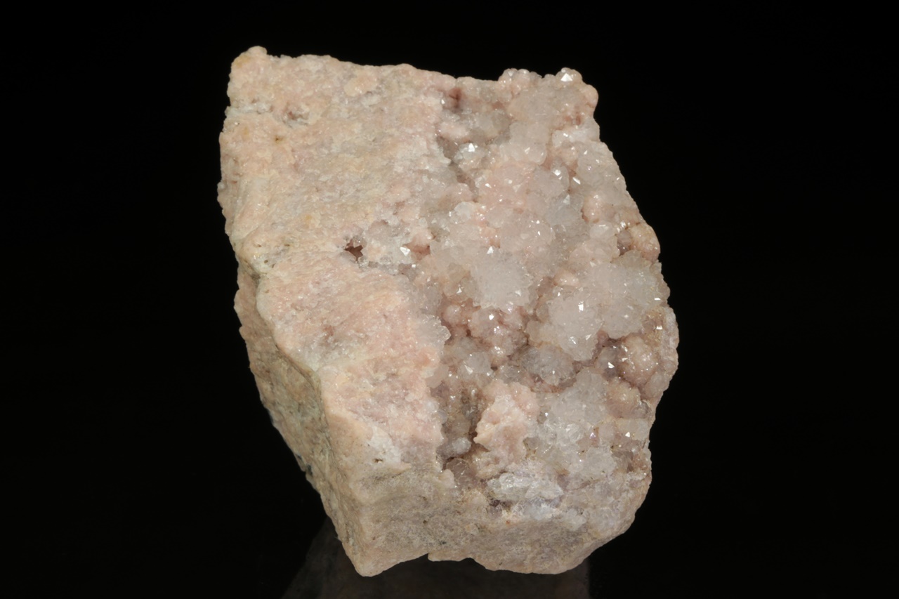 Historický vzorek masivního rodochrozitu zakončeného dutinou, kde jej přerůstají drobné krystaly křemene.