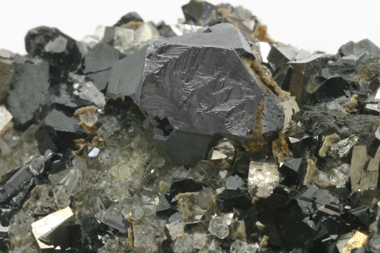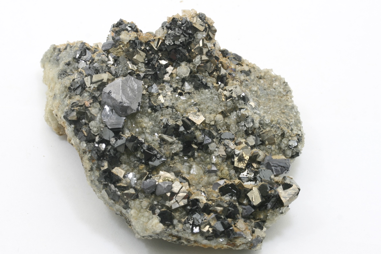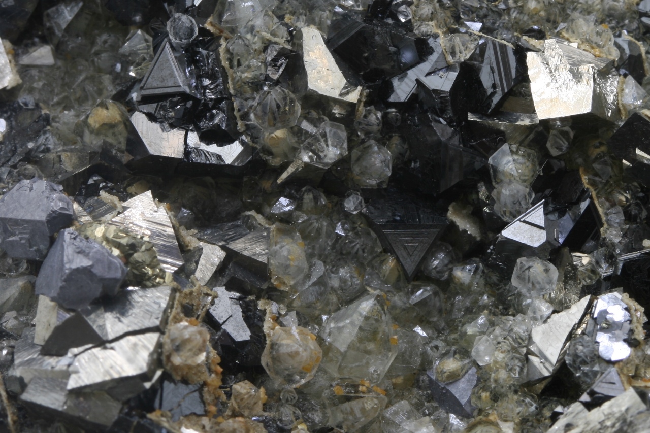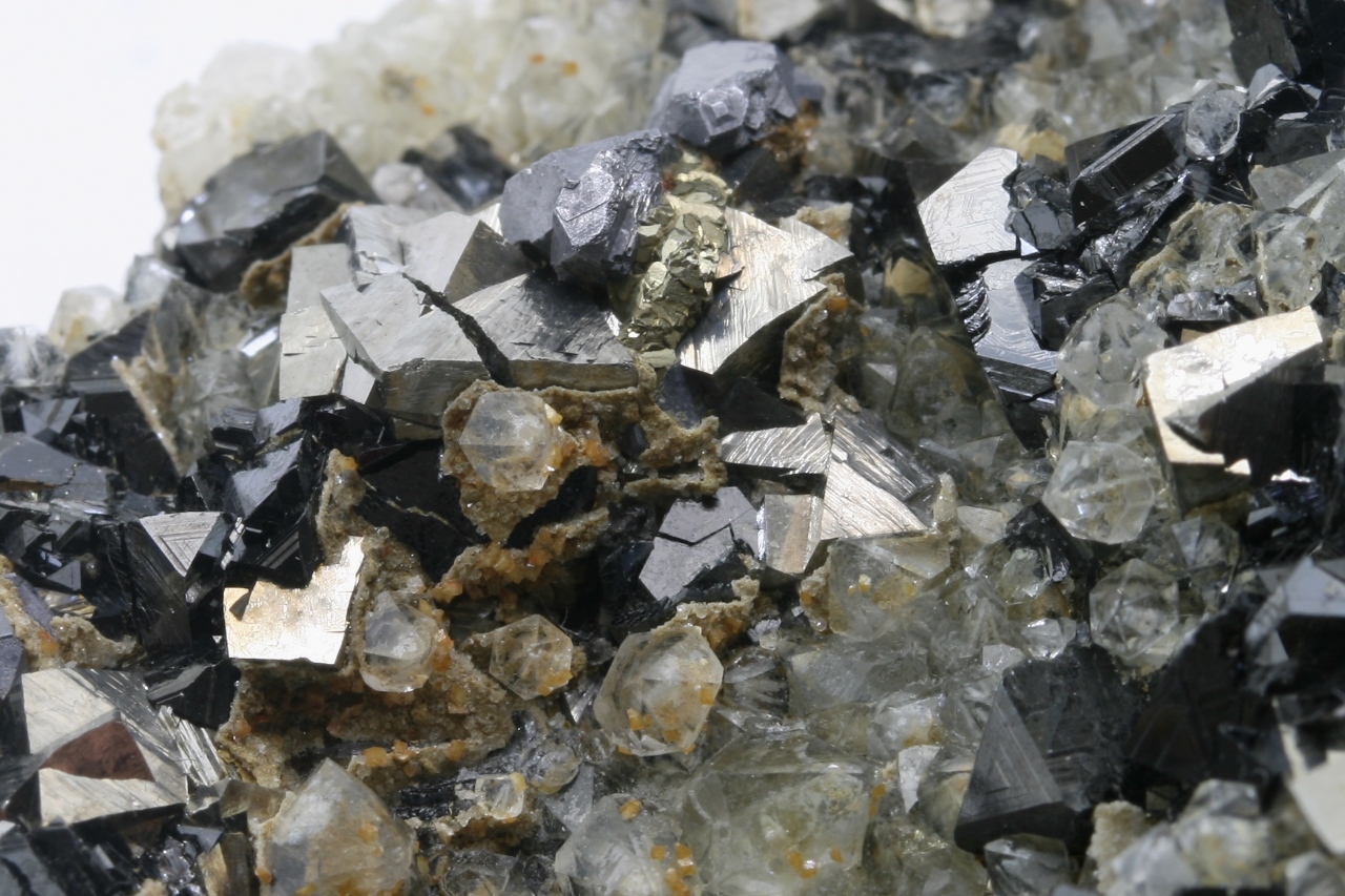 A druze of golden Arsenopyrit (largest 10 mm) with metallic gray Galenite (largest 12 mm) and black, shiny Sphalerite (largest 6 mm) not grown on quartz.