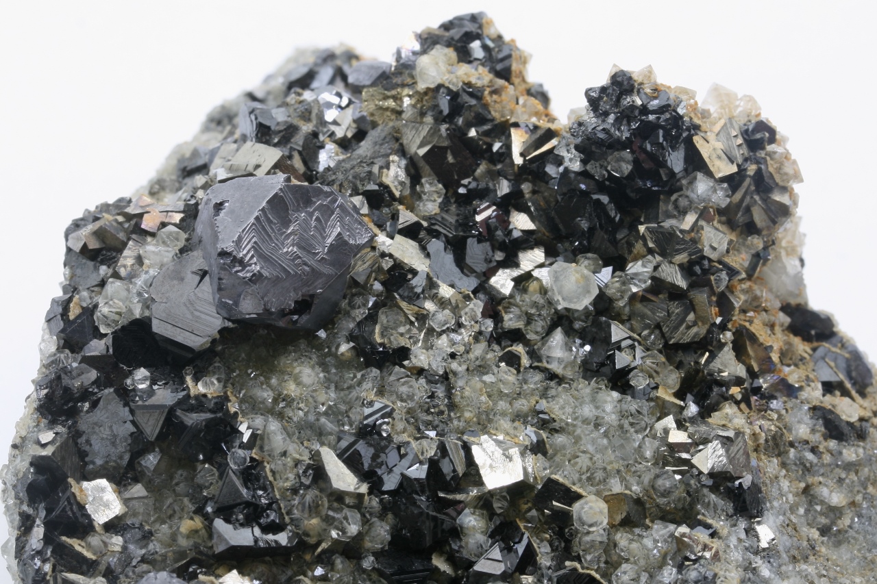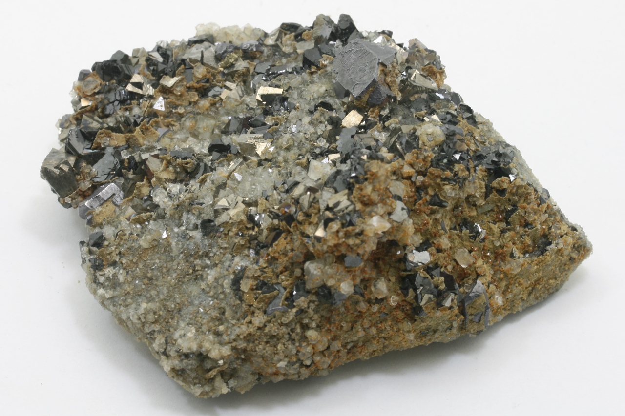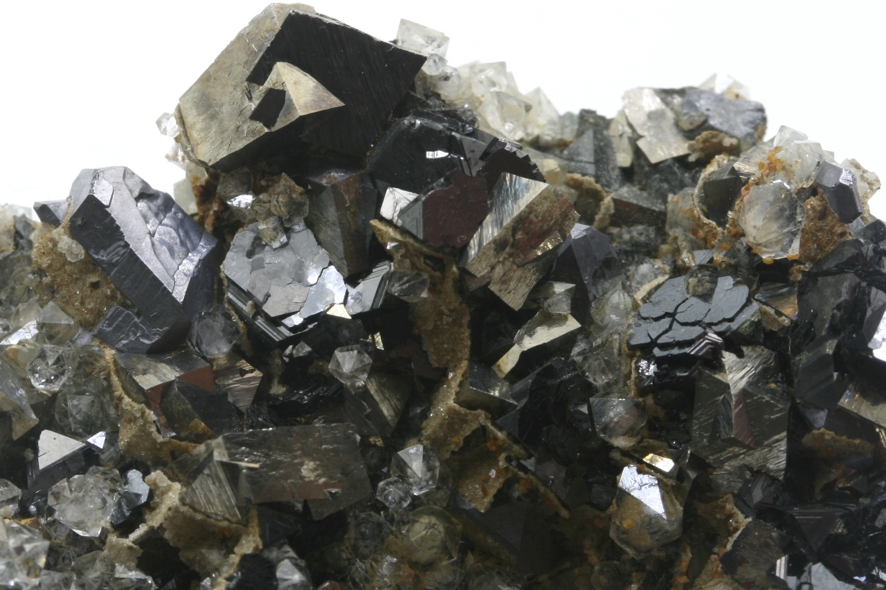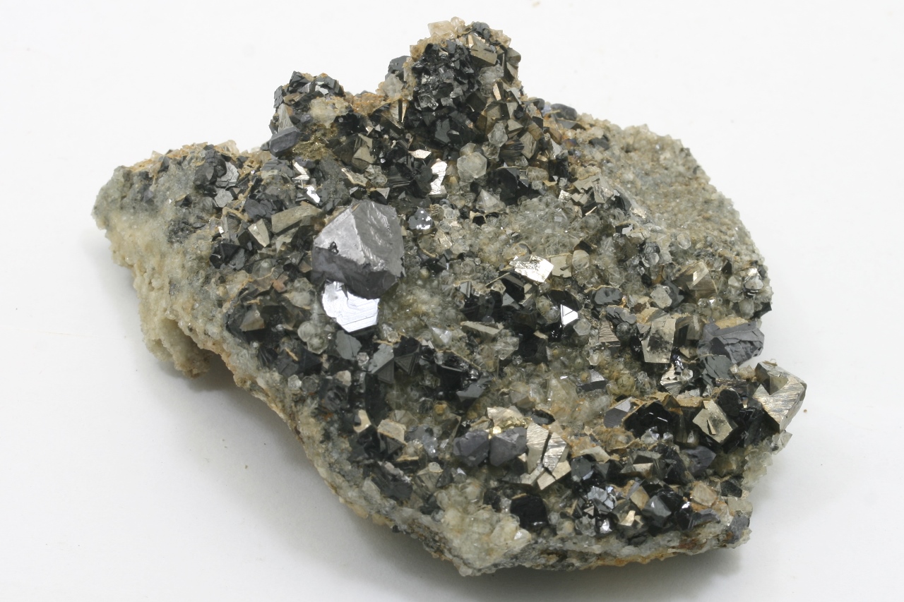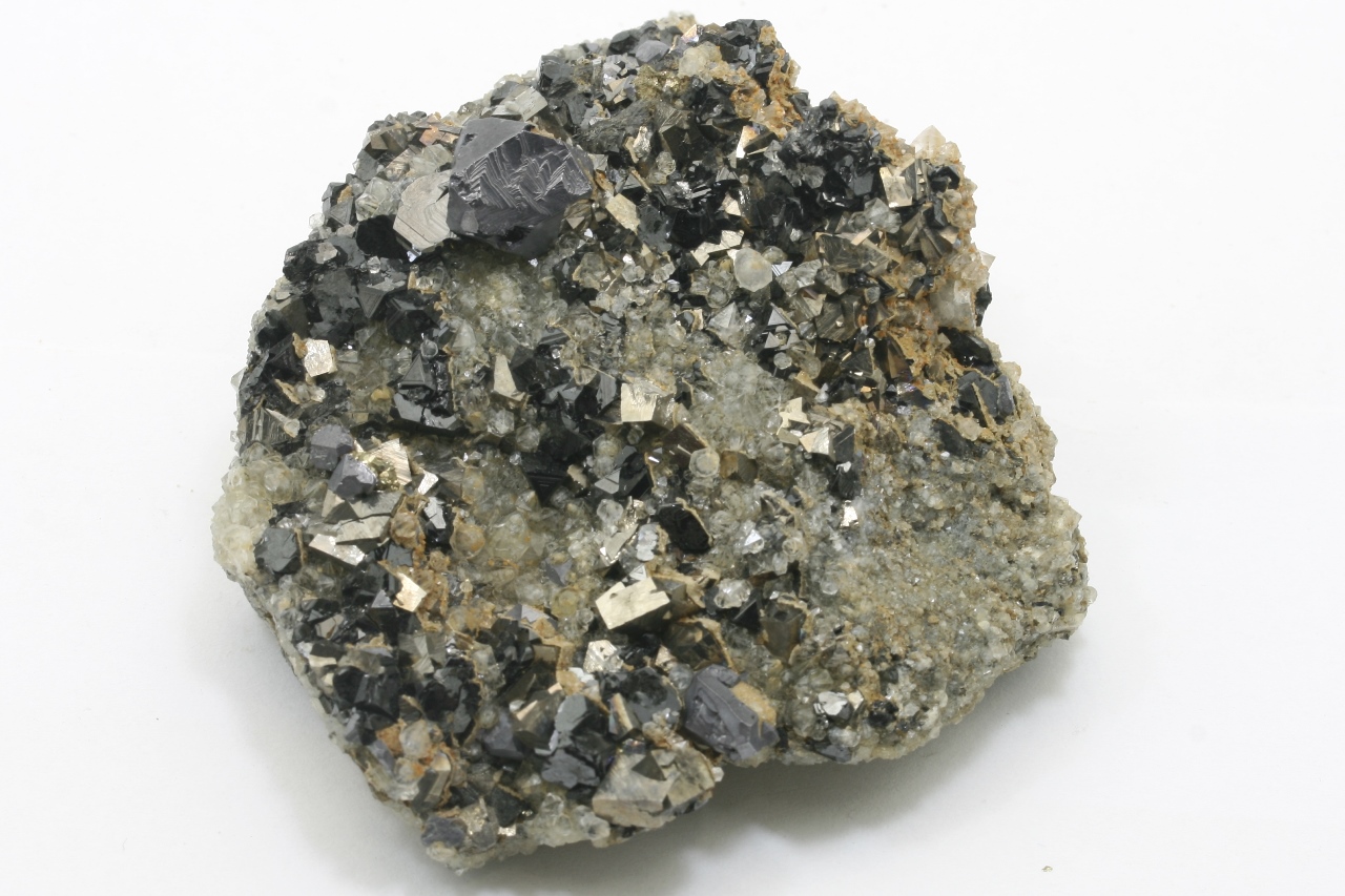 A druze of golden Arsenopyrit (largest 10 mm) with metallic gray Galenite (largest 12 mm) and black, shiny Sphalerite (largest 6 mm) not grown on quartz.