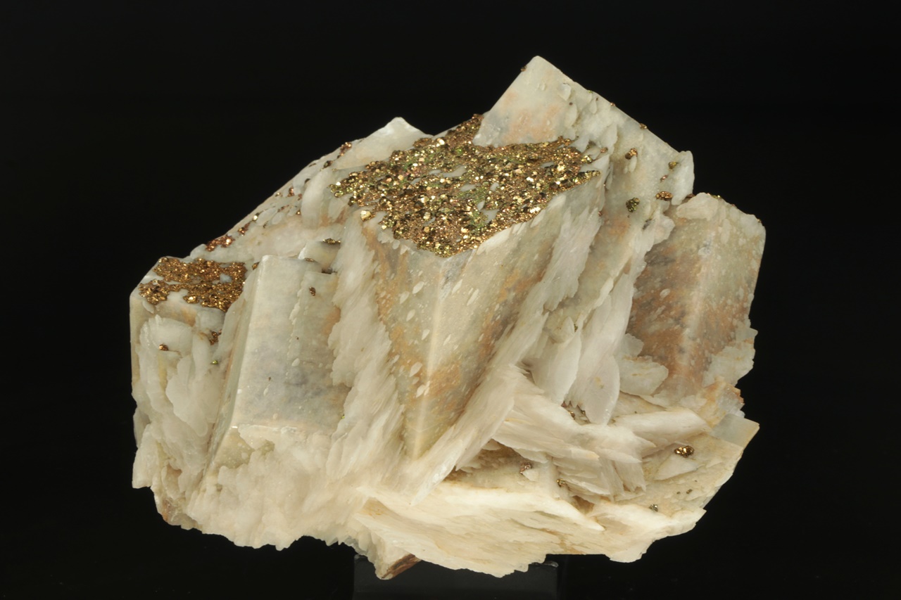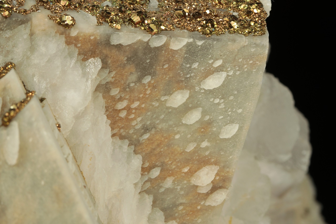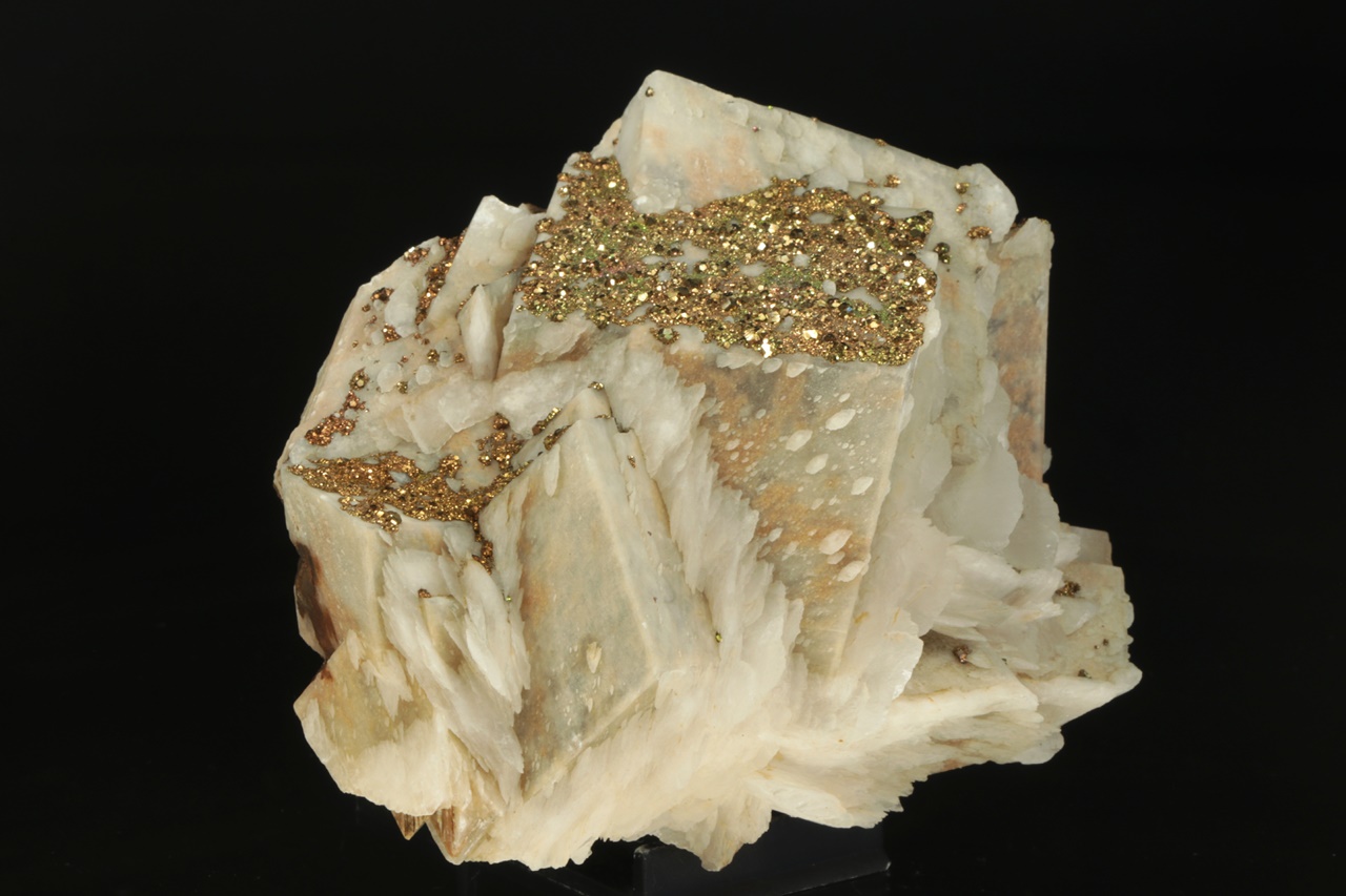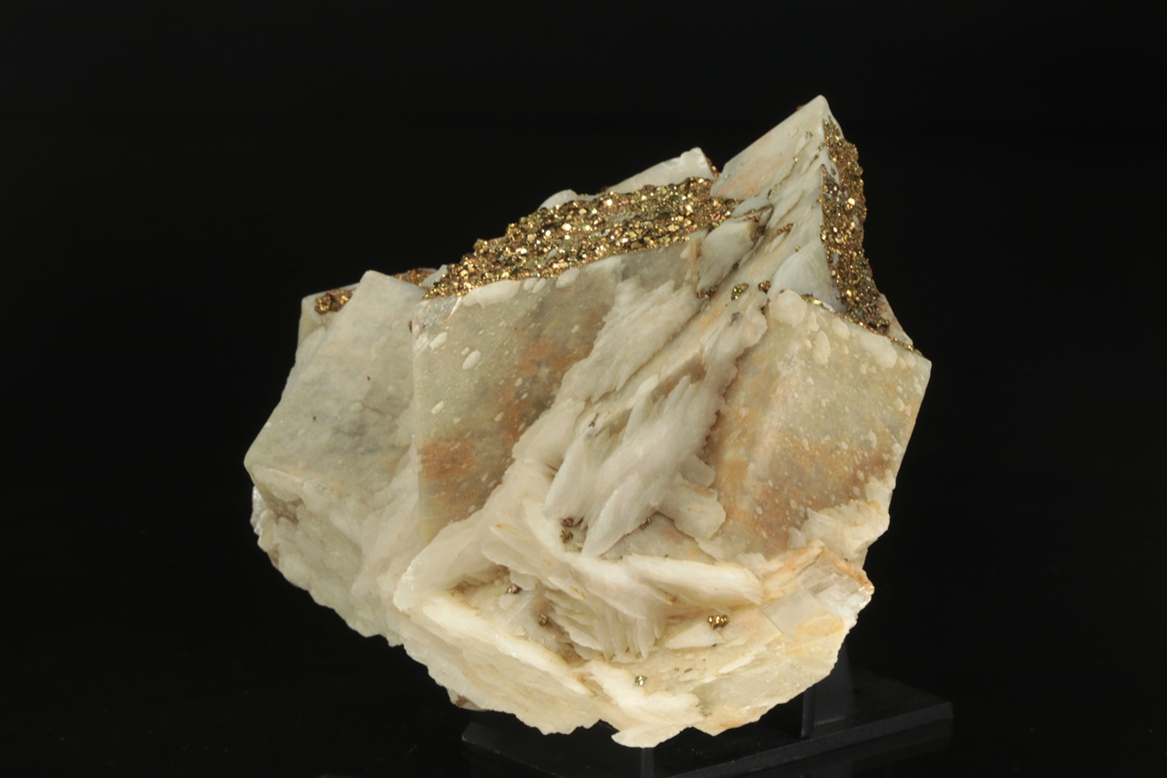 Nádherná ukázka velkých romboedrů kalcitu (až 8 cm) porostlých krystaly zlatého pyritu a druhou generací kalcitu tvořícího tenké destičky.