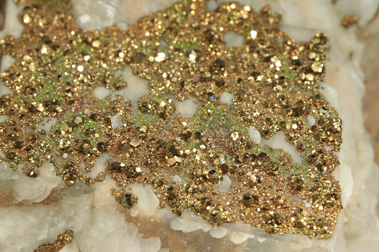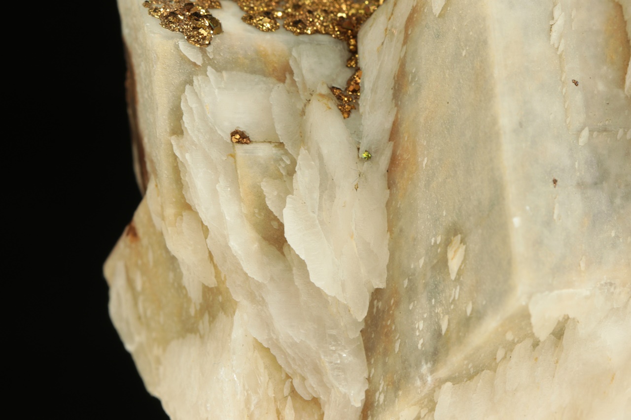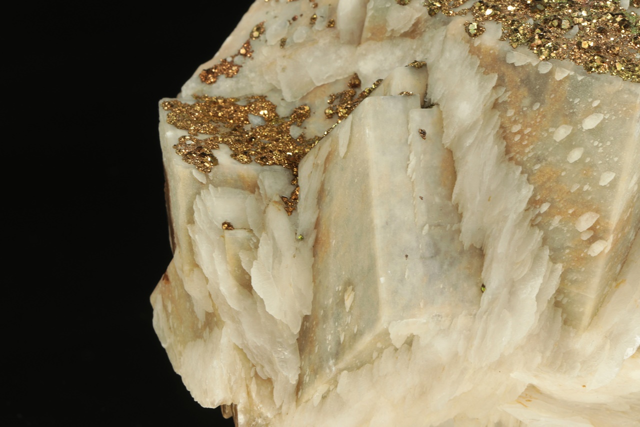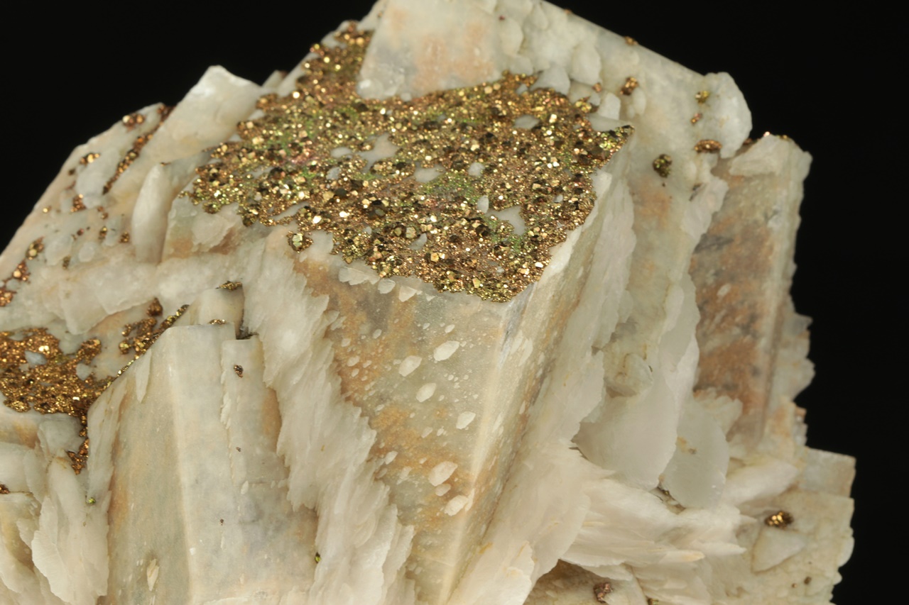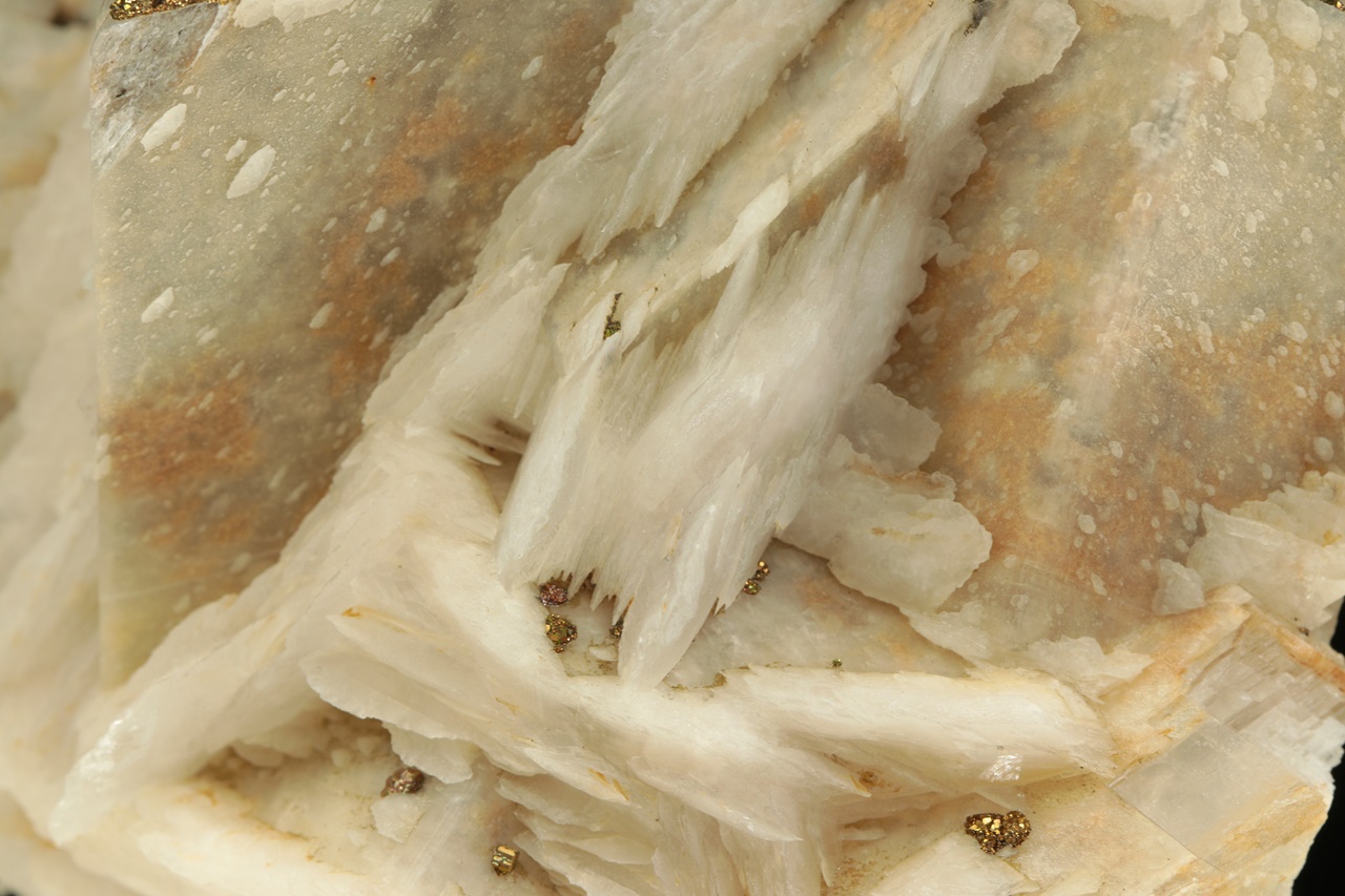 Nádherná ukázka velkých romboedrů kalcitu (až 8 cm) porostlých krystaly zlatého pyritu a druhou generací kalcitu tvořícího tenké destičky.