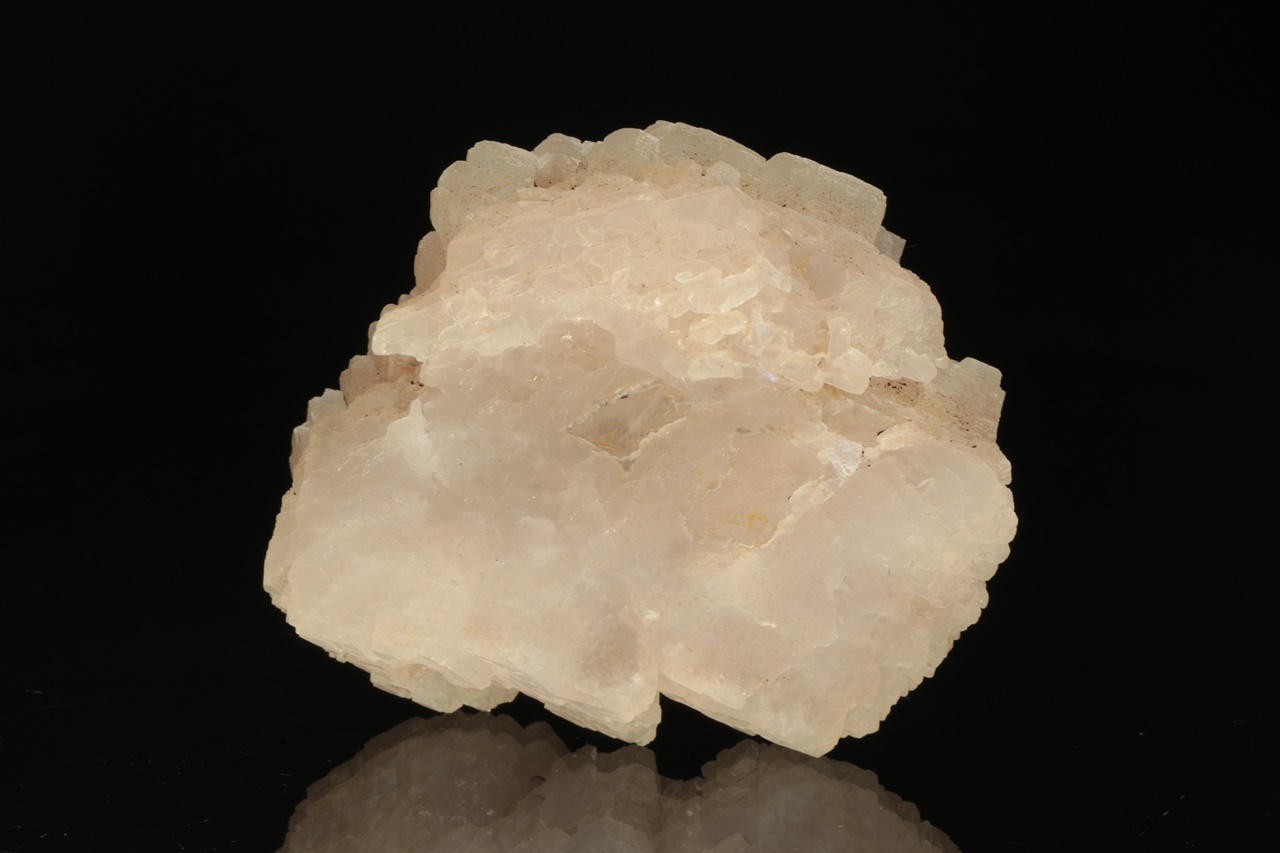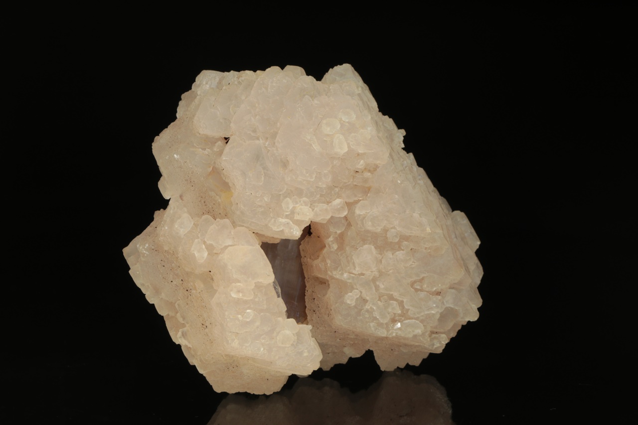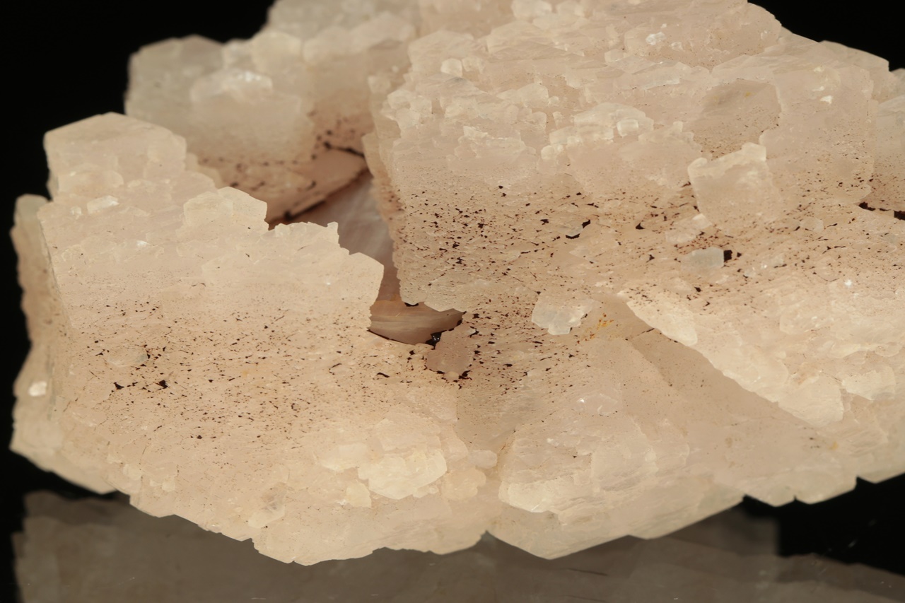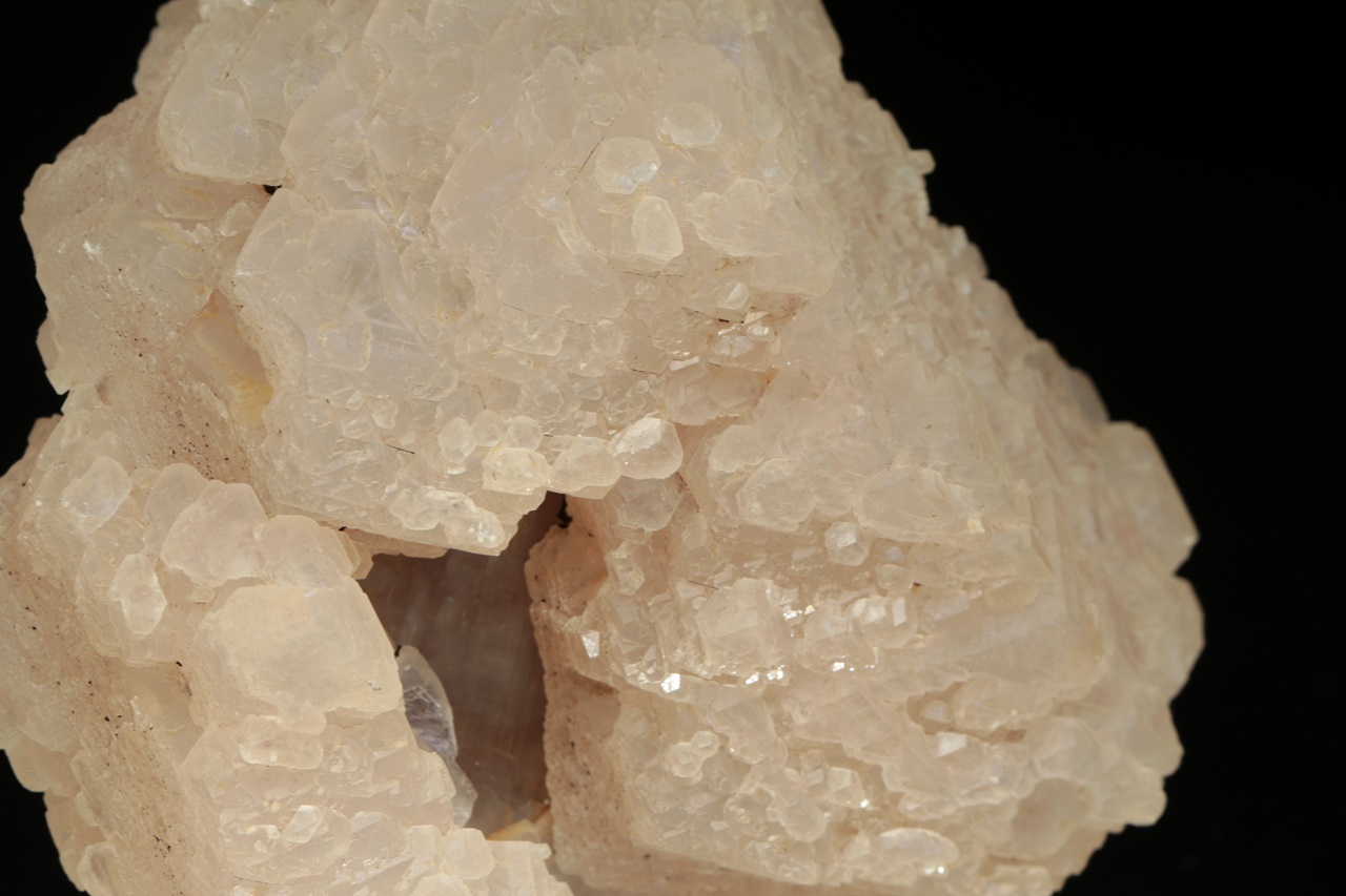 Hypoparalelní srostlice krystalů manganem bohatého kalcitu obrůstající starší kalcitový krystal. Vzorek je ze všech stran ukončený krystalovými plochami.