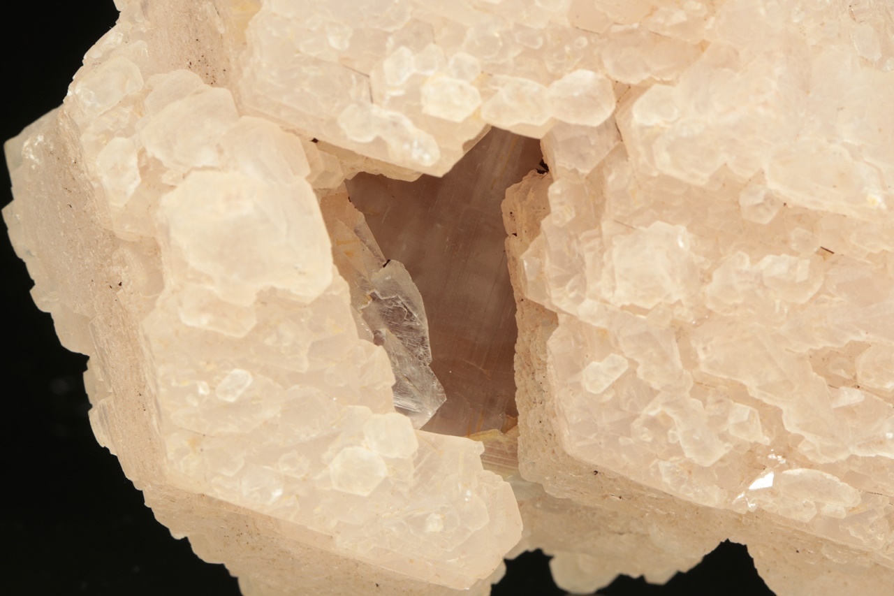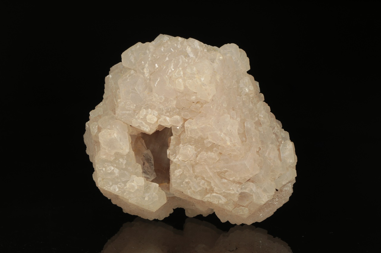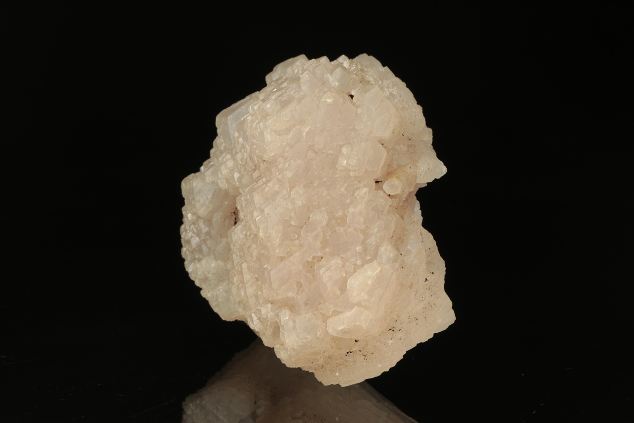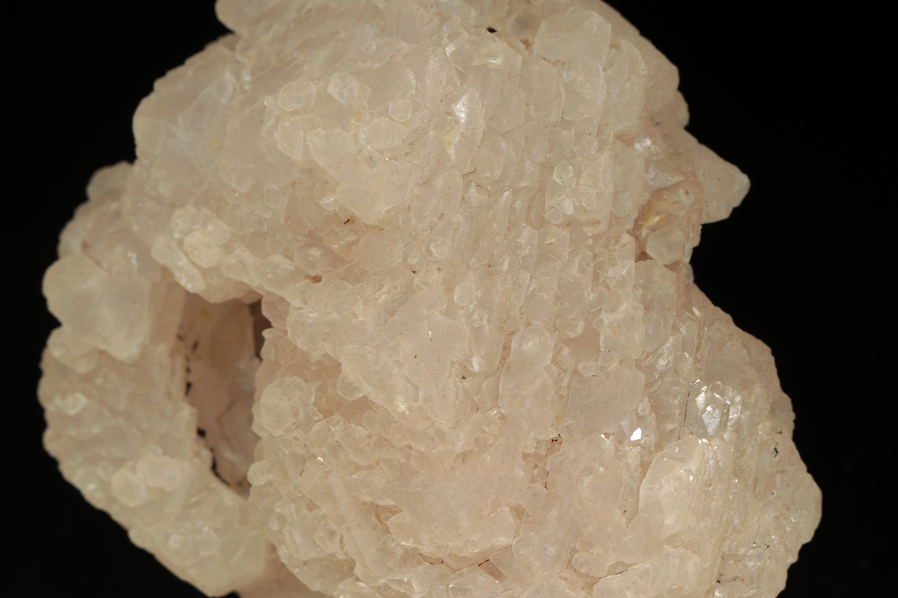 Hypoparalelní srostlice krystalů manganem bohatého kalcitu obrůstající starší kalcitový krystal. Vzorek je ze všech stran ukončený krystalovými plochami.