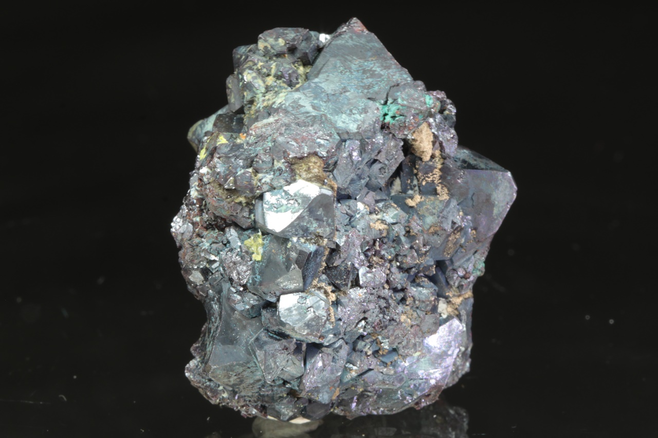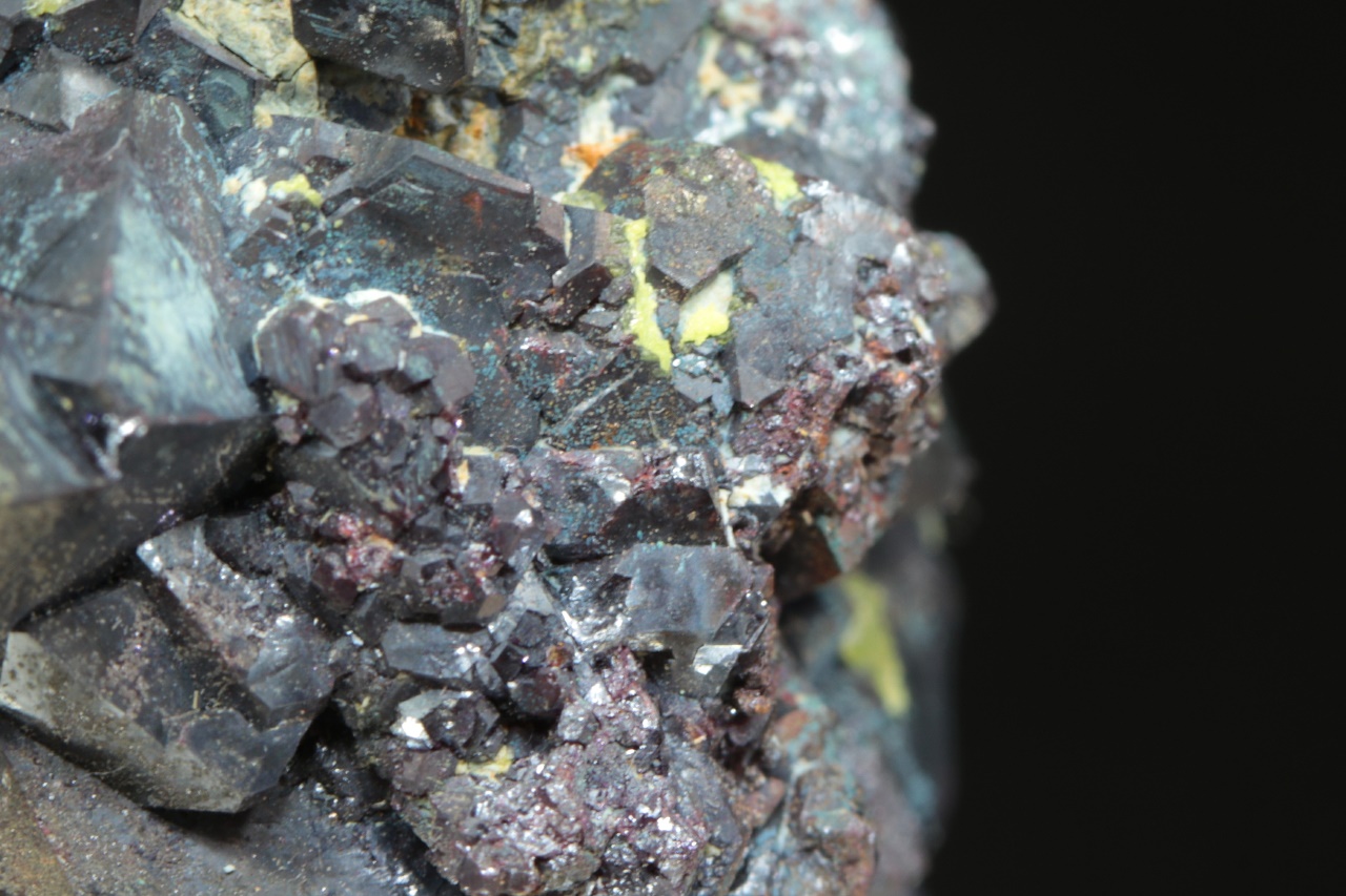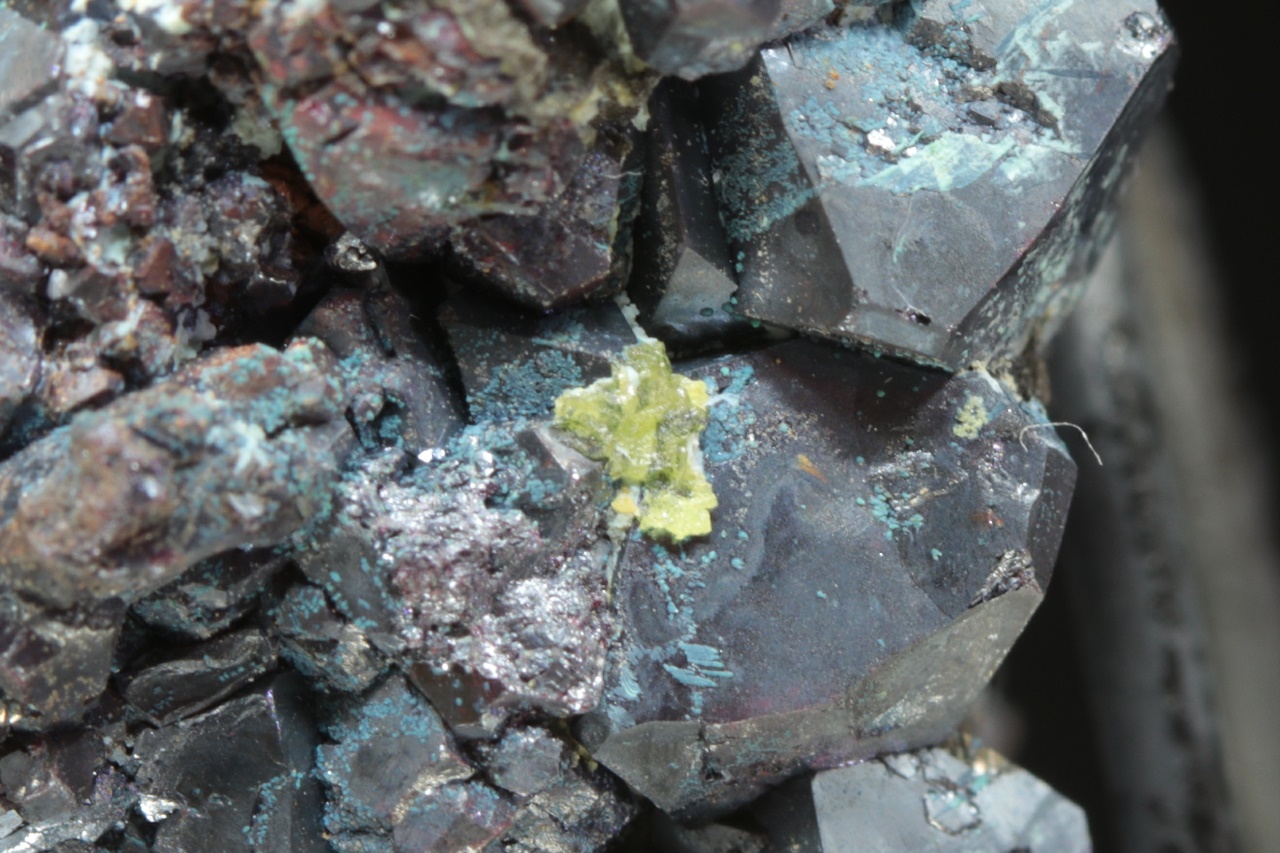 A druse of metallic lustrous octahedrons of cuprite with bushes of white silver. Onto the cuprite then grow yellow crystals of the very rare copper and silver iodide – miersite described only at a few world locations. The largest cuprite crystal is 1 cm large.