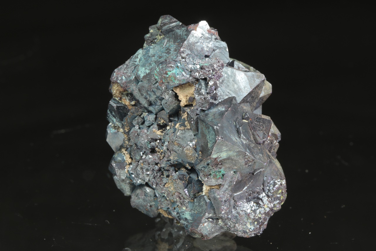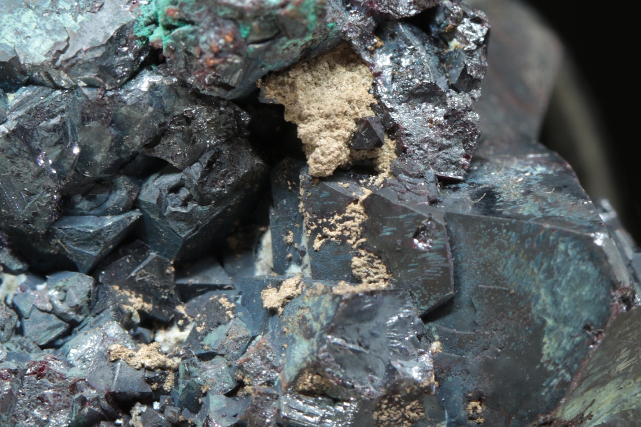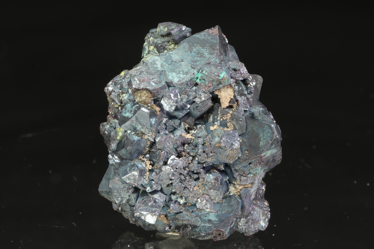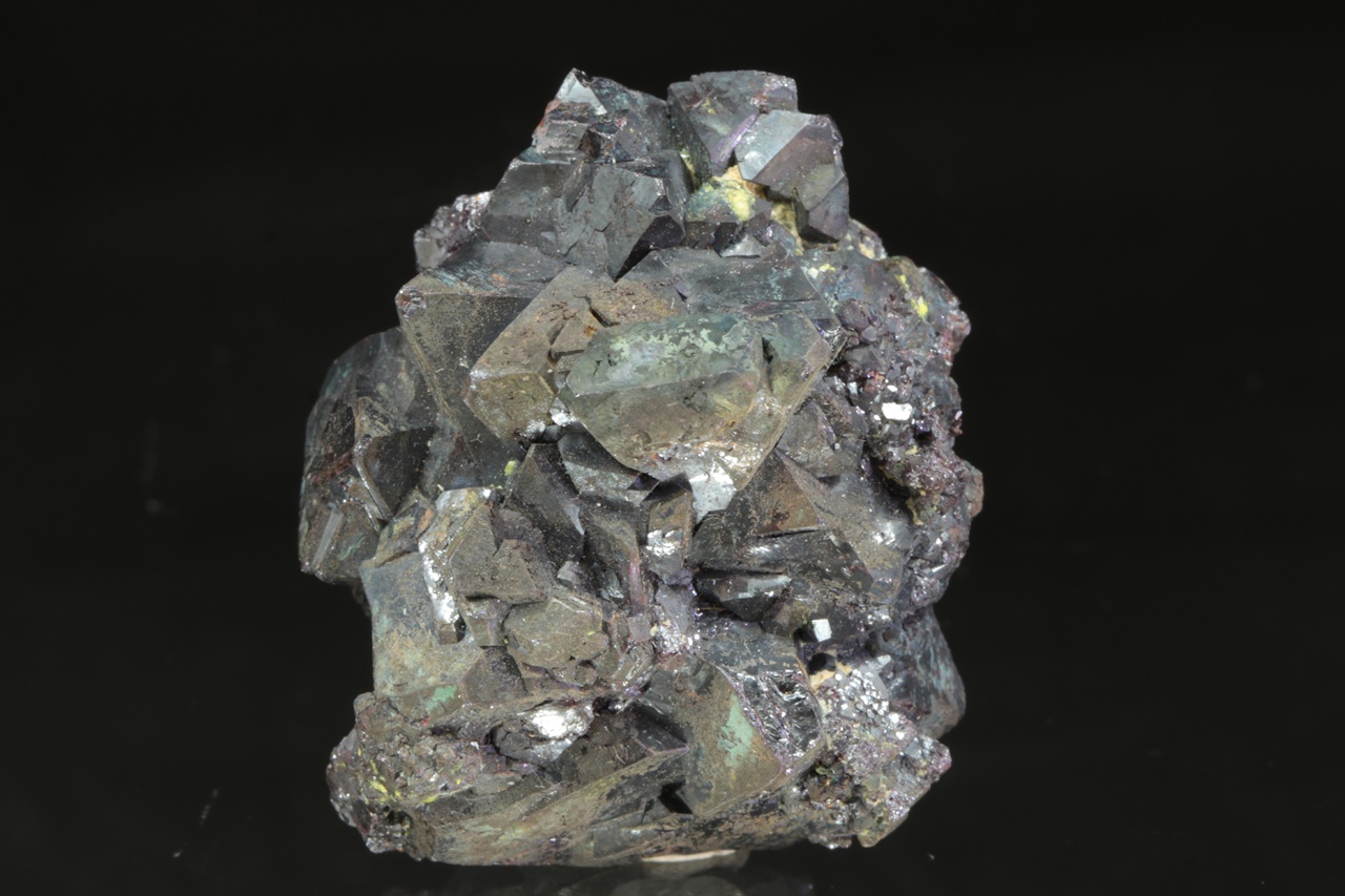 A druse of metallic lustrous octahedrons of cuprite with bushes of white silver. Onto the cuprite then grow yellow crystals of the very rare copper and silver iodide – miersite described only at a few world locations. The largest cuprite crystal is 1 cm large.