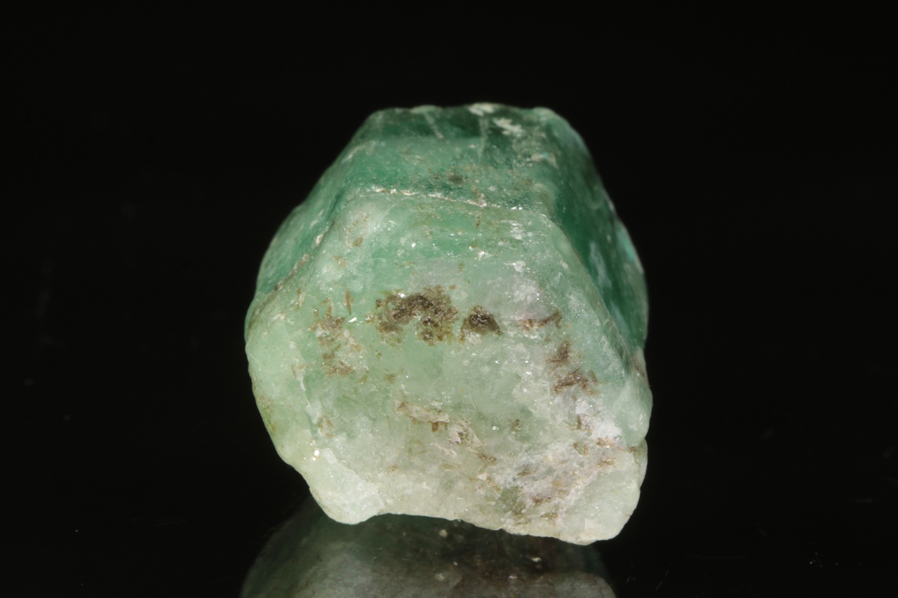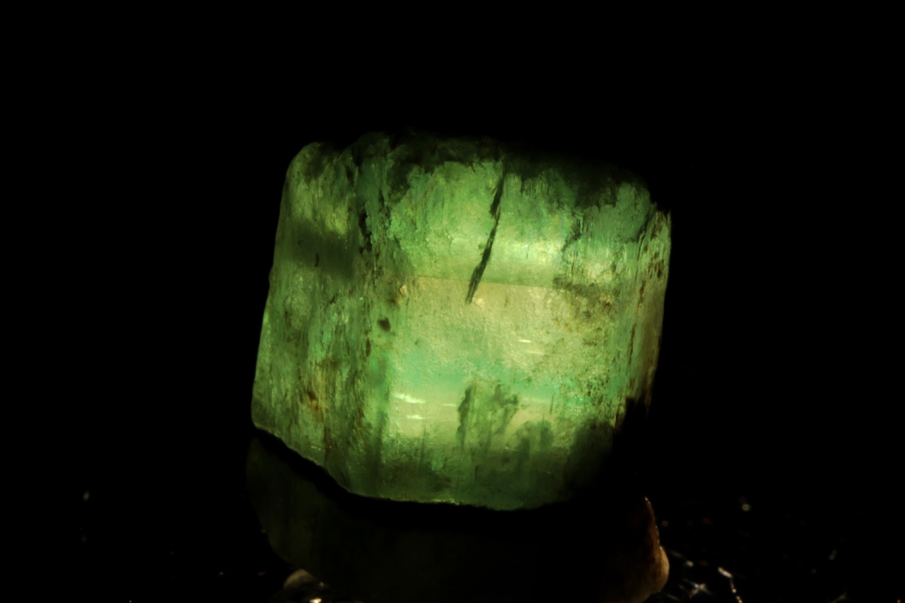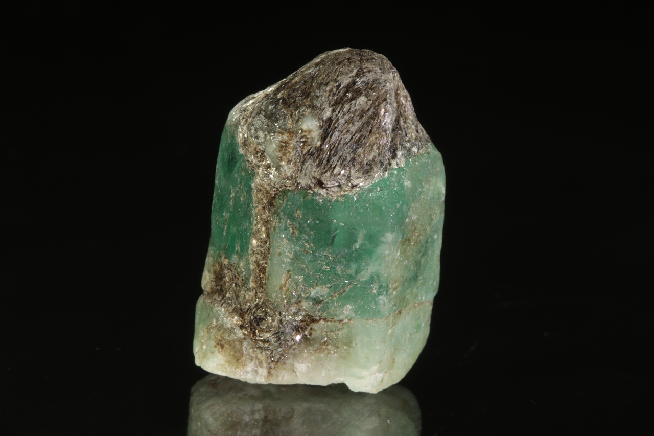 Dva centimetry velký krystal zeleného průsvitného smaragdu s výraznou zonálností. Krystal je z obou stran ukončený bází.