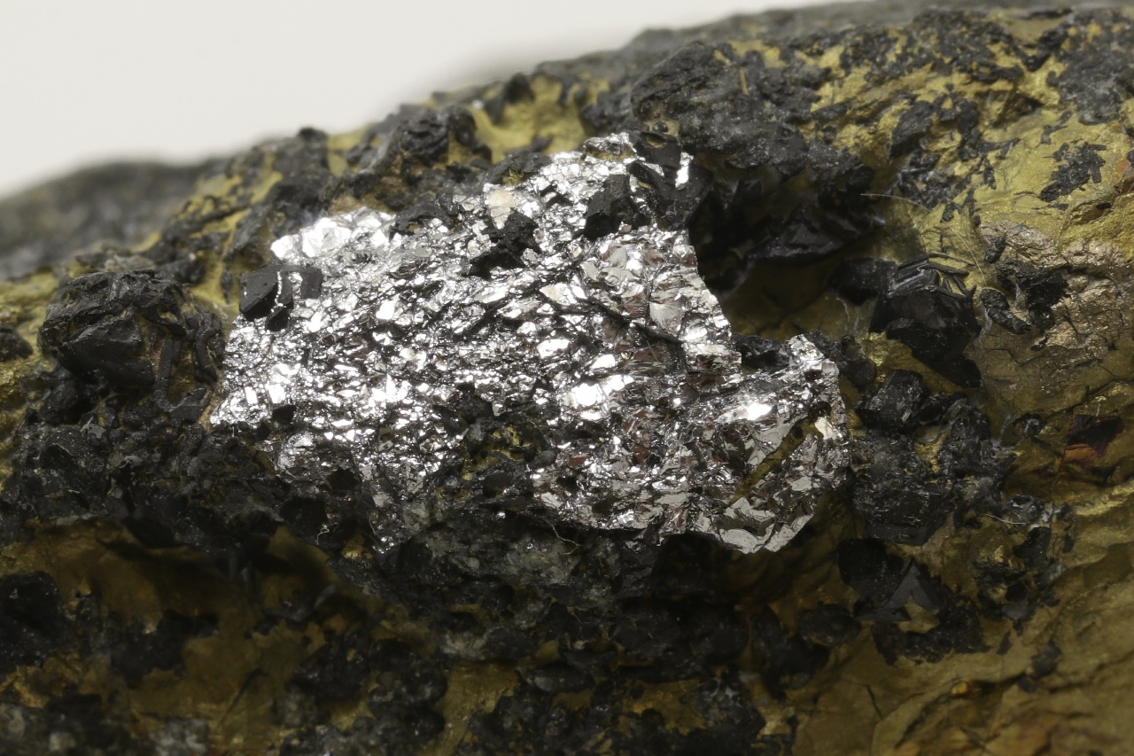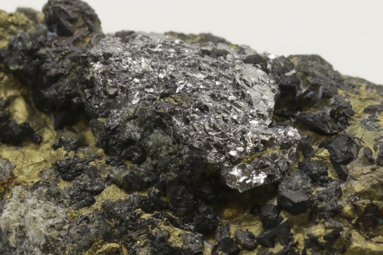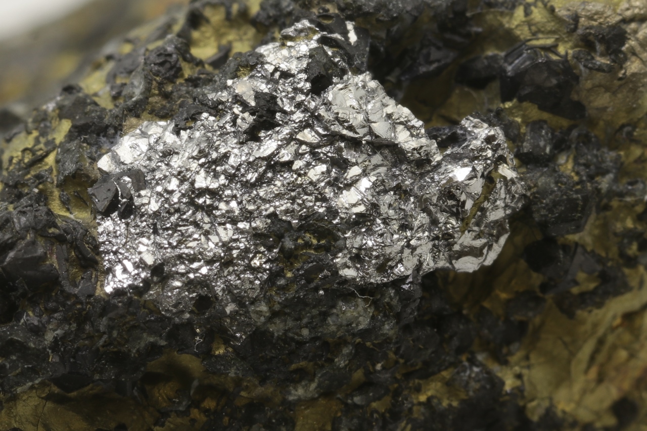 Large, silver-shiny, surface-bruised crystal (11 mm in size) of platinum arsenide in yellow Chalcopyrite with black Magnetites.