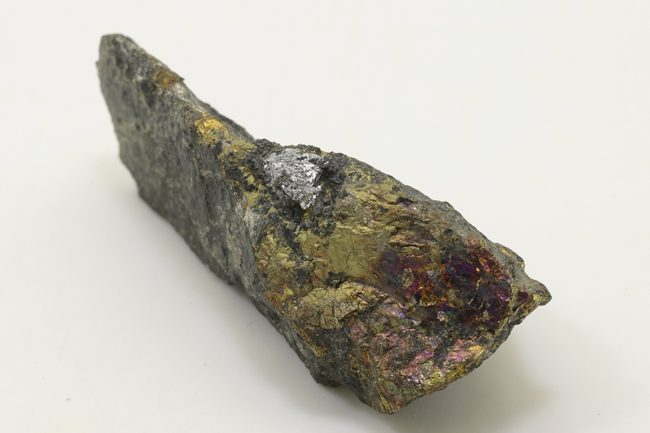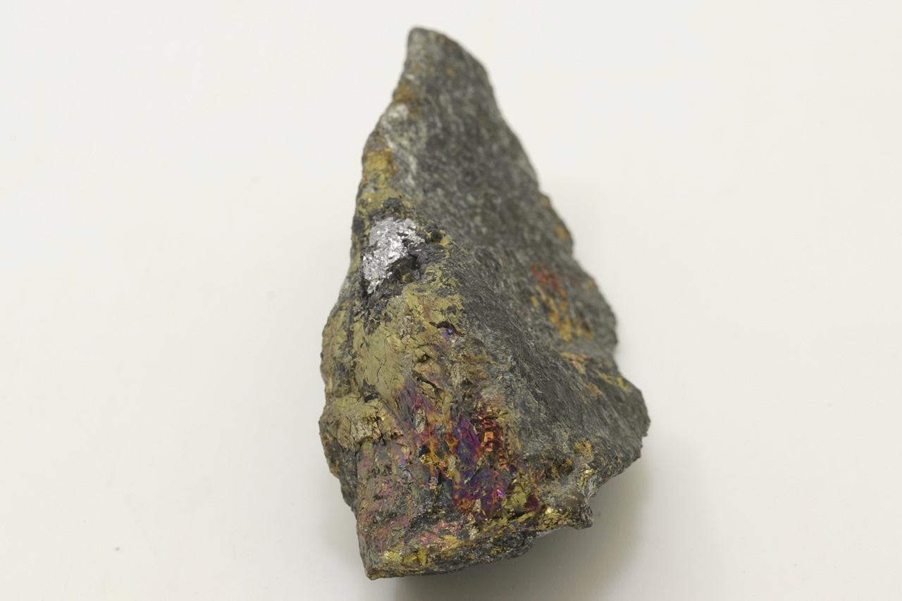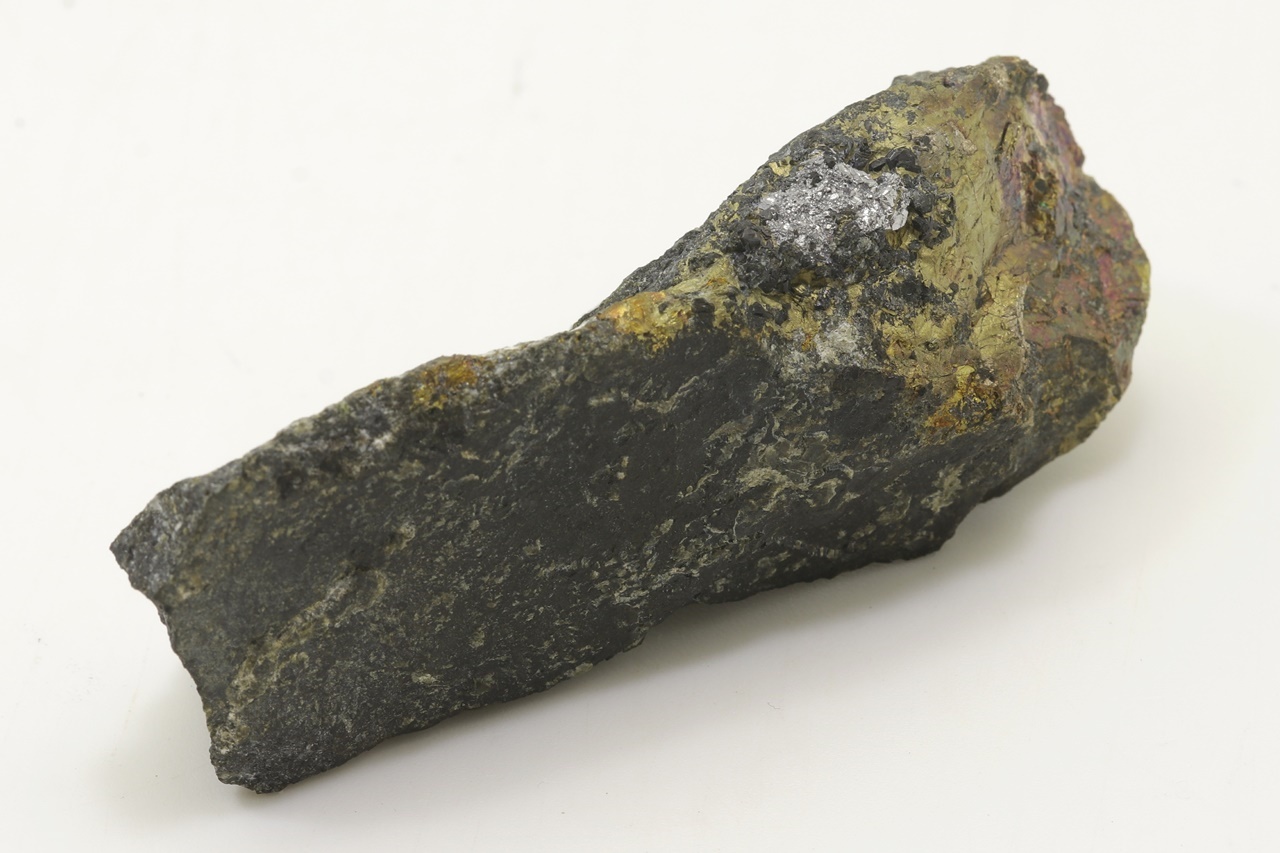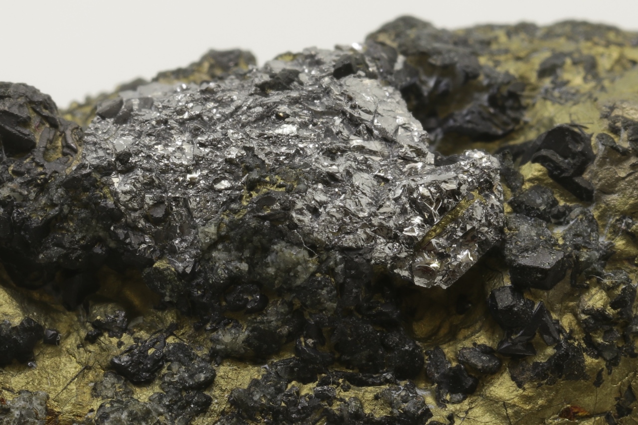 Large, silver-shiny, surface-bruised crystal (11 mm in size) of platinum arsenide in yellow Chalcopyrite with black Magnetites.