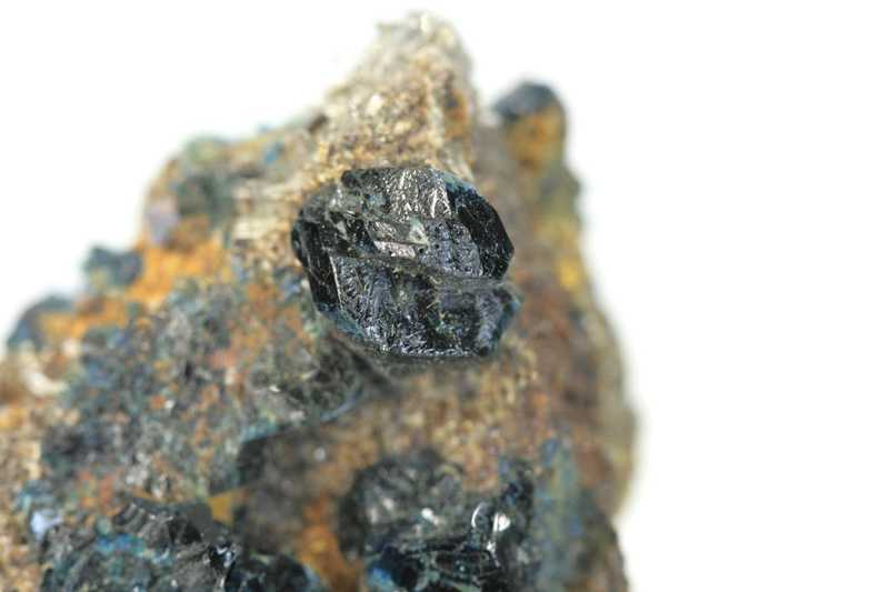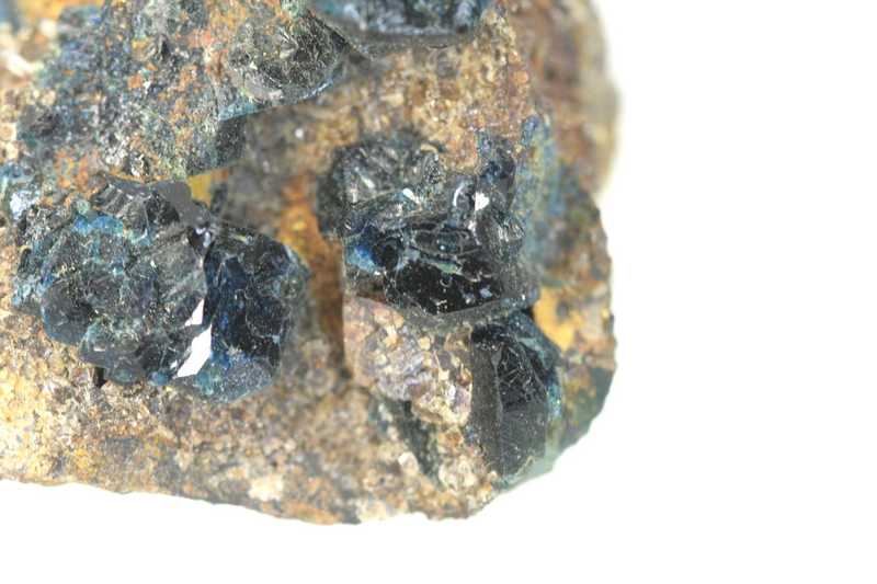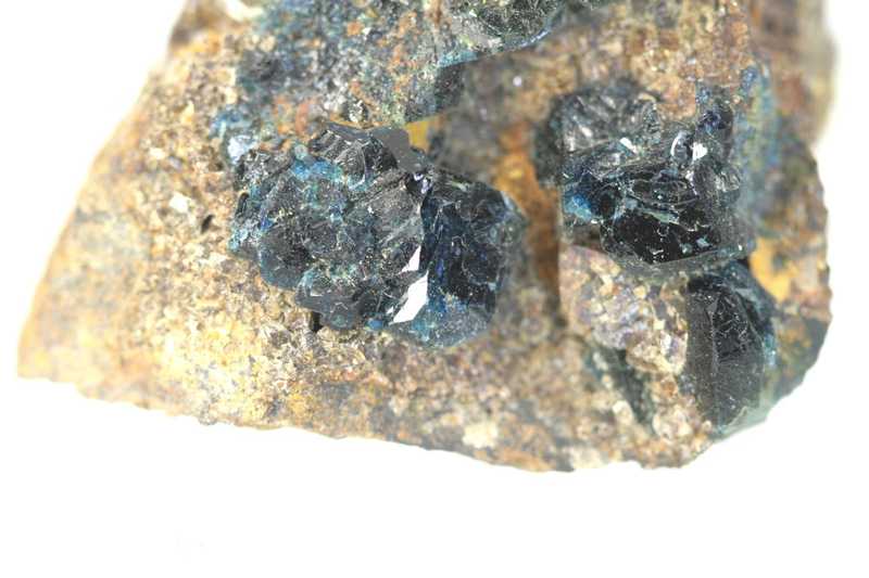 A very nice specimen of beautifully colored up to 1 cm large crystals of the rare mineral lazulite from Canada. An attractive specimen of dark blue to nearly black lazulite crystals grown on a small matrix; there are also two lazulite crystals on the other side of the specimen.