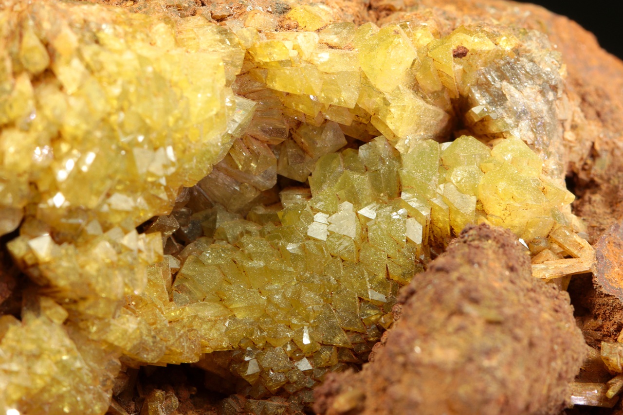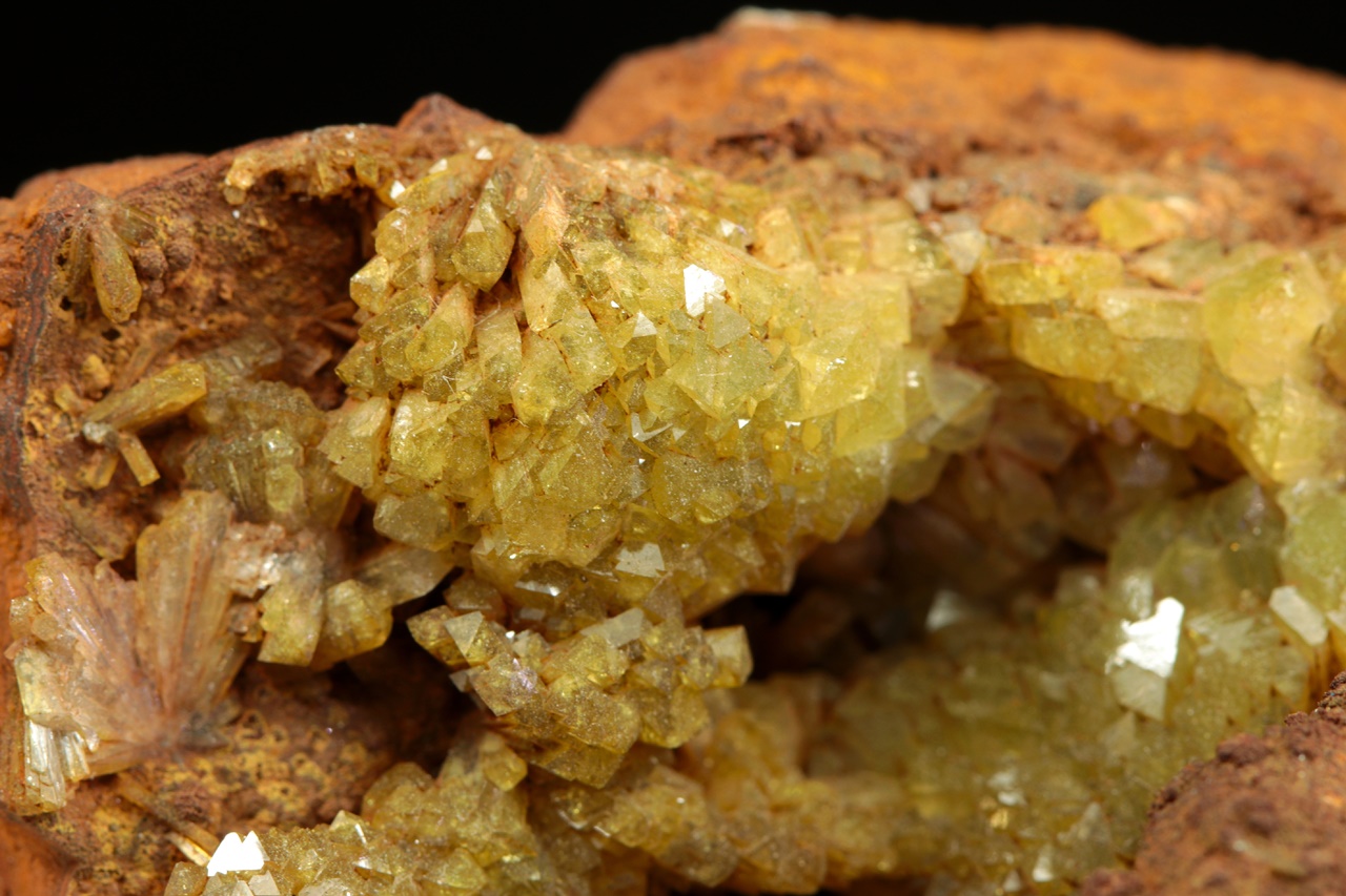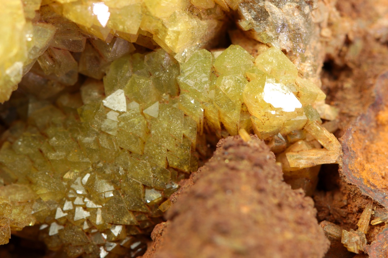Žluto zelené krystaly arsenátu zinku – adamitu místy tvořící až radiální agregáty.