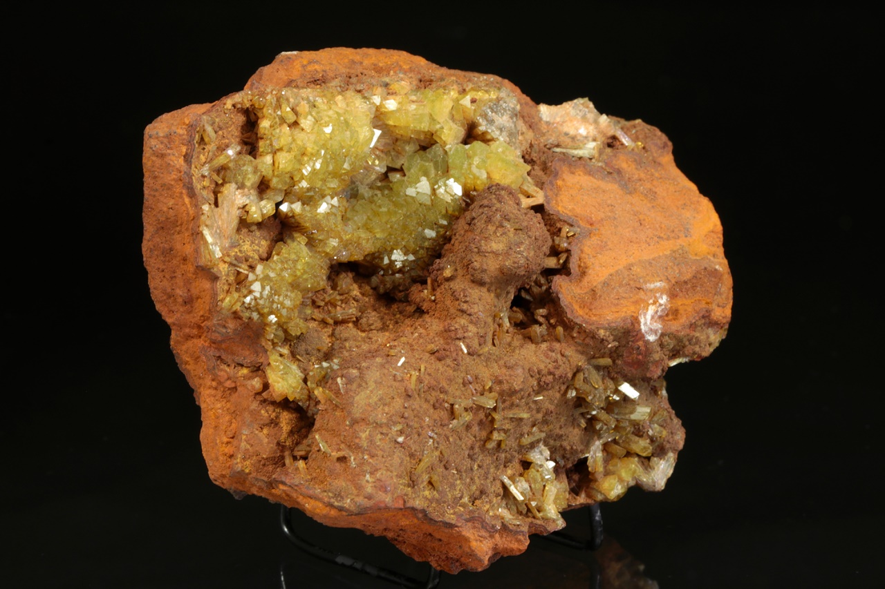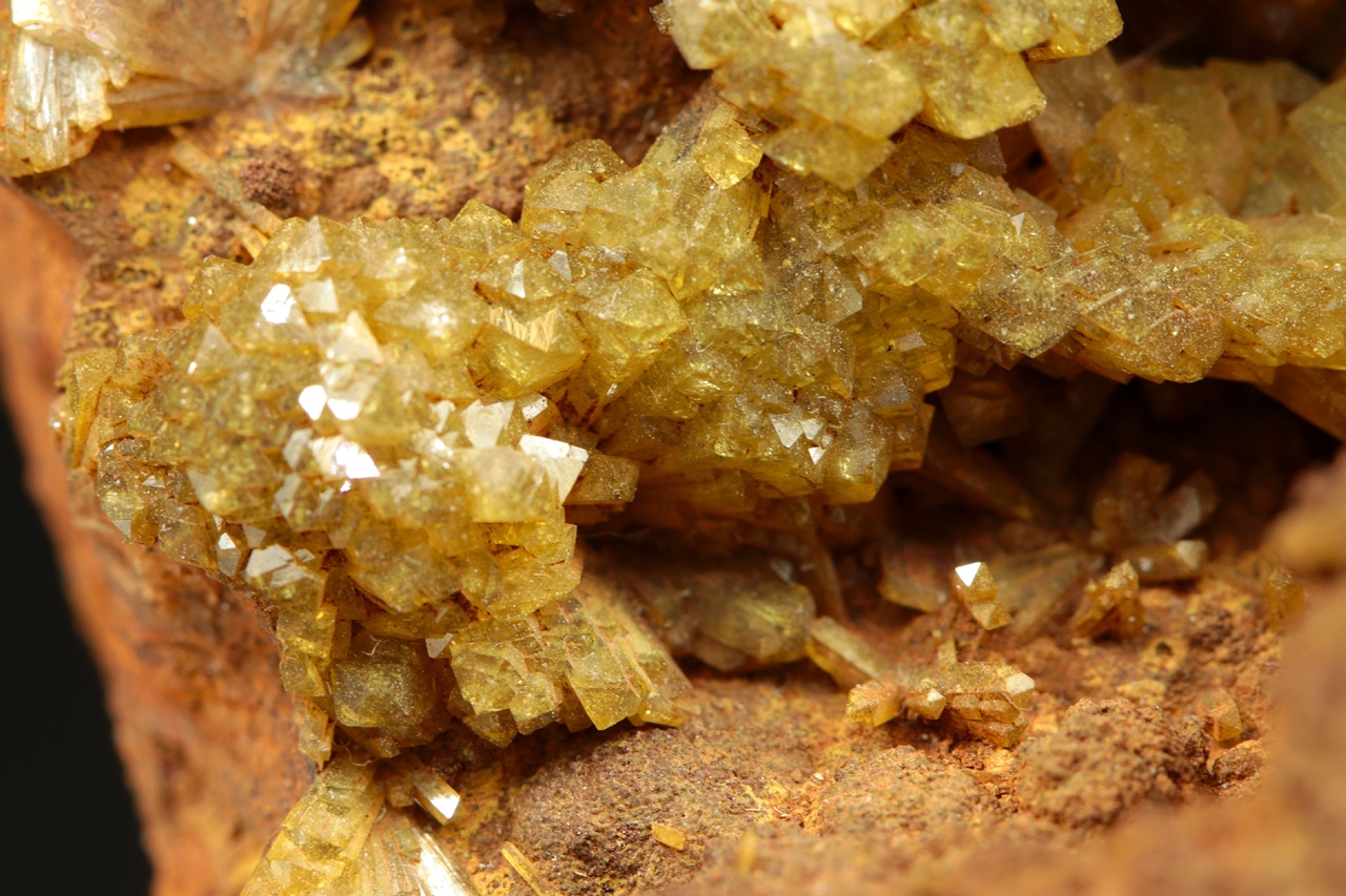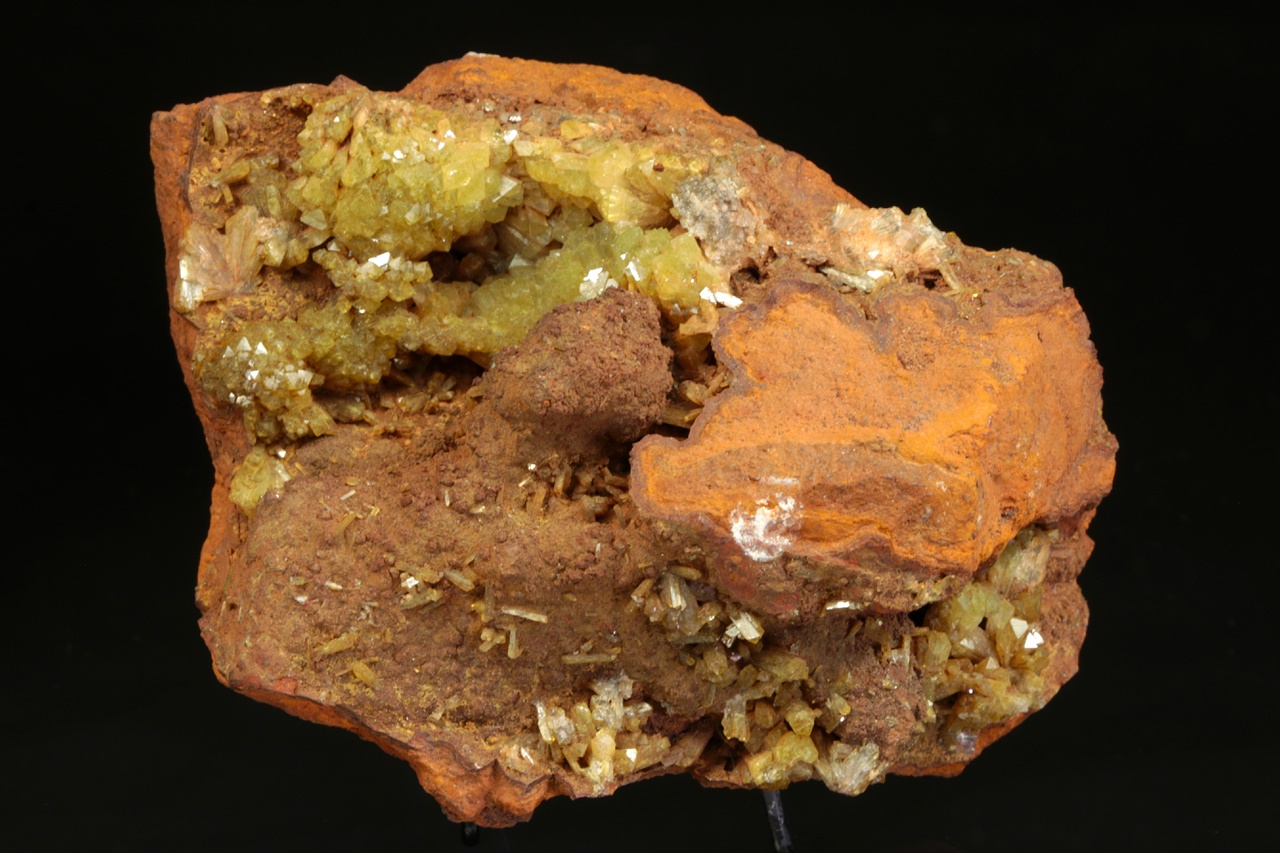 Žluto zelené krystaly arsenátu zinku – adamitu místy tvořící až radiální agregáty.