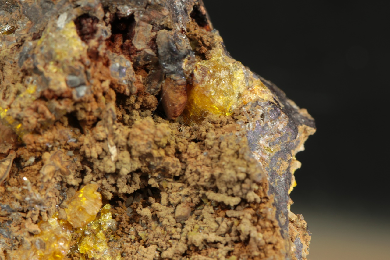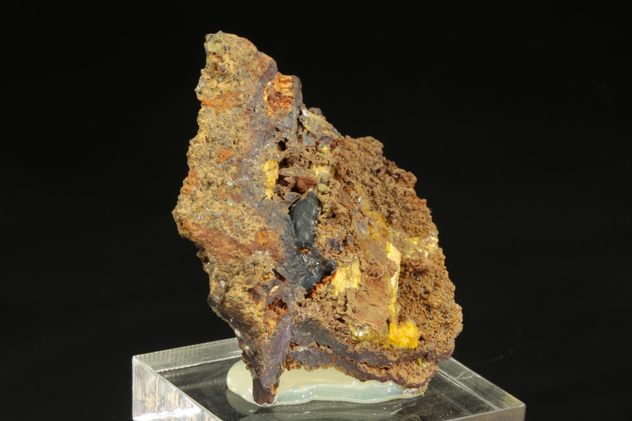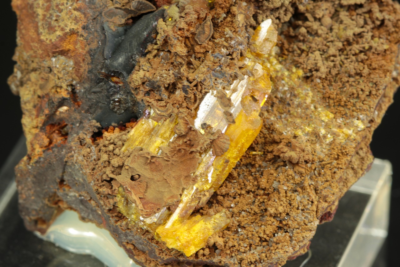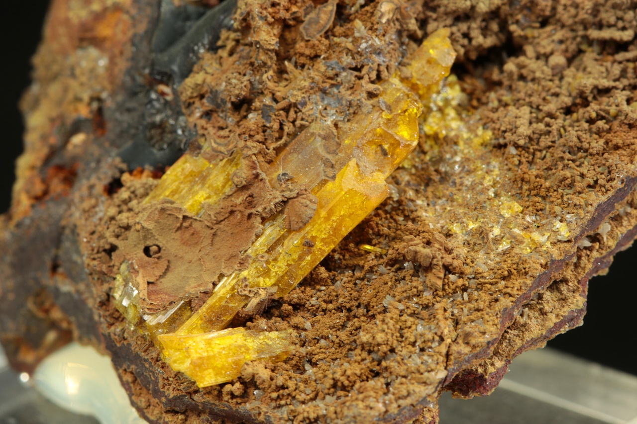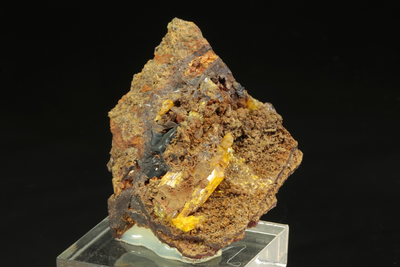 Sample of hydrated zinc arsenate – legrandite from Mexico. Sample of yellow crystals of rare legrandite from Mapimi, Mexico, measuring up to 25 mm.