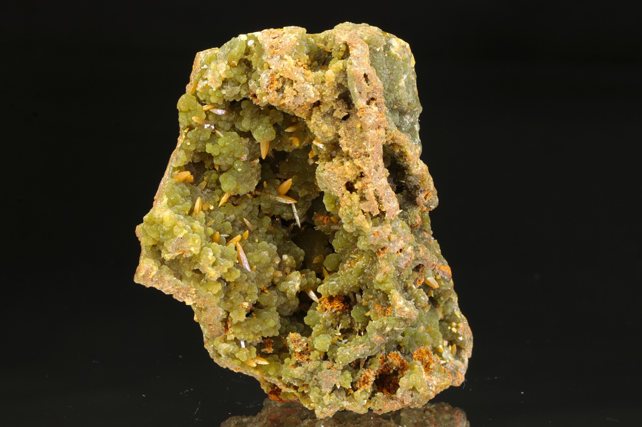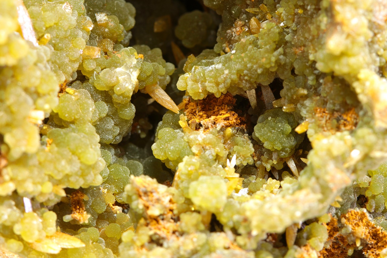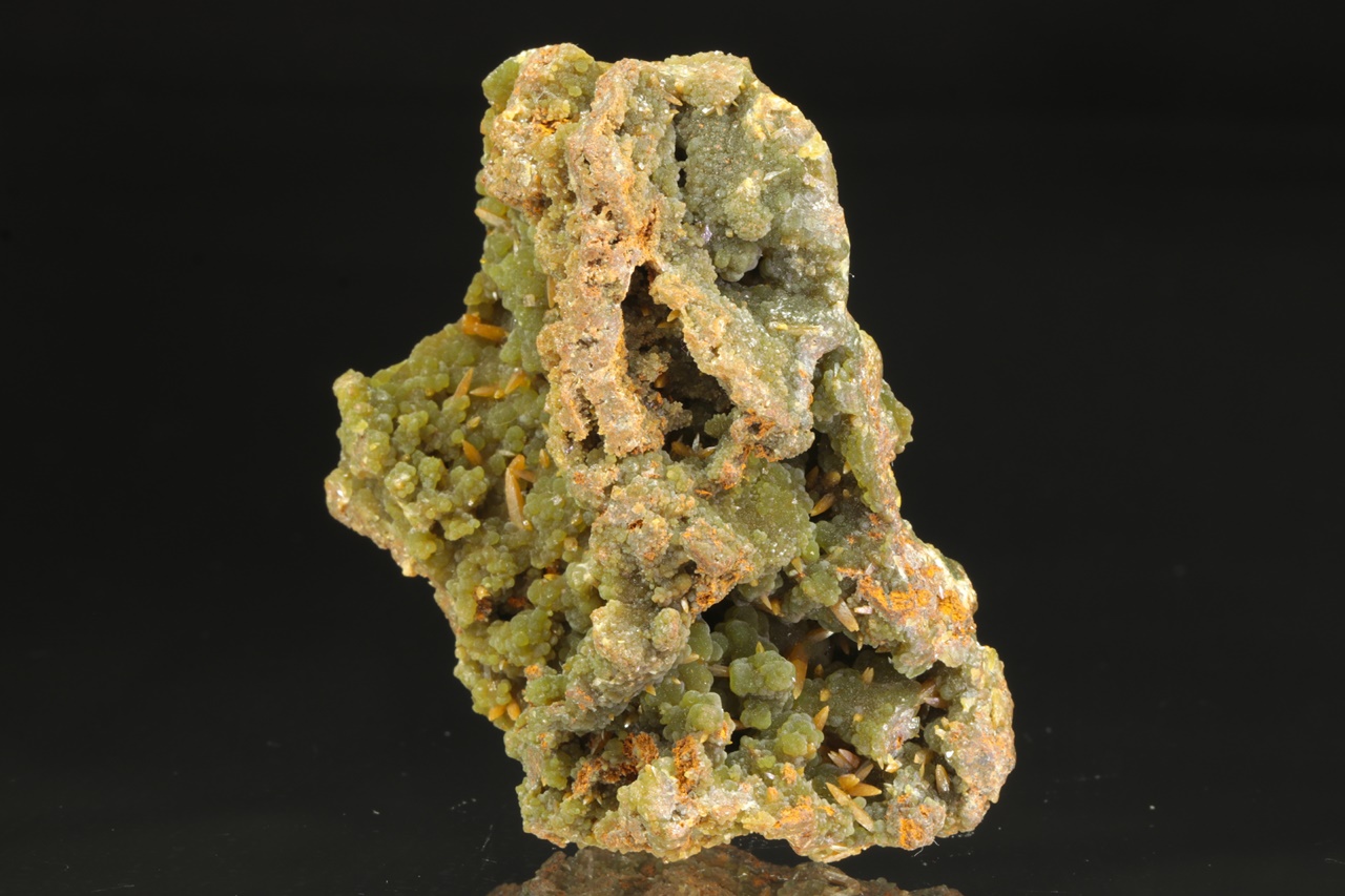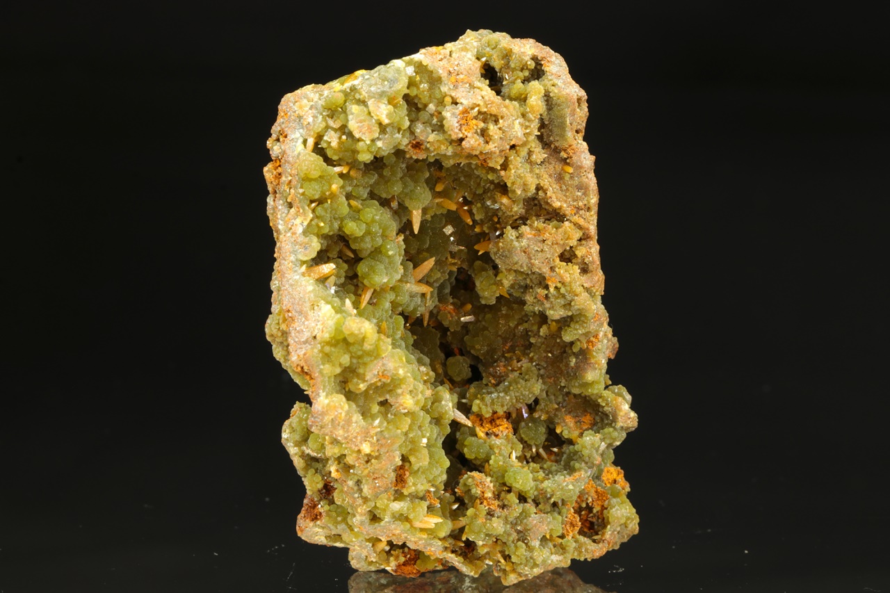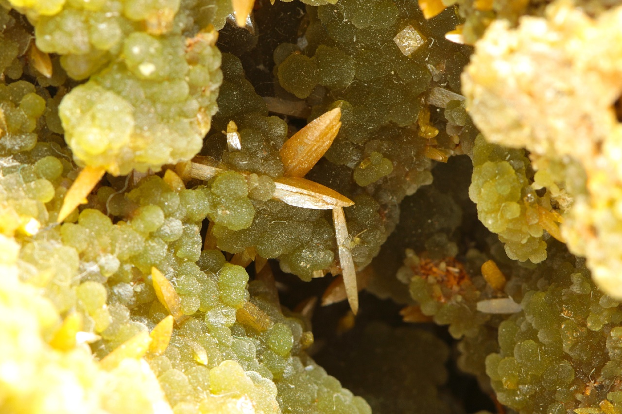 Bohatá ukázka mimetitu s wulfenitem z mexického Mapimi. Velmi kvalitní ukázka zelených pěkně vyvinutých kulovitých agregátů mimetitu, které doprovází klasické špačkovité žluto-oranžové krystaly wulfenitu až 4 mm velké.