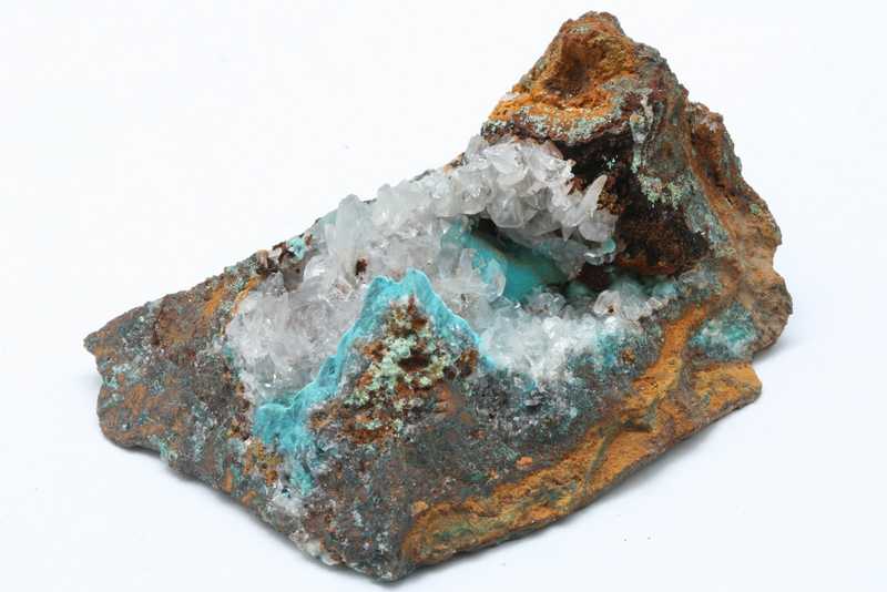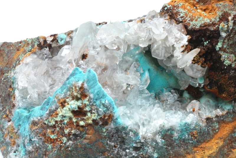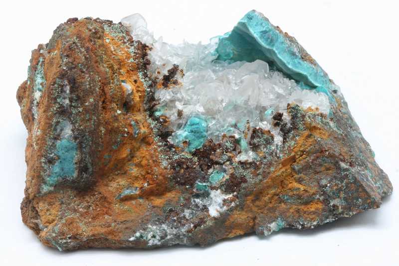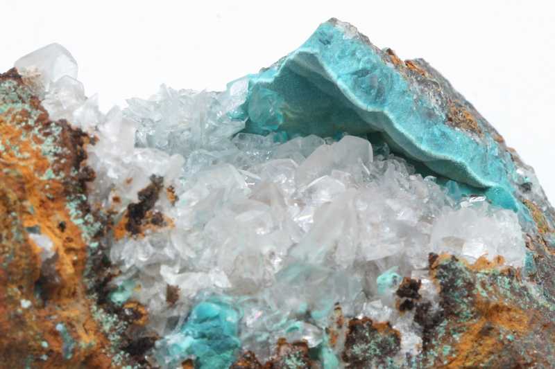 Specimen with velvet, kidney-shaped aggregate of copper and zinc carbonate from the most famous active Mexican ore deposit. Specimen with turquoise-colored, kidney-shaped aggregates of rosasite accompanied by clear calcite crystals .