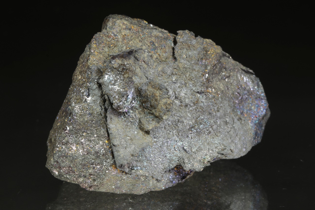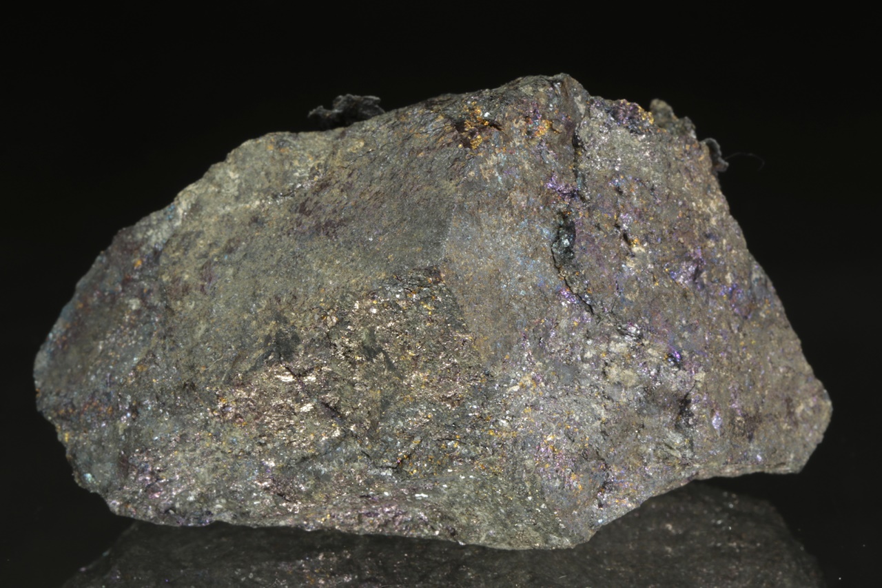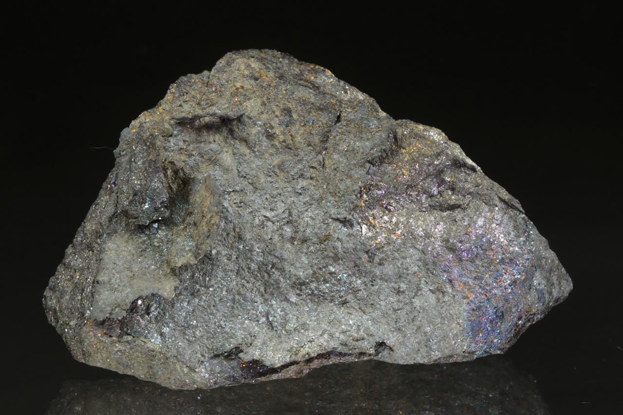 Plech přírodního stříbra, místy pokrytý bornitem, narůstající na podložku z masivního bornitu s výraznými náběhovými barvami. Historický vzorek z Mexika.