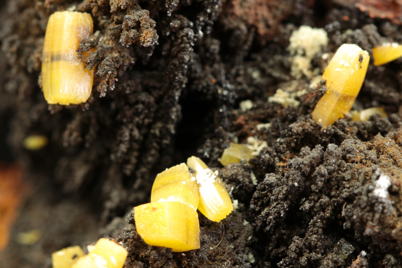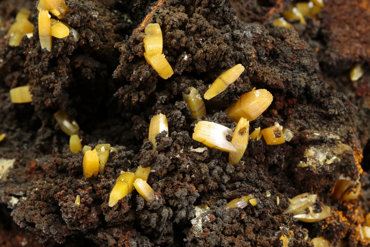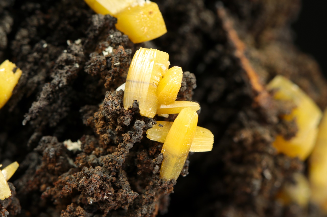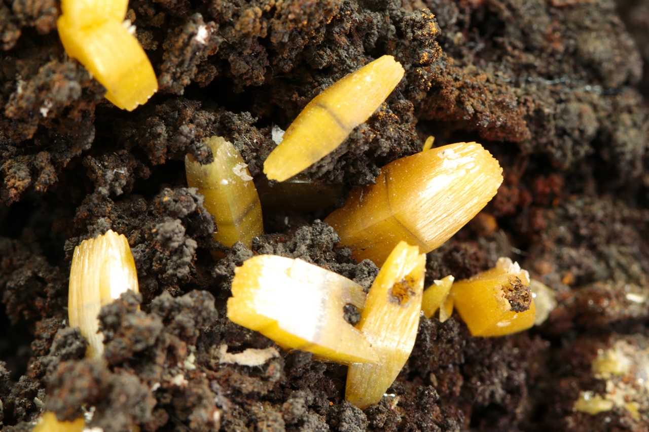 Vzorek krystalů wulfenitu z mexického Mapimi. Ukázka krystalů žlutého wulfenitu o velikosti až 9 mm