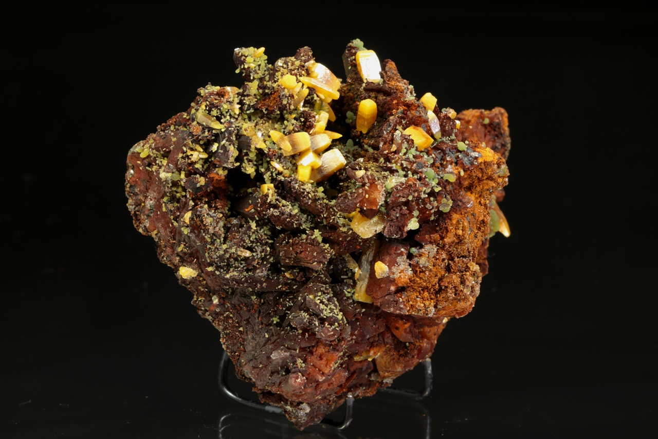 A very aesthetic specimen of wulfenite with mimetite from Mapimi, Mexico. A high-quality specimen of well-developed yellow to yellow-orange tabular wulfenite crystals, accompanied by green aggregates of mimetite; the specimen has a trimmed base.