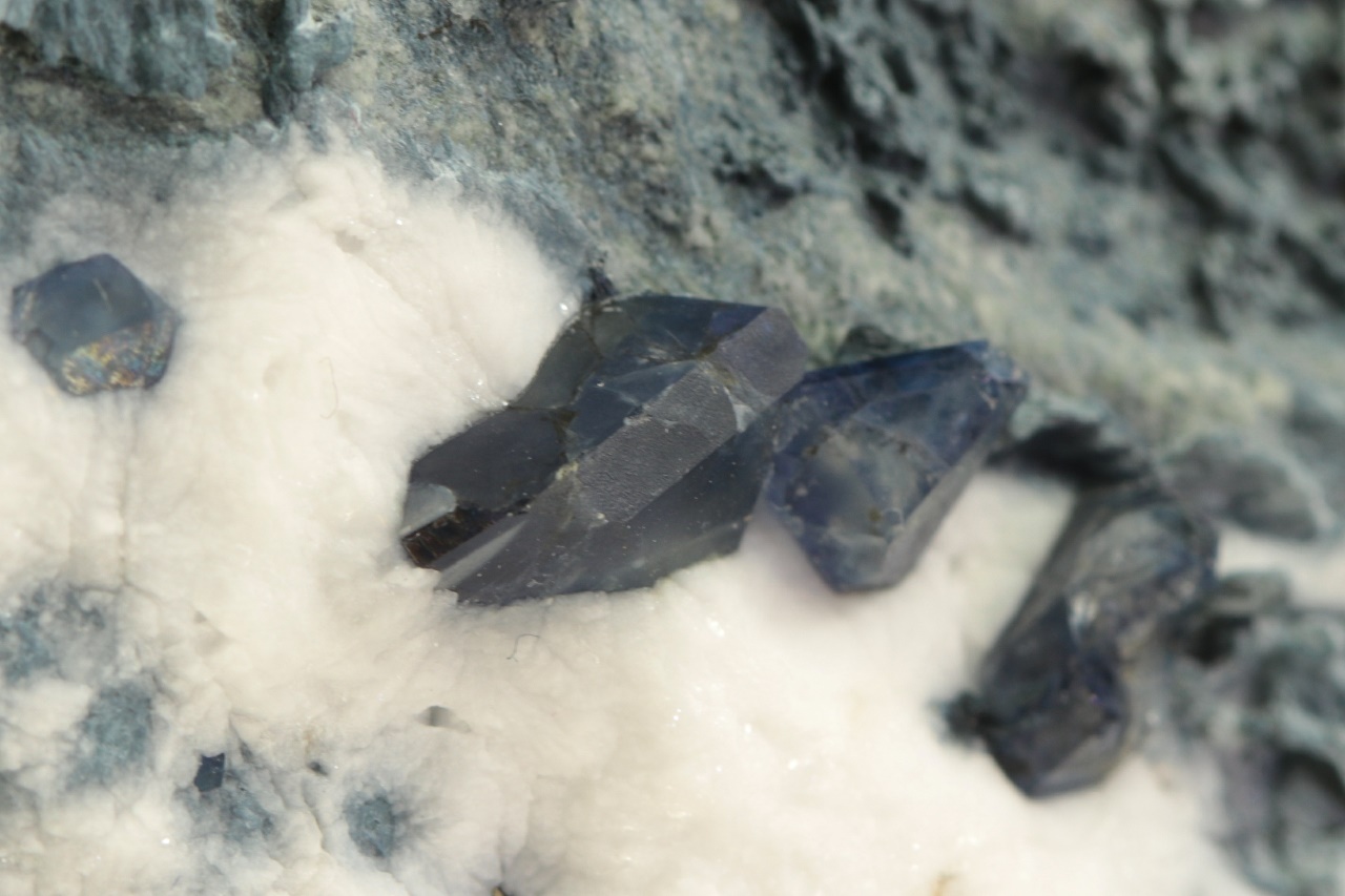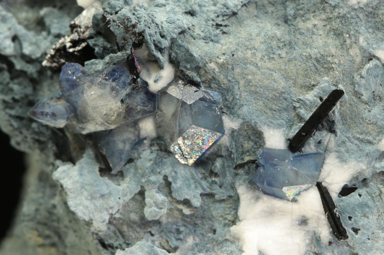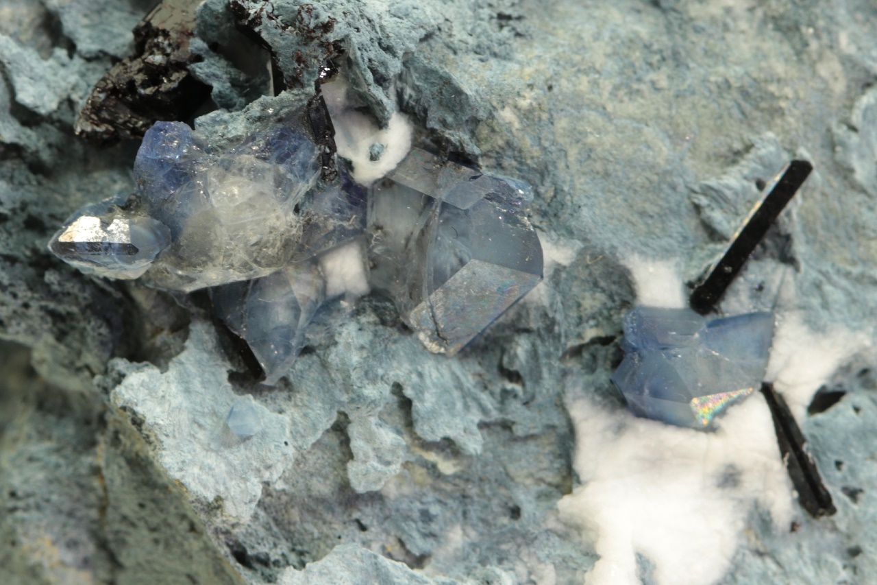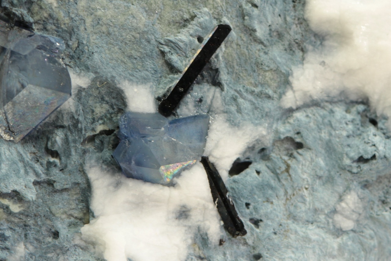 Tmavě modré krystaly velmi vzácného silikátu barya a titanu – benitoitu s černými sloupečky také velmi vzácného neptunitu. Největší krystal benitoitu je 8 mm velký.