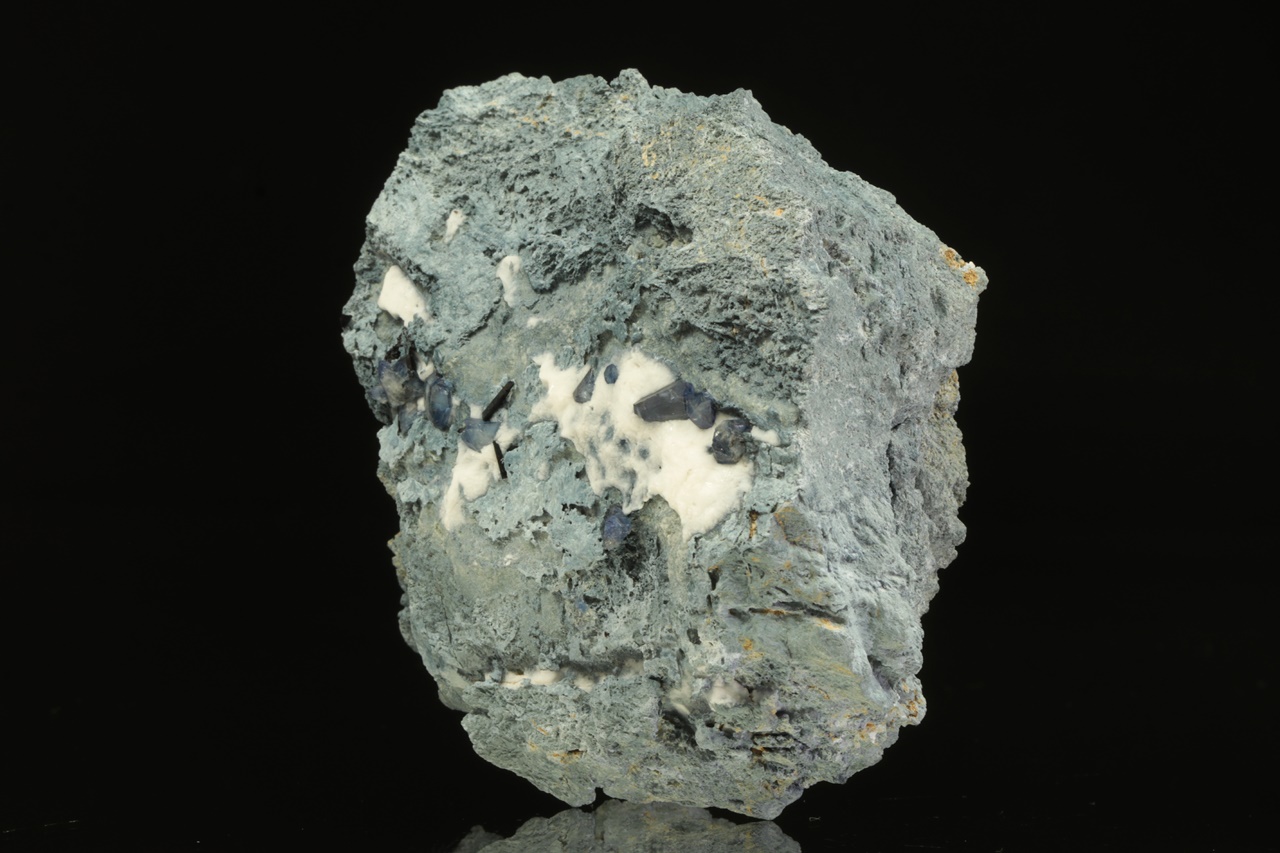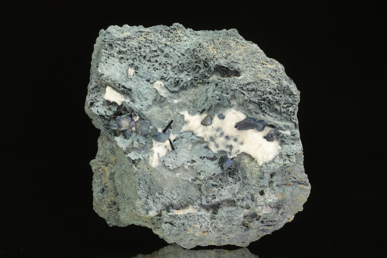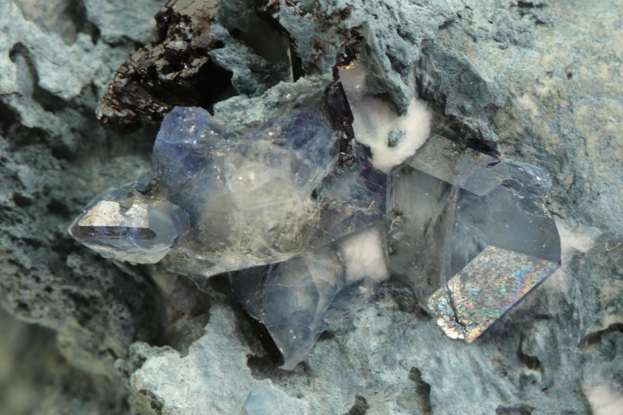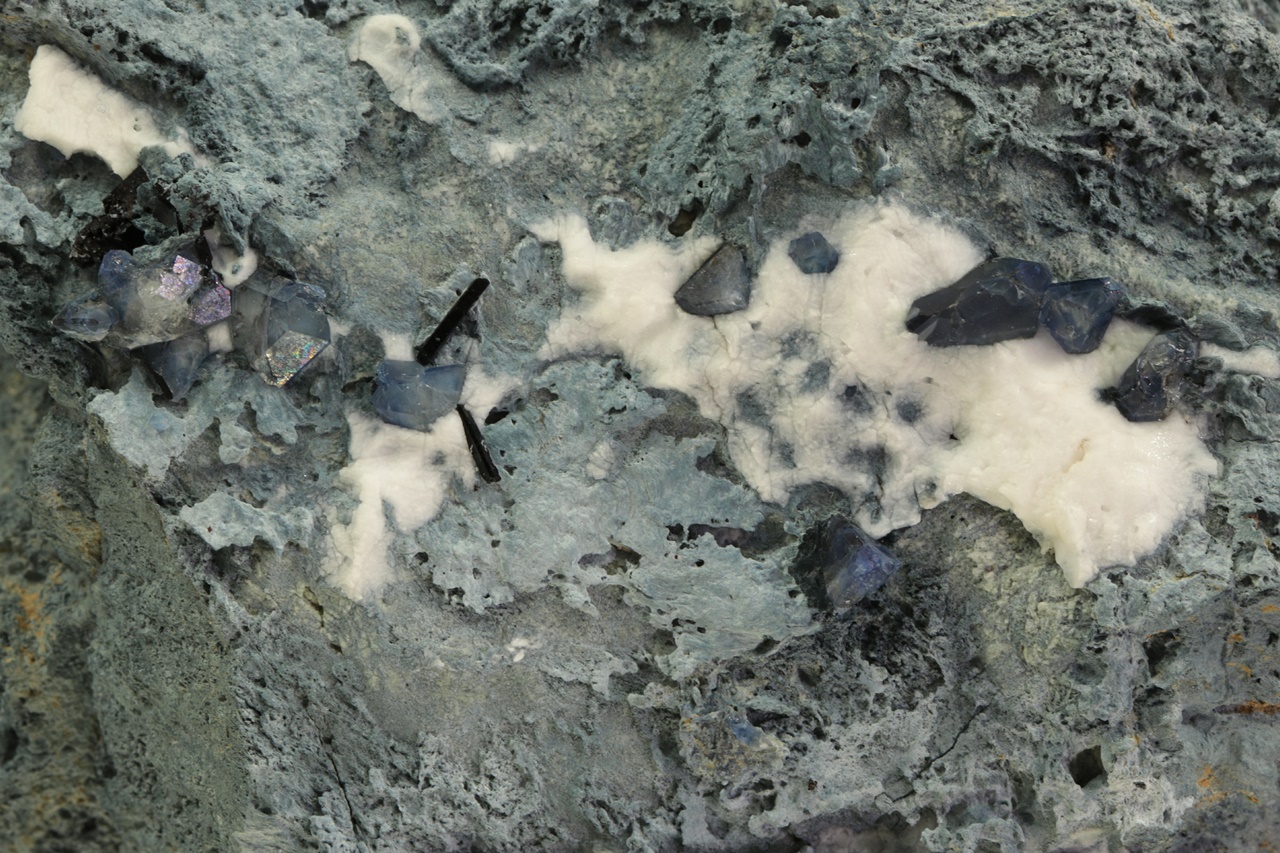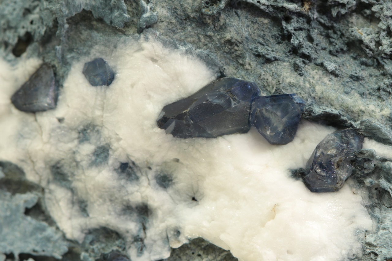 Tmavě modré krystaly velmi vzácného silikátu barya a titanu – benitoitu s černými sloupečky také velmi vzácného neptunitu. Největší krystal benitoitu je 8 mm velký.