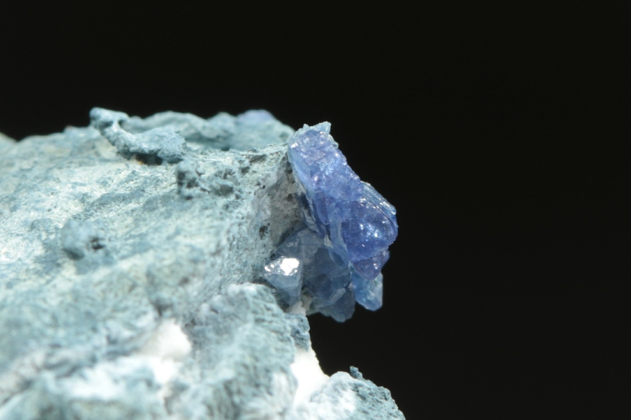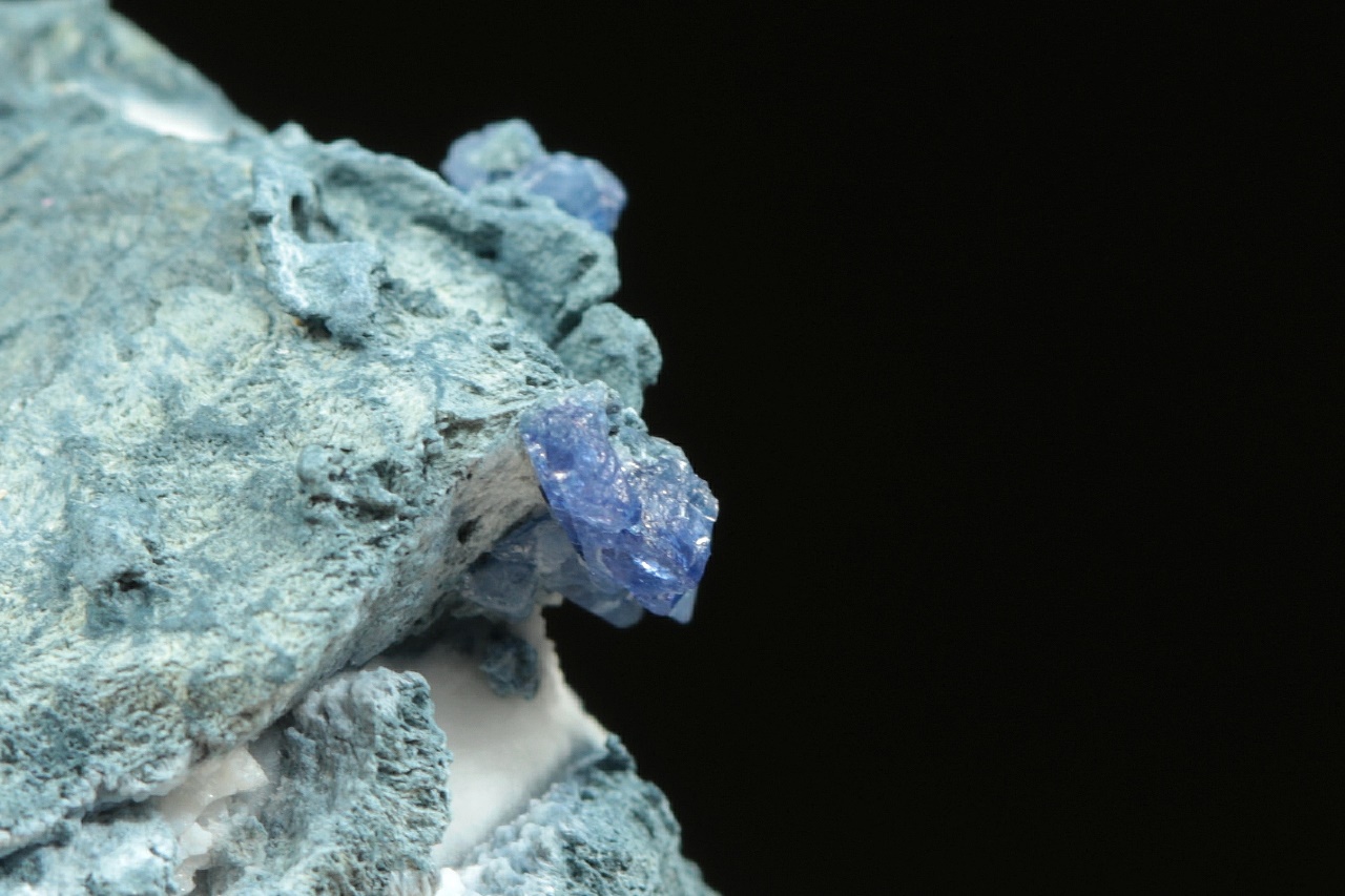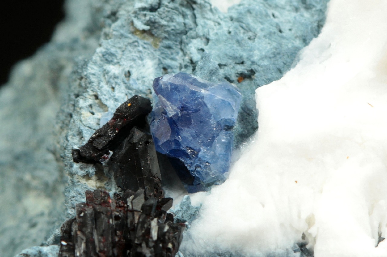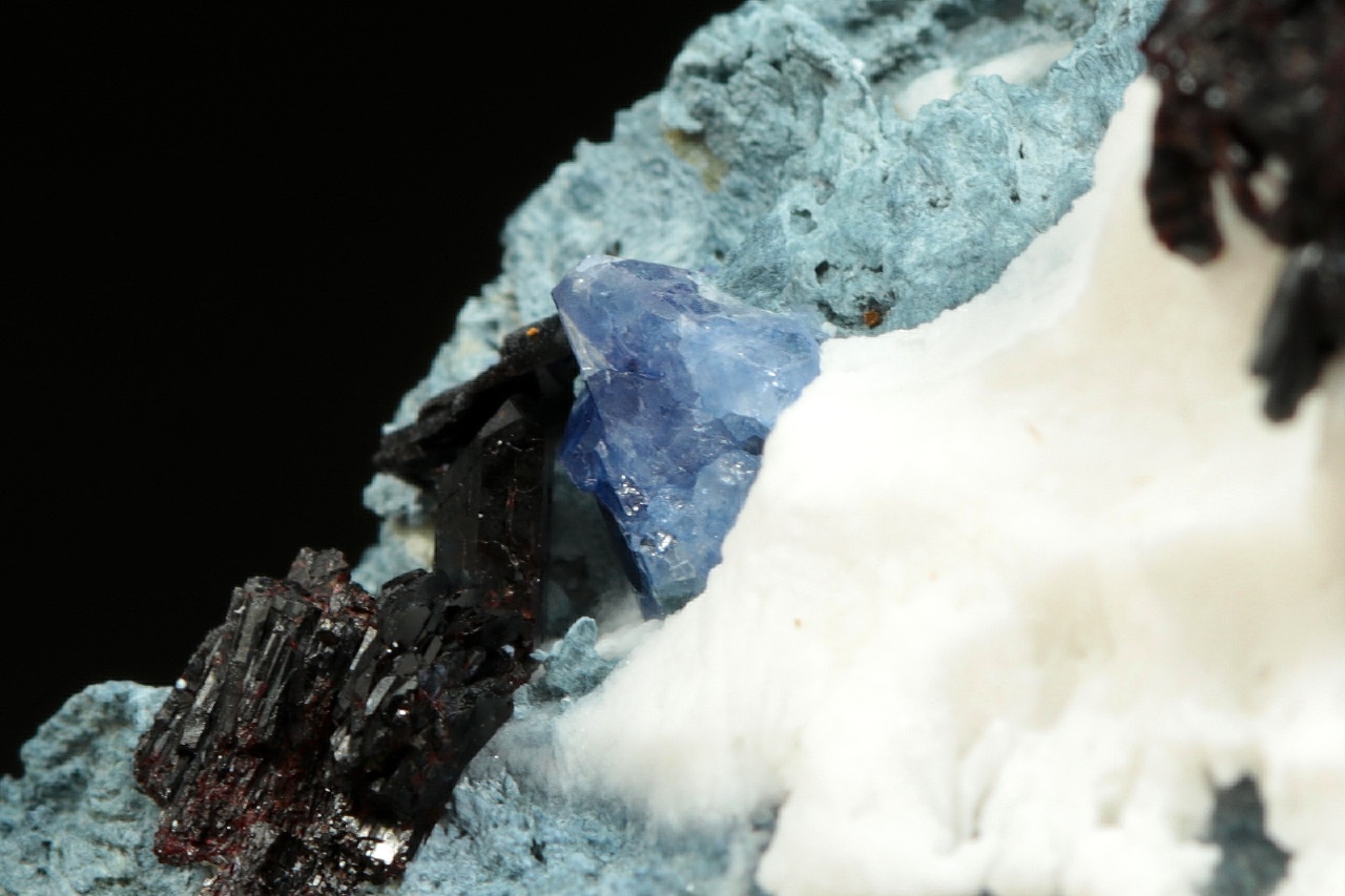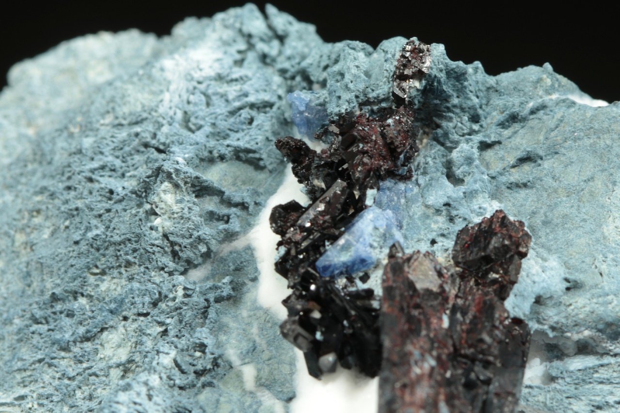 Tmavě modré krystaly velmi vzácného silikátu barya a titanu – benitoitu s černými sloupečky také velmi vzácného neptunitu. Největší krystal benitoitu je 5 mm velký.