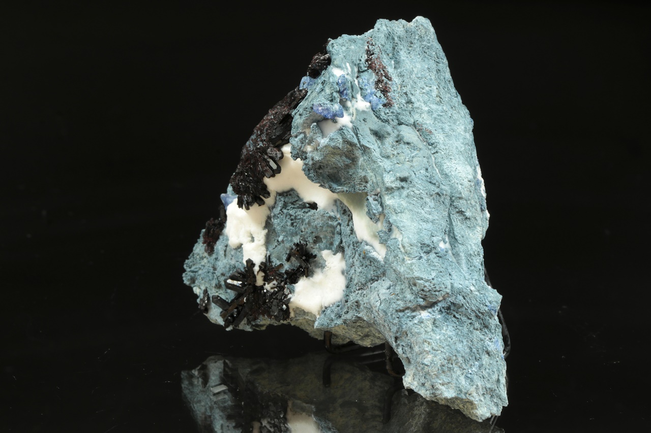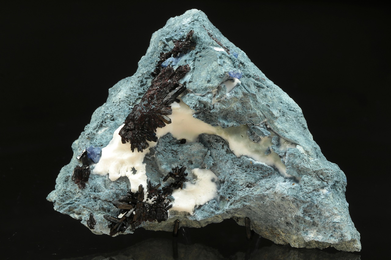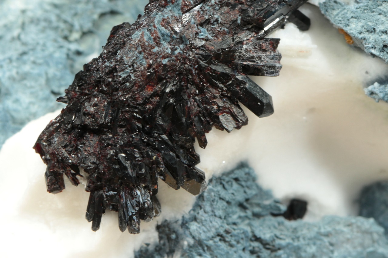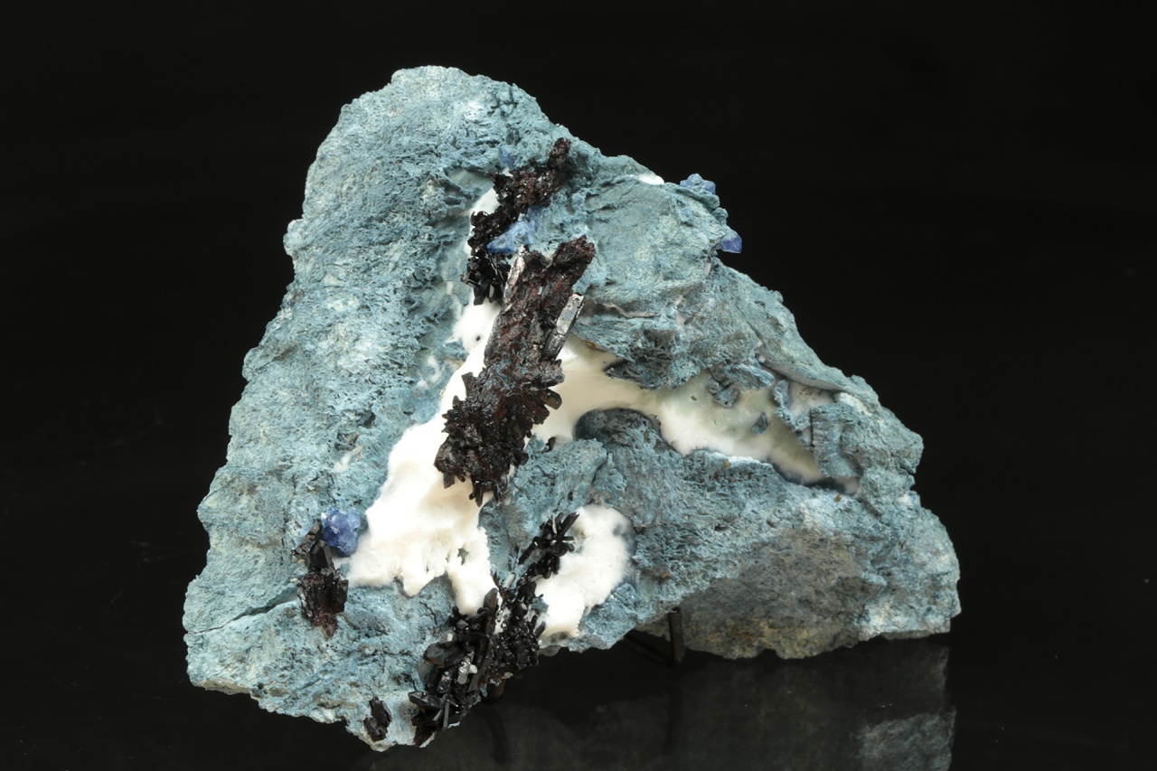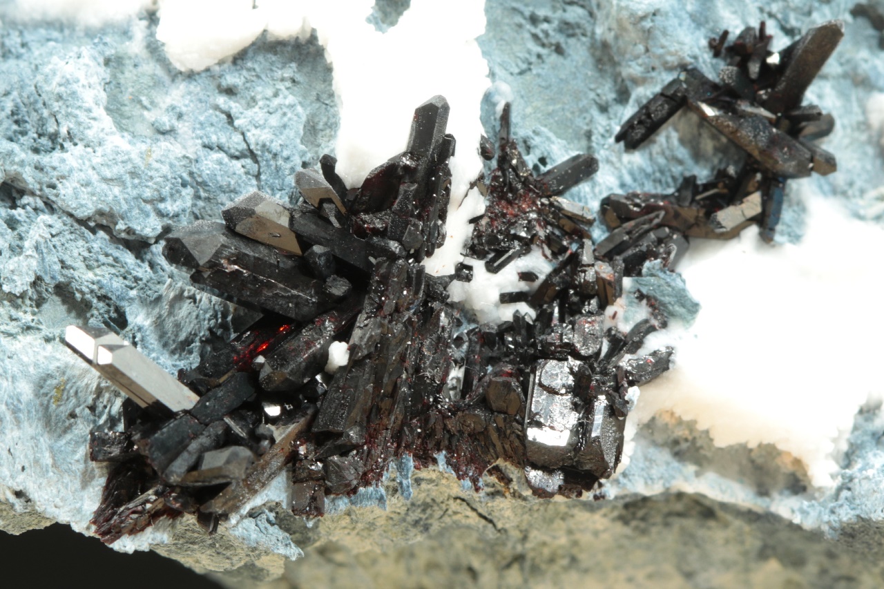 Tmavě modré krystaly velmi vzácného silikátu barya a titanu – benitoitu s černými sloupečky také velmi vzácného neptunitu. Největší krystal benitoitu je 5 mm velký.