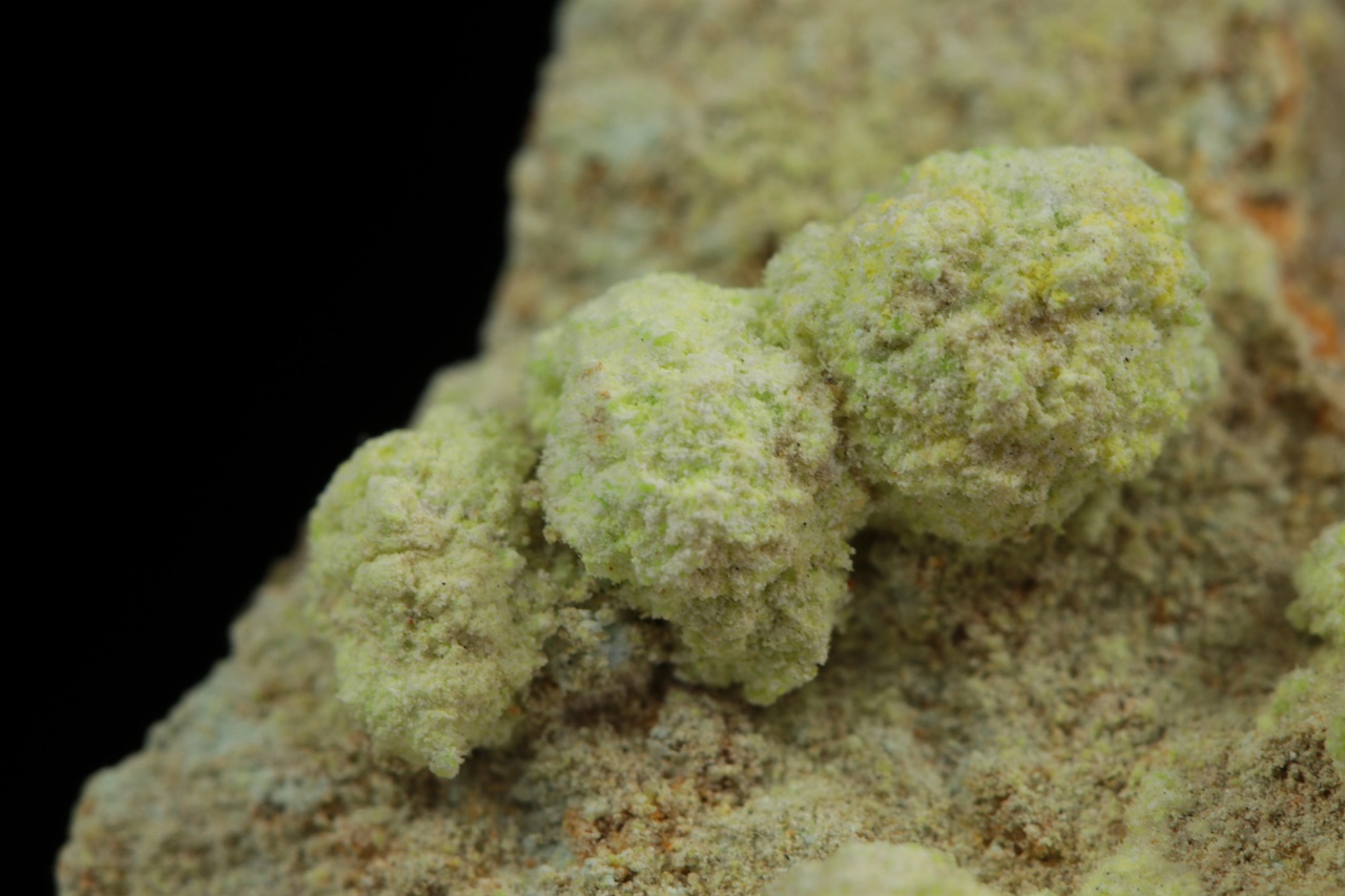 Světle žluté kulovité agregáty (až 6 mm velké) velmi vzácného sulfátu uranylu, hliníku a sodíku z typové lokality. Vzorek je z dutiny odkud pochází nejlepší vzorky.