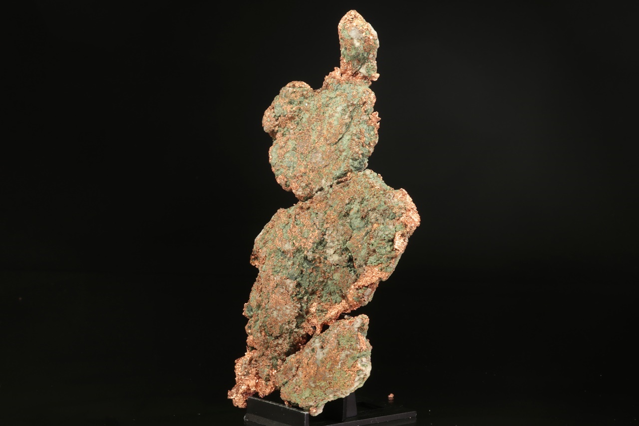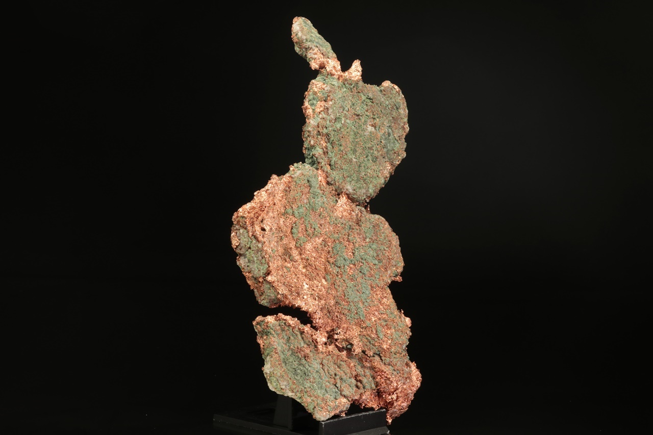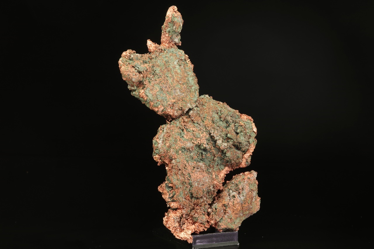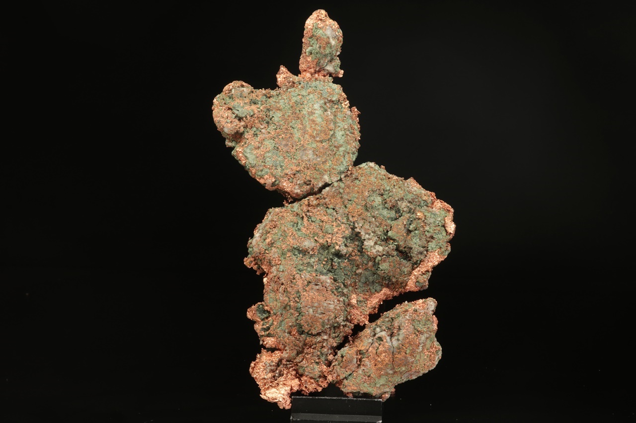 Nádherná ukázka velkého agregátu načervenalé mědi částečně porostlé zelenými a hnědými sekundáry mědi. Vzorek je leptaný.