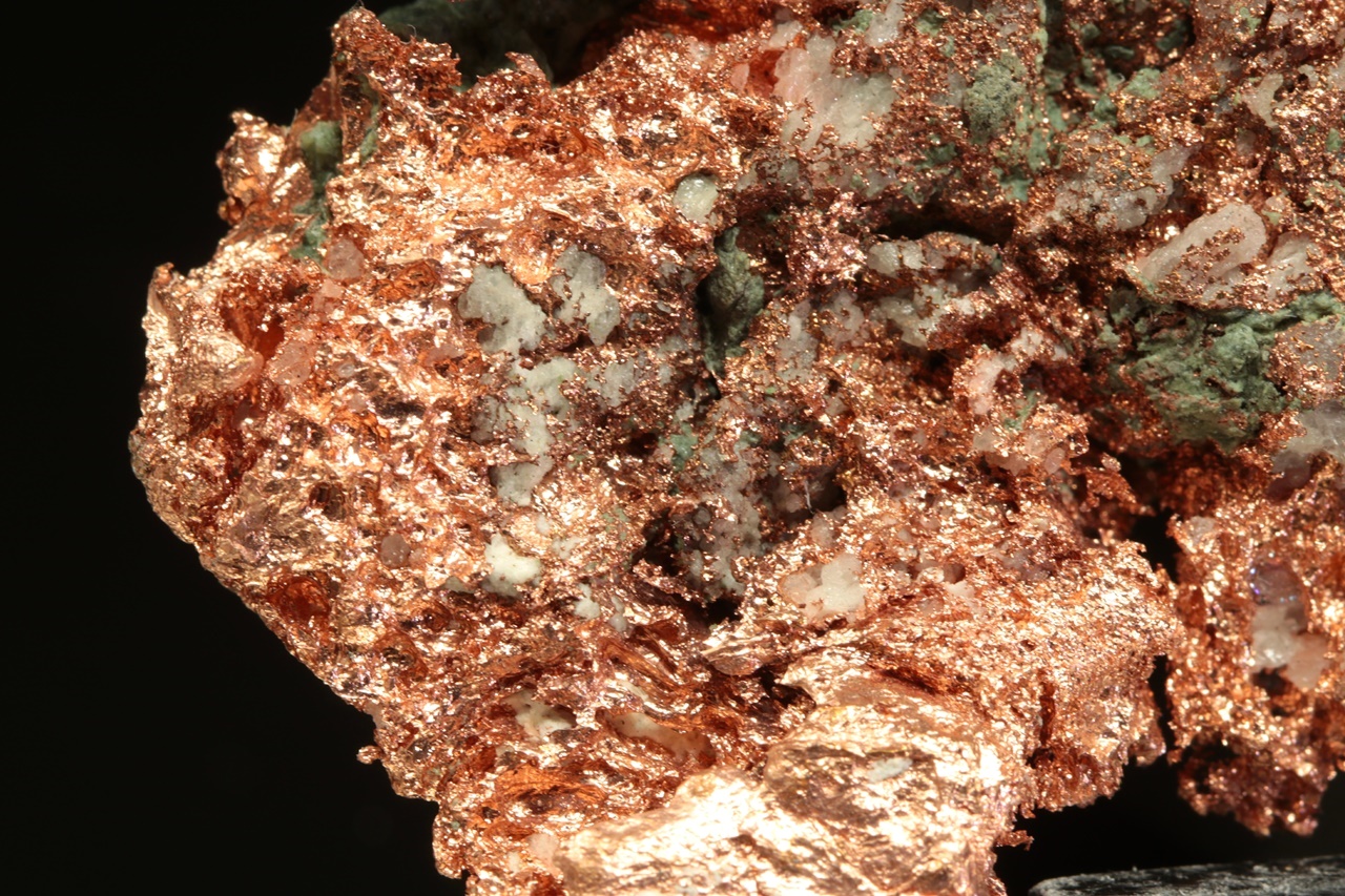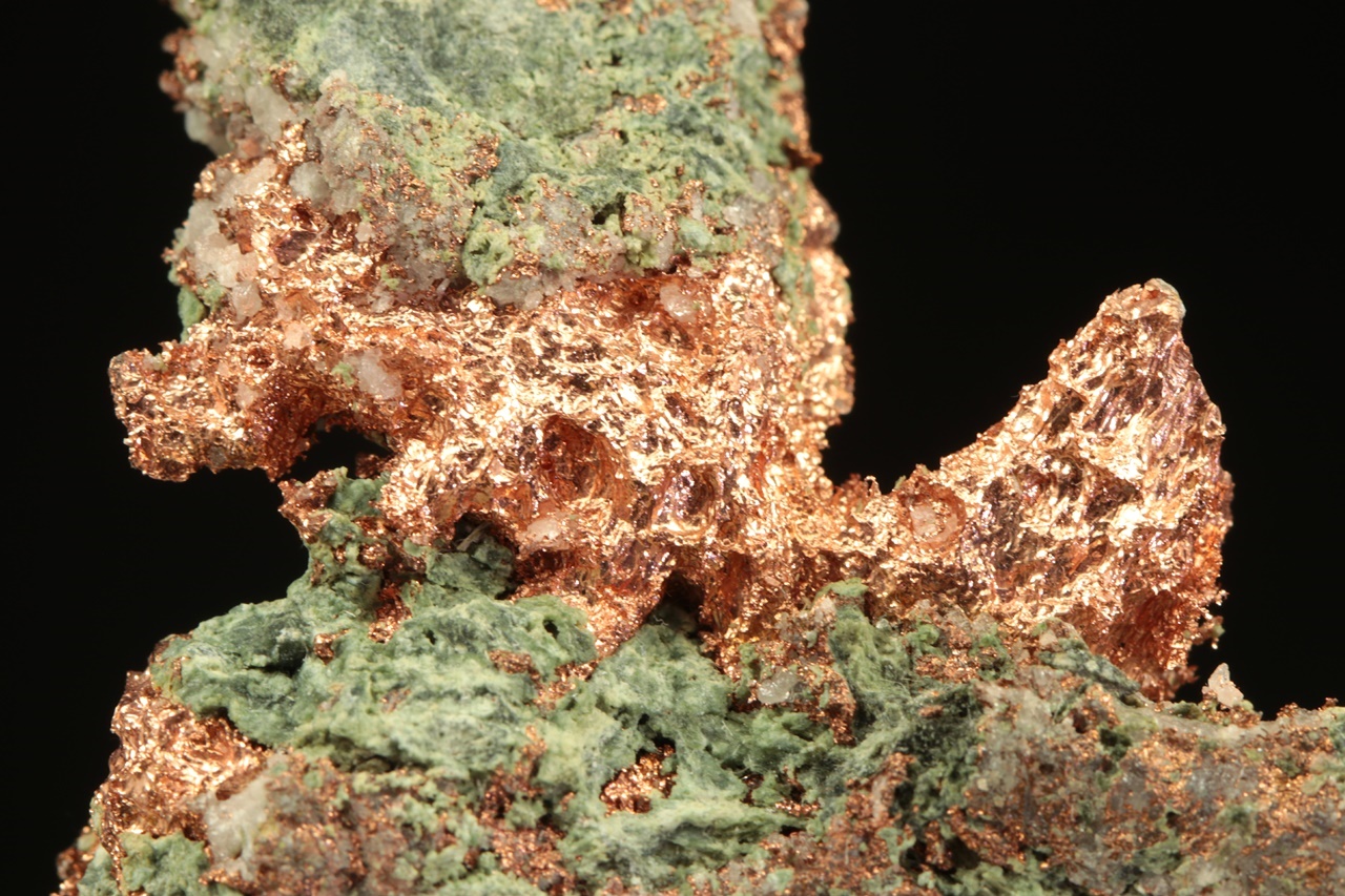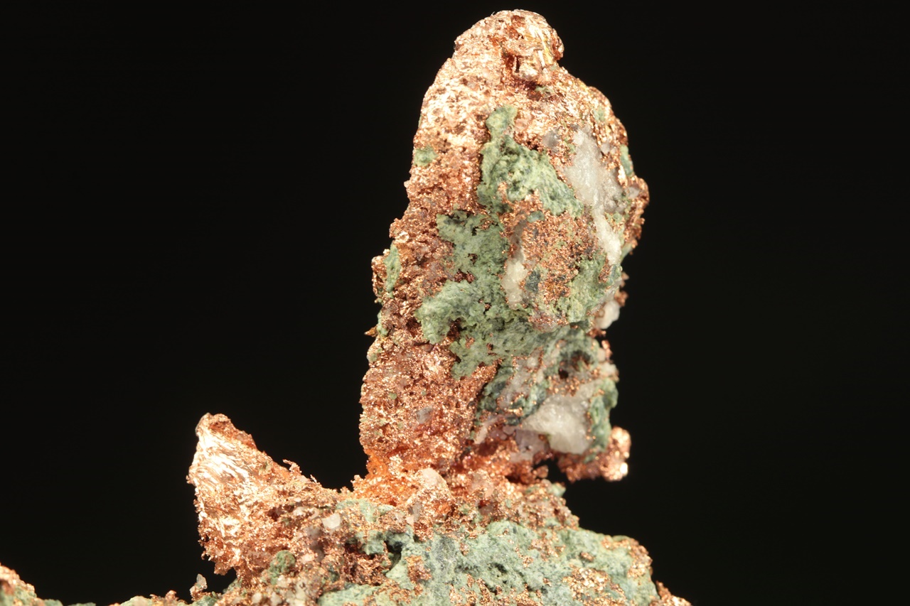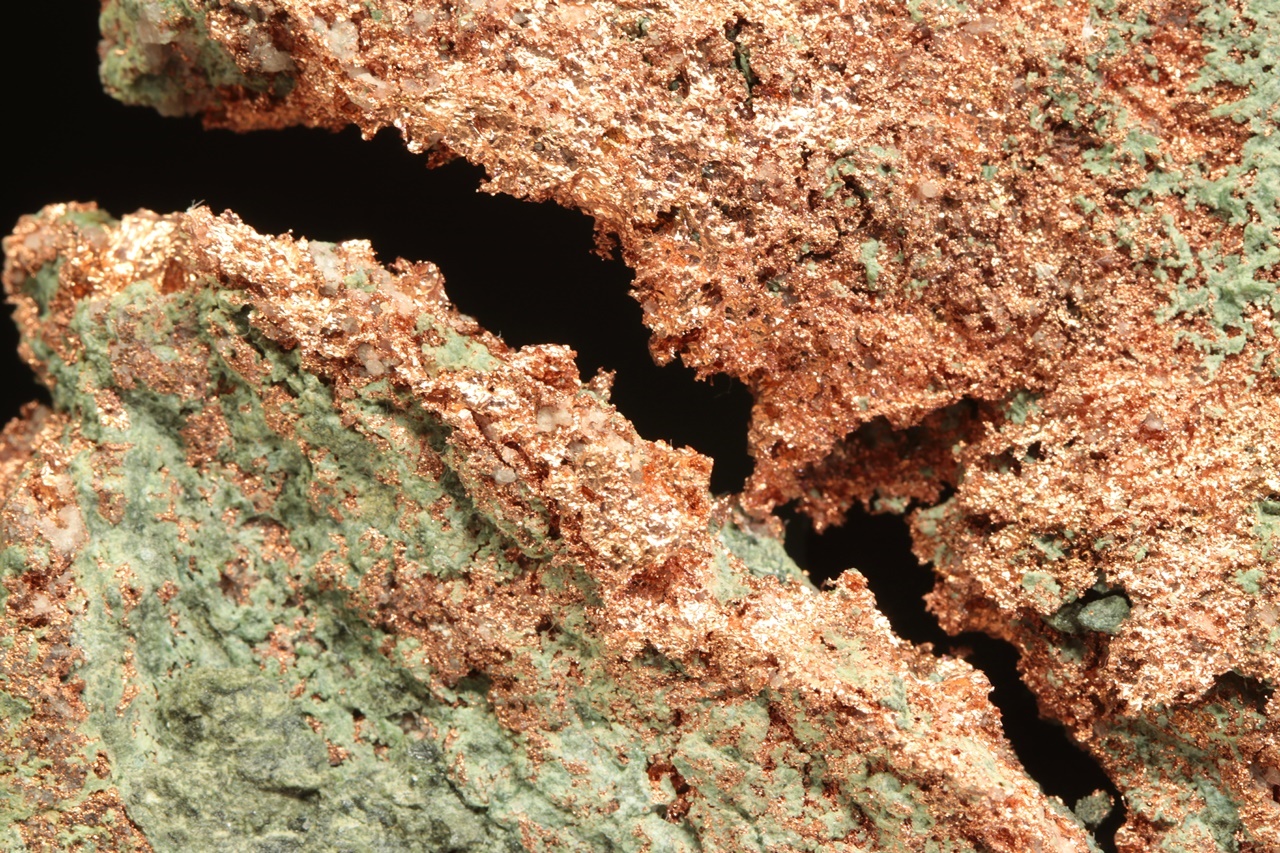 Nádherná ukázka velkého agregátu načervenalé mědi částečně porostlé zelenými a hnědými sekundáry mědi. Vzorek je leptaný.
