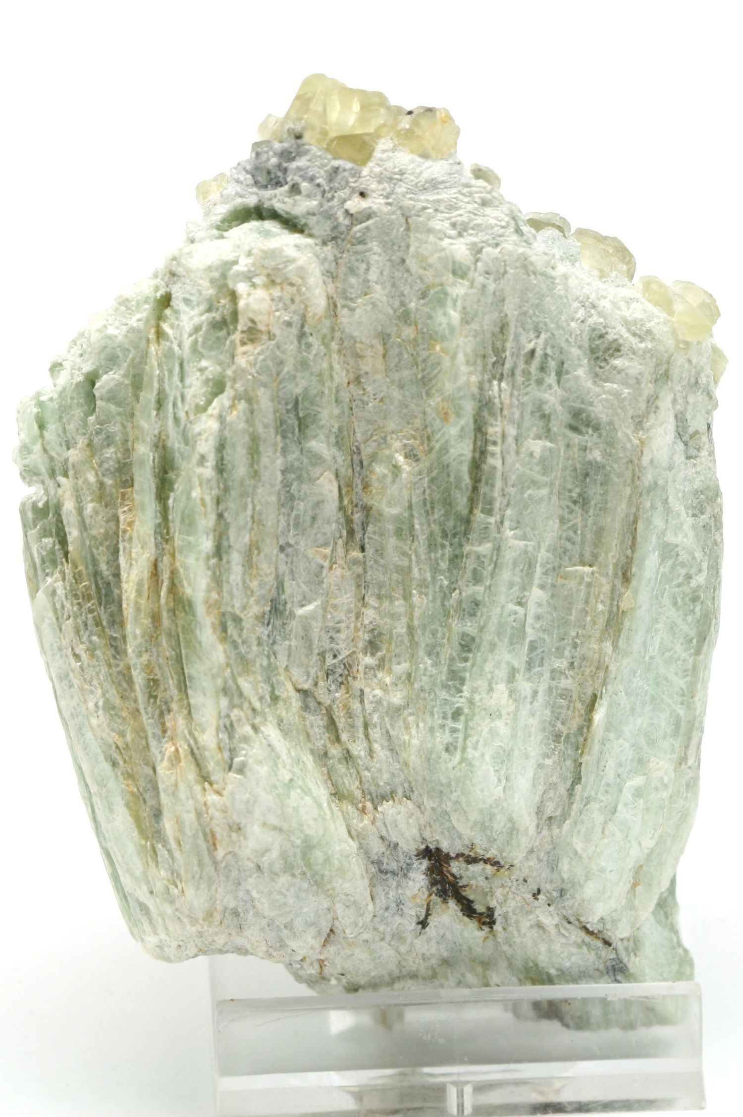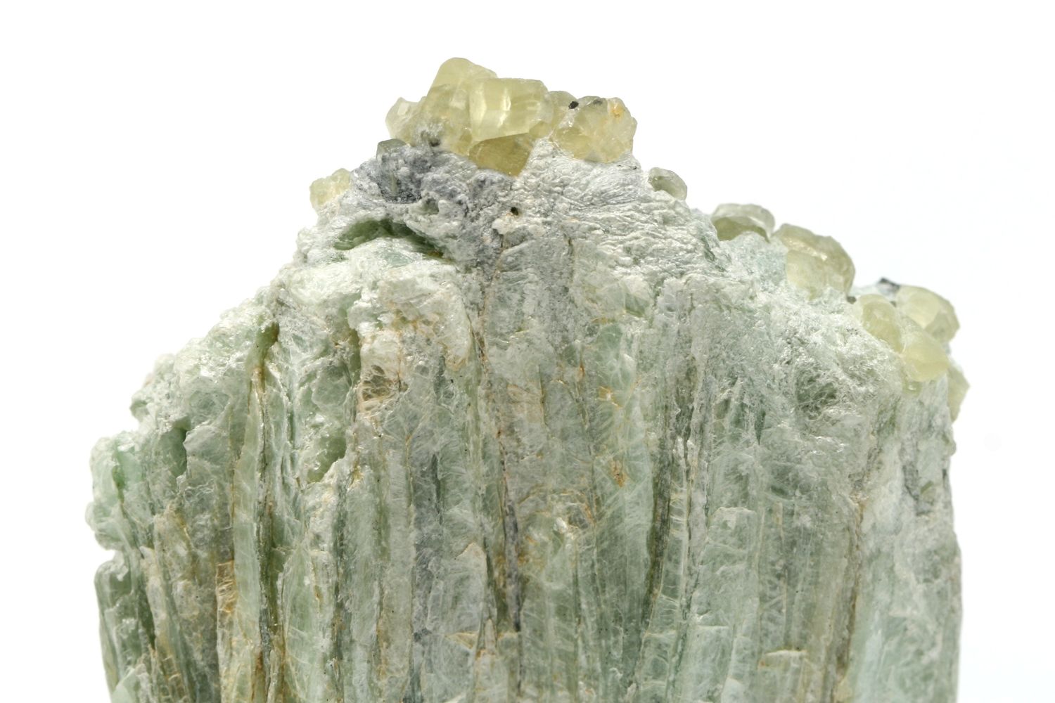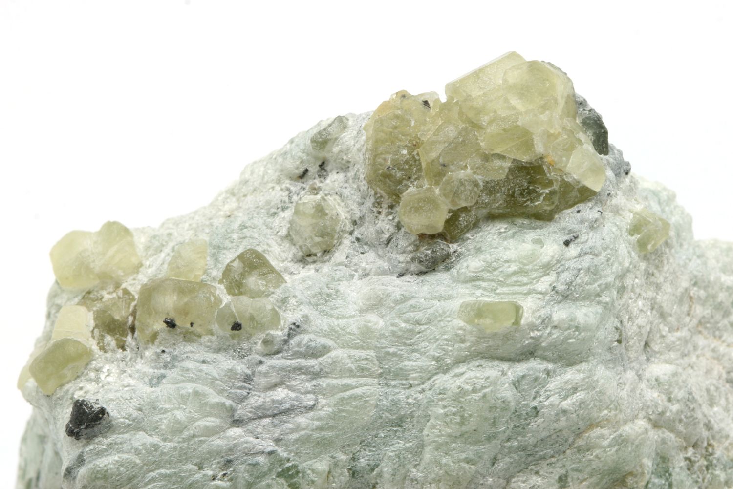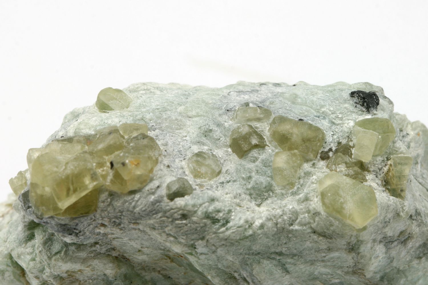 Cluster of small green apatite crystals overgrown into talc schist.