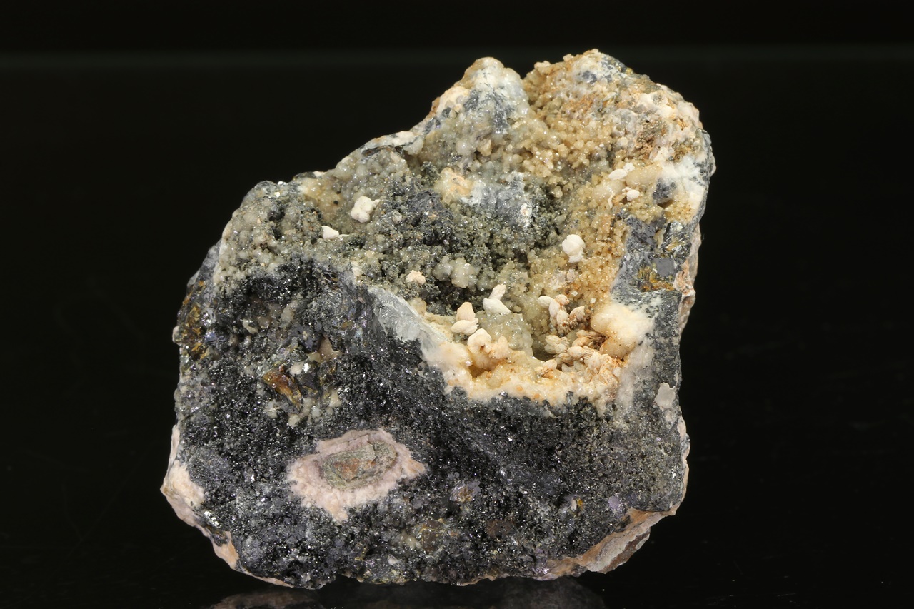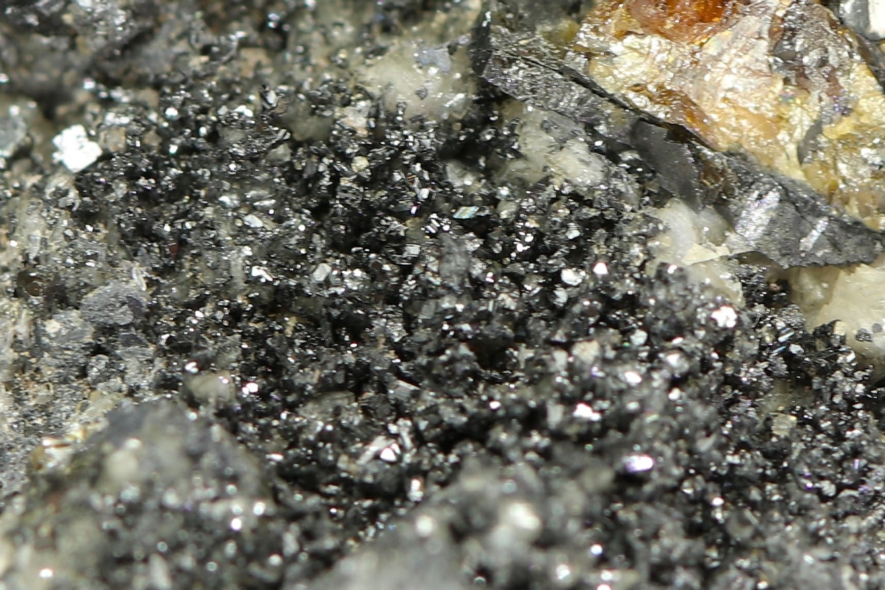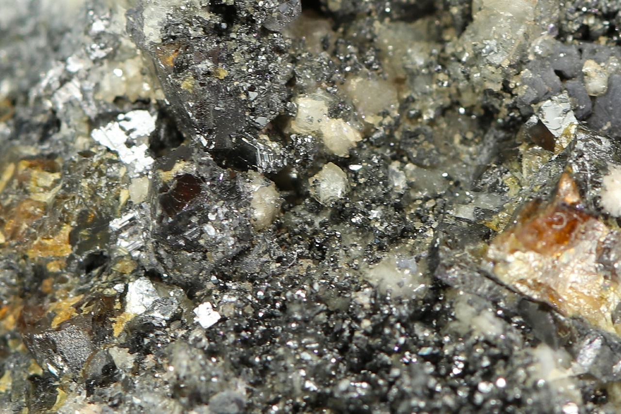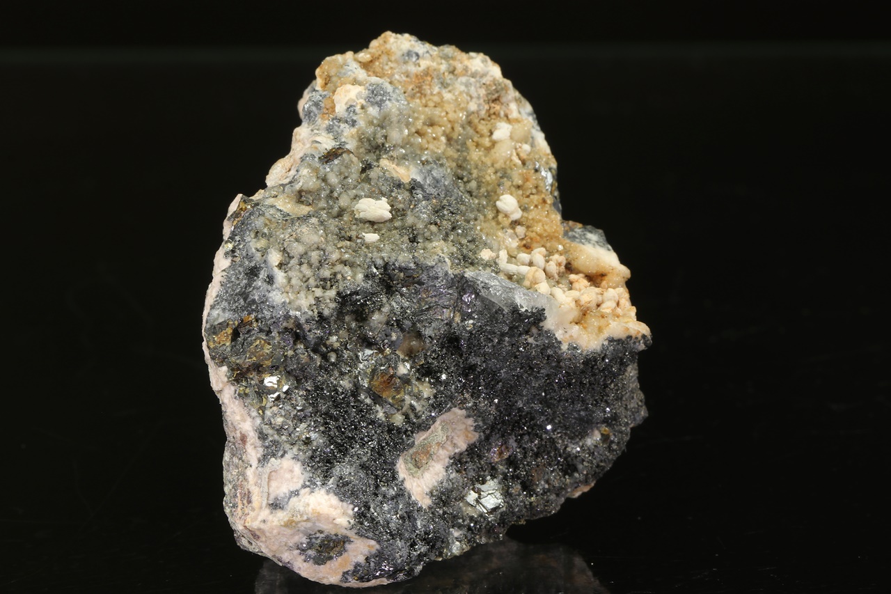 An exceptionally rich mineral specimen, featuring a lower part densely grown with small stefanite crystals exhibiting characteristic striations. Furthermore, honey-brown sphalerite and skeleton-like grown galena, among others, can be observed.