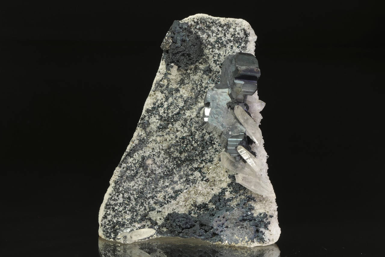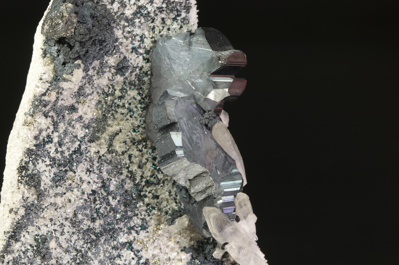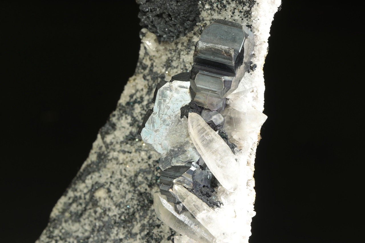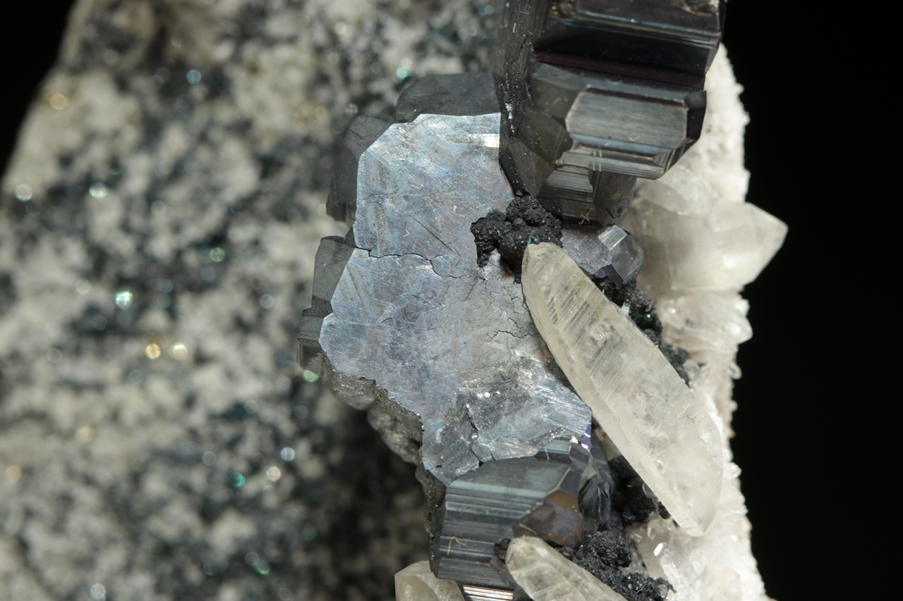 Nádherná srostlice několika zdvojčatělých krystalů tmavého, lesklého bournonitu částečně prorůstající s křišťálem. Velikost srostlice je přibližně 4 × 2 cm. Prostřední bournonit je v délce 10 mm poškozený.