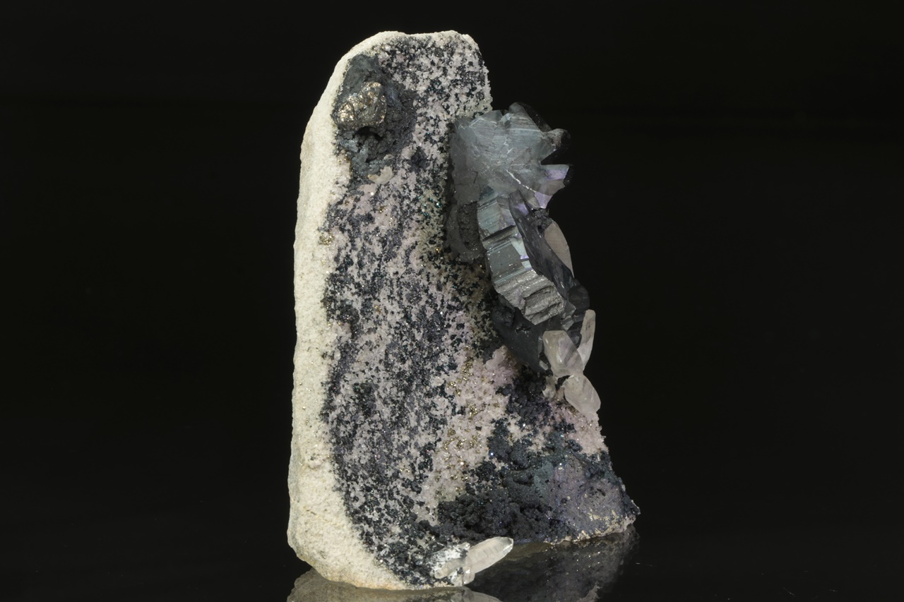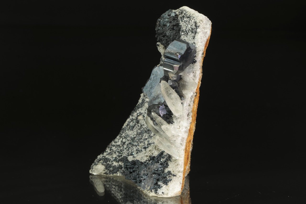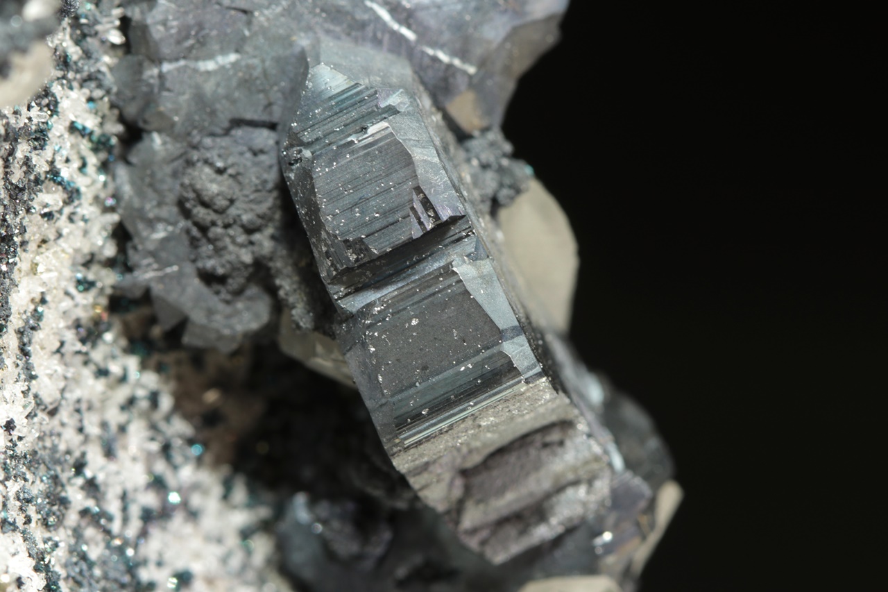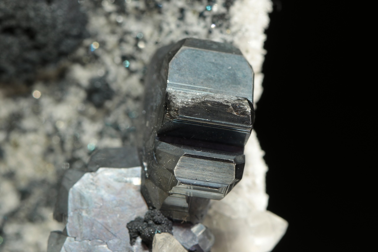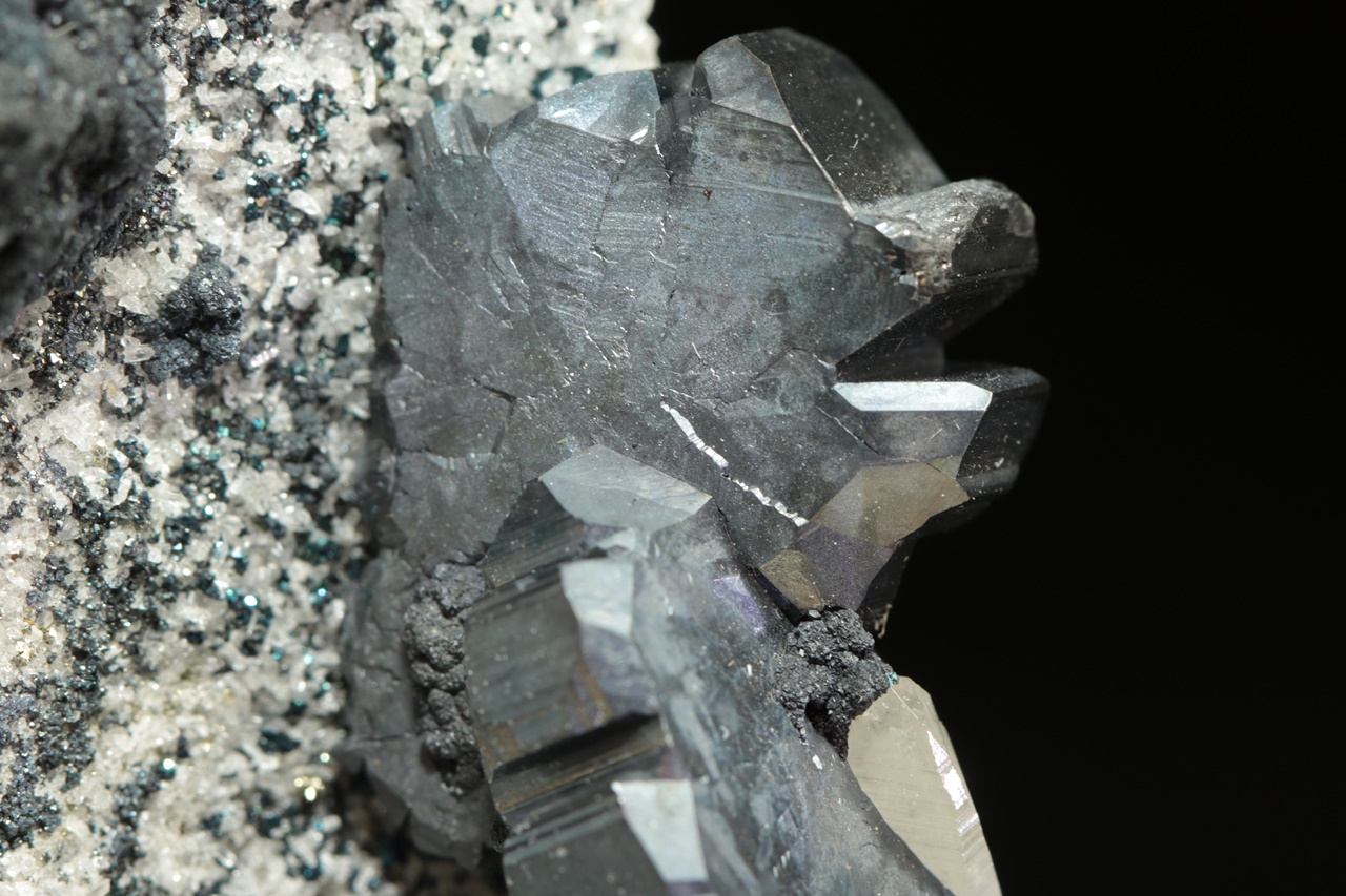 Nádherná srostlice několika zdvojčatělých krystalů tmavého, lesklého bournonitu částečně prorůstající s křišťálem. Velikost srostlice je přibližně 4 × 2 cm. Prostřední bournonit je v délce 10 mm poškozený.