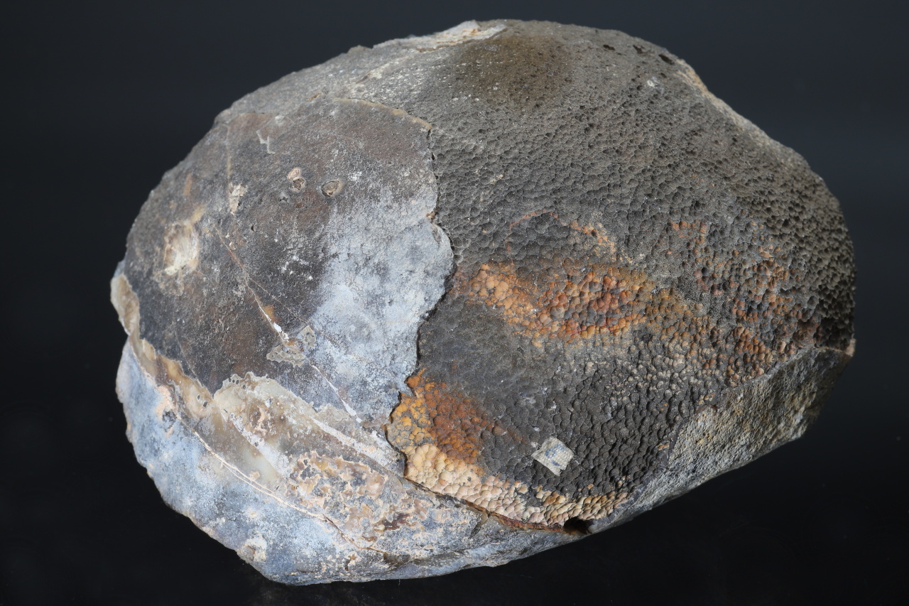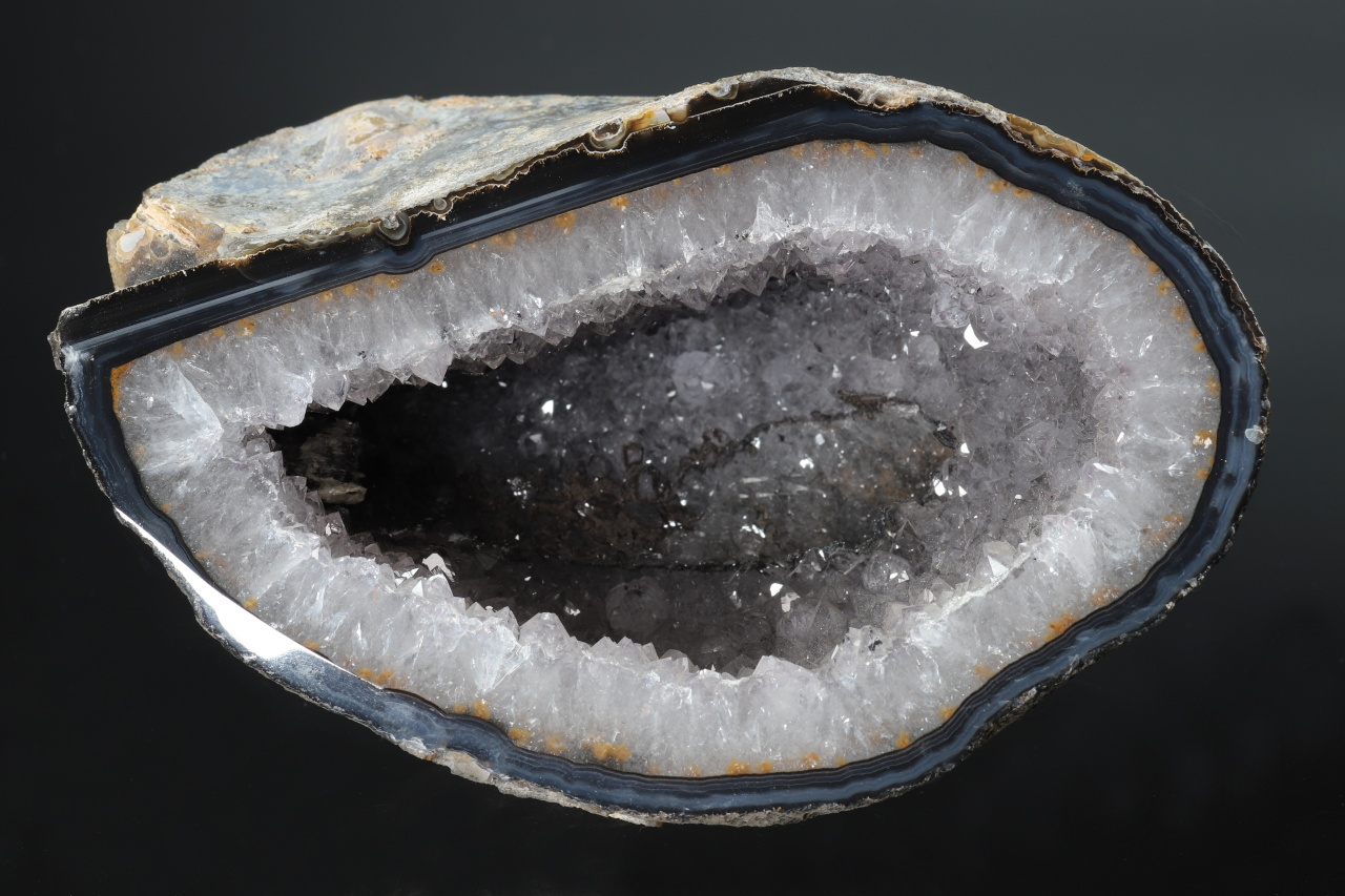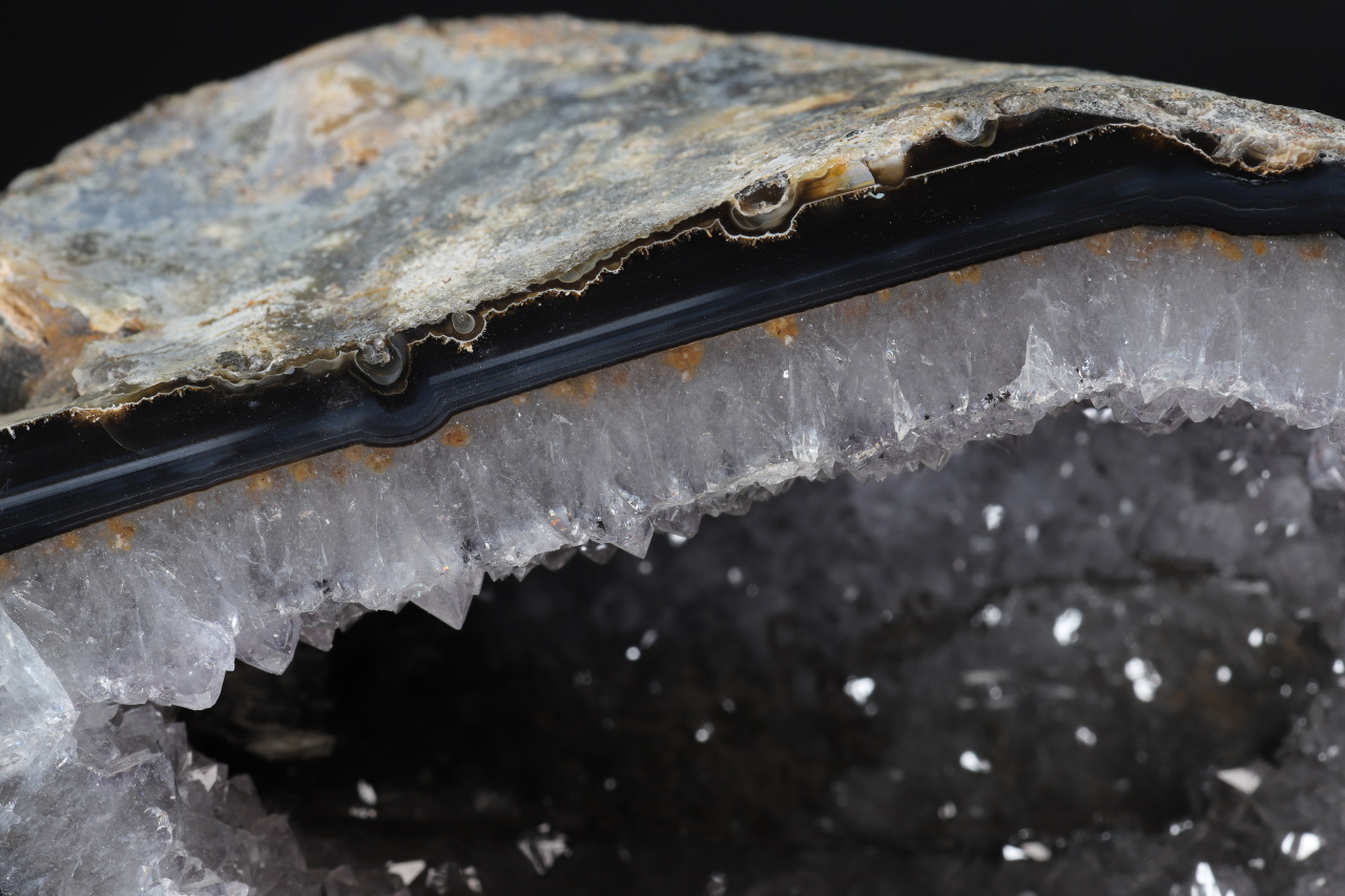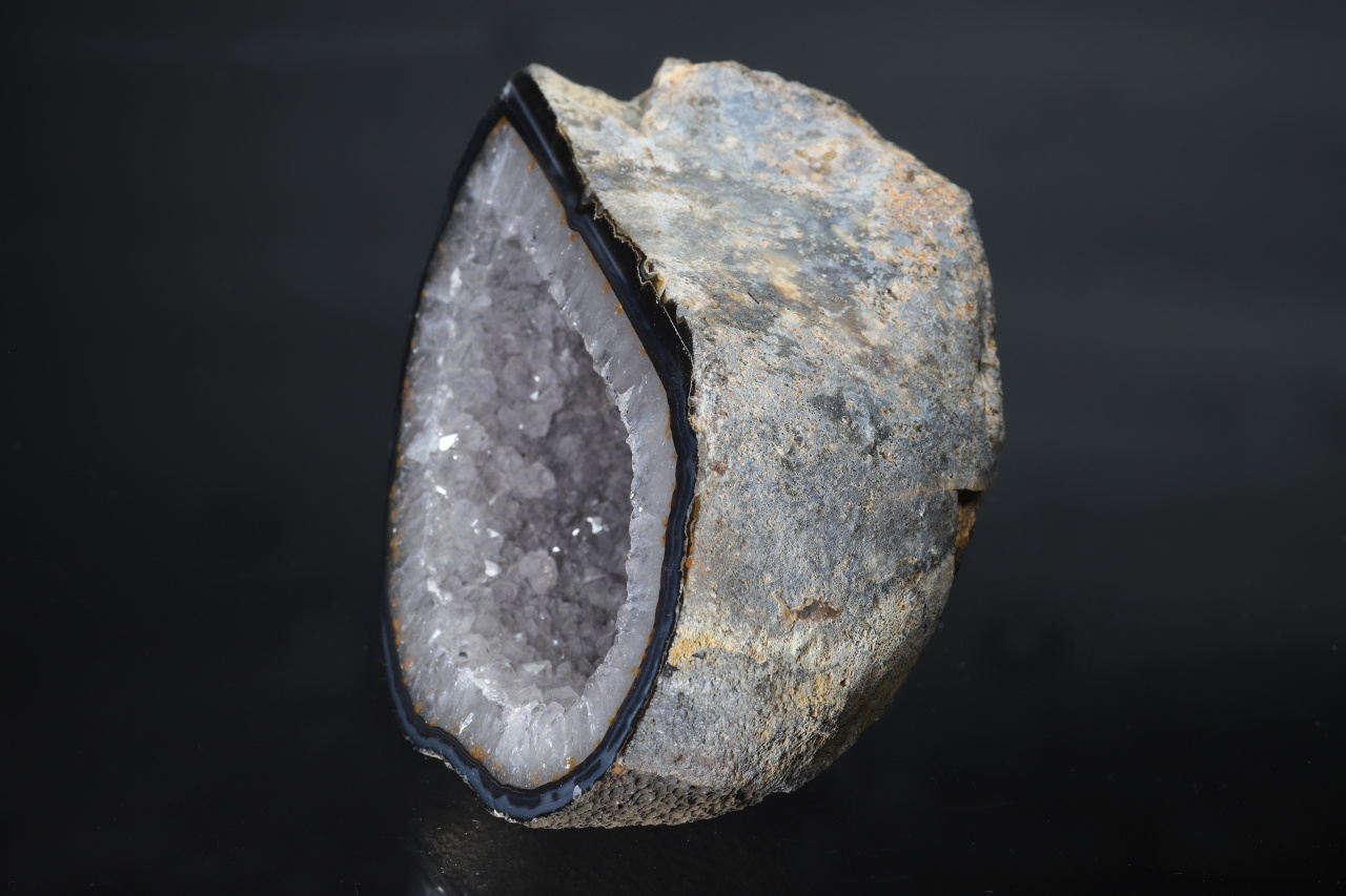 “Elegant interesting geode with a very dark rim and a crystal cavity.”