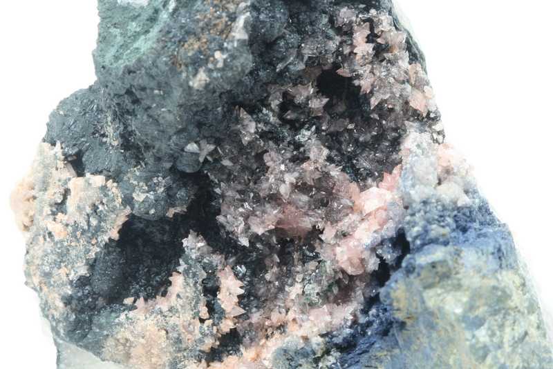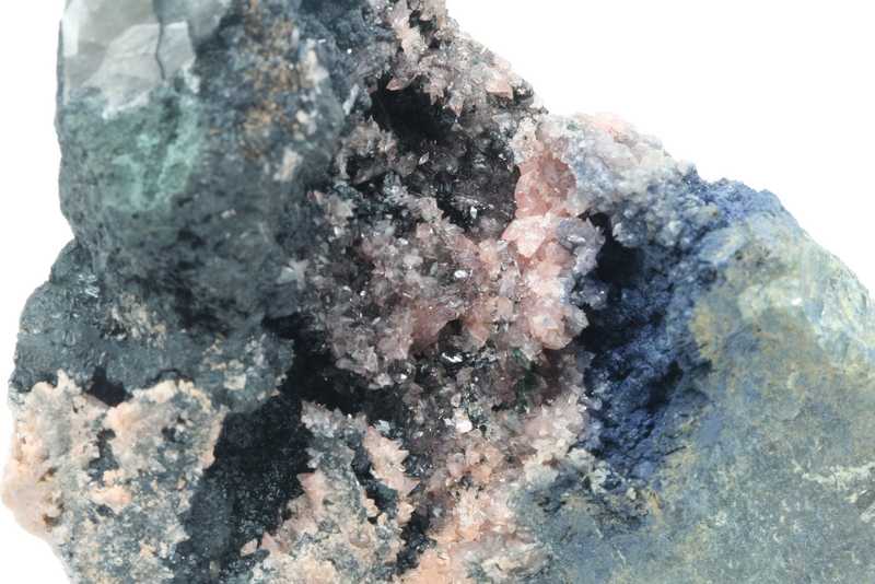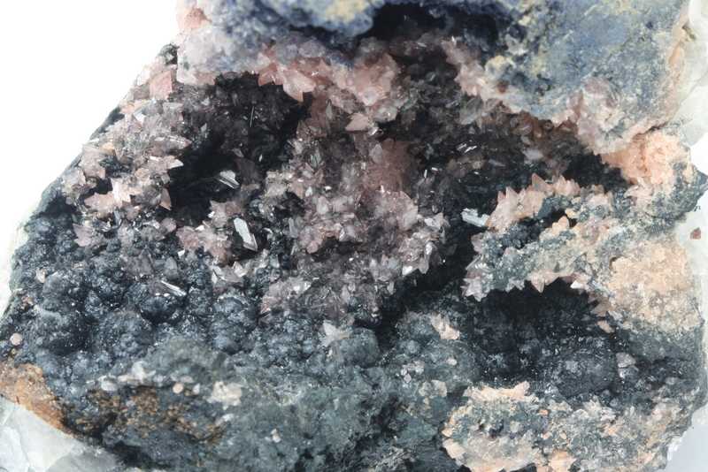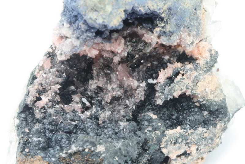 A beautiful example of the not-so-common manganese phosphate Hureaulite from the Cigana mine, Brazil. A specimen of beige Hureaulite crystals in a cavity grown on radial reniform aggregates of Rockbridgeite, on the other side of the cavity there is Vivianite covering a grain of Triphyllite sized 3 cm.