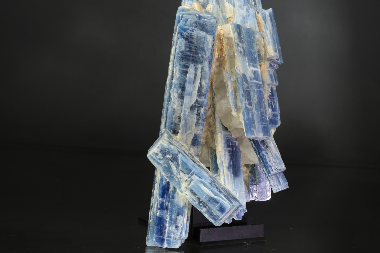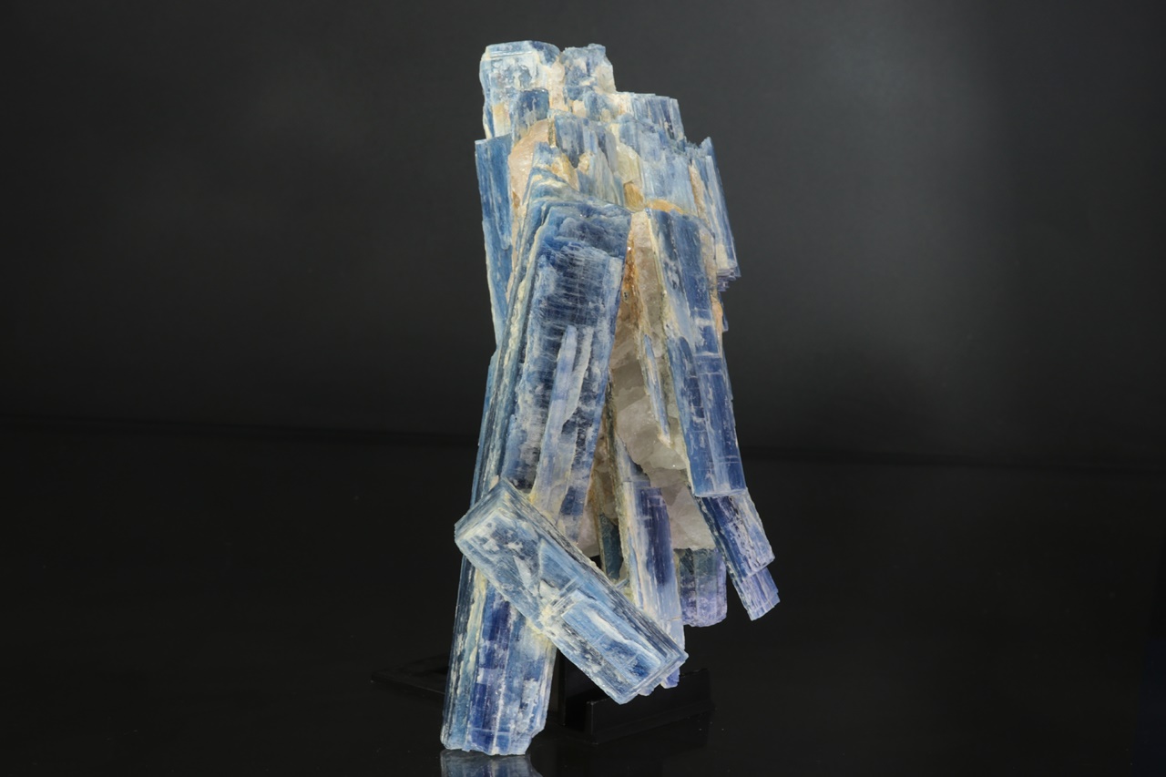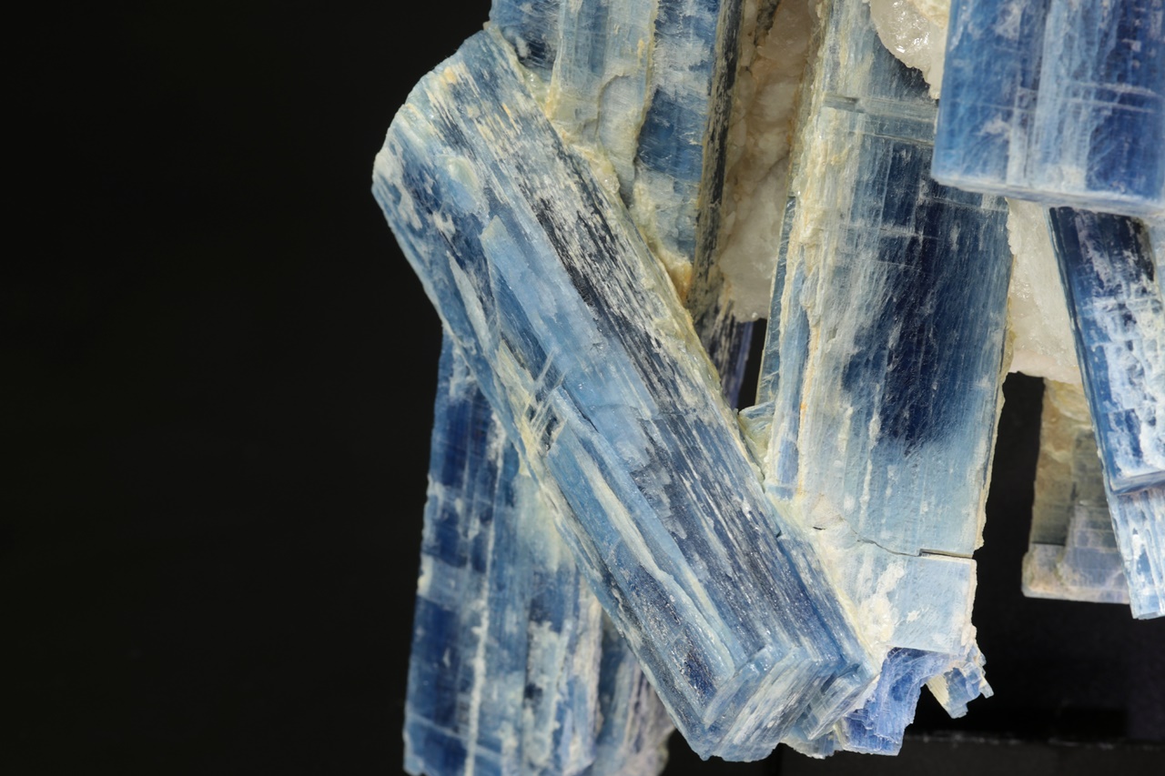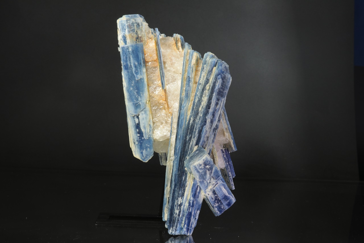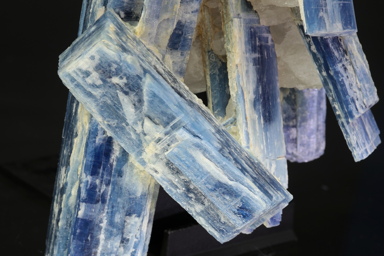 Velký vzorek mocných lištovitých krystalů sytě modrého kyanitu v bílém křemeni. Největší krystal je 19 cm dlouhý.