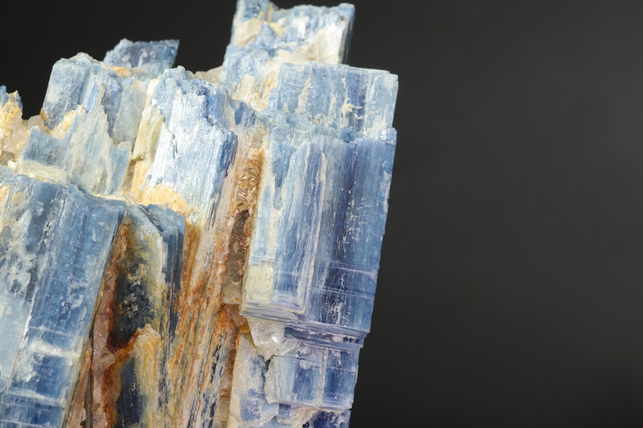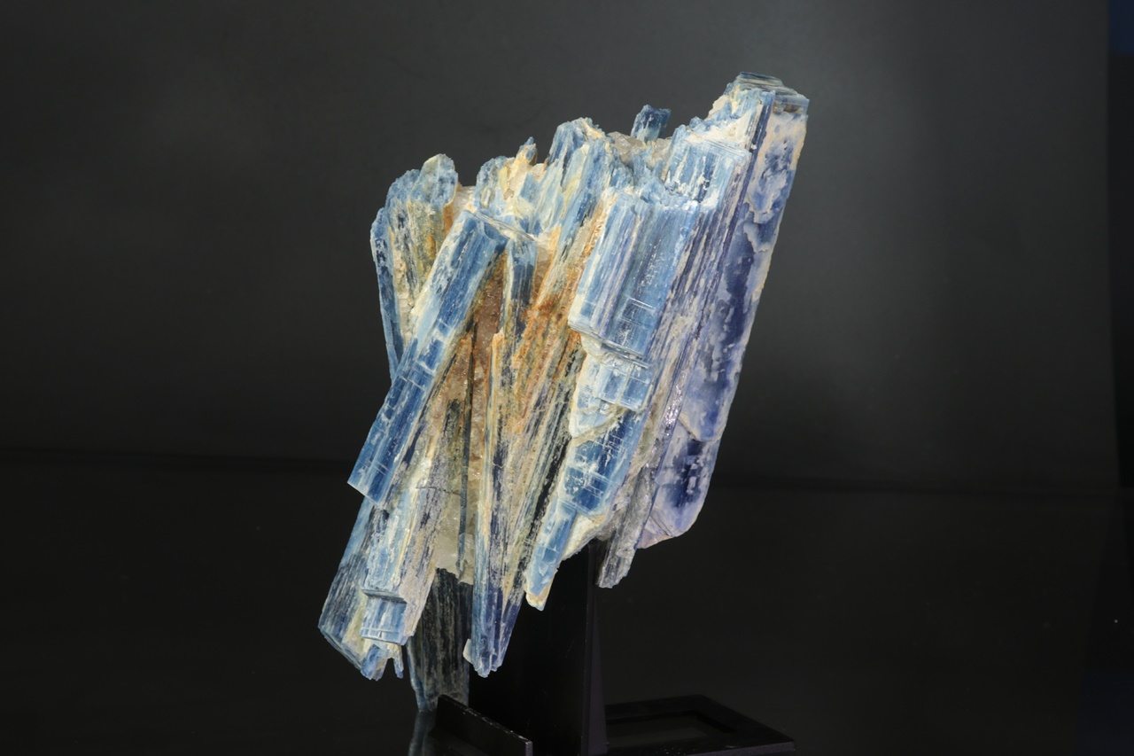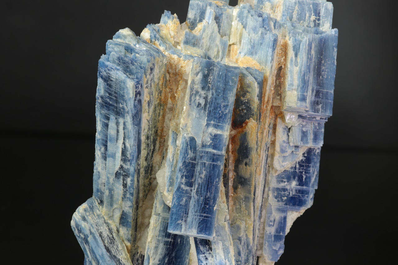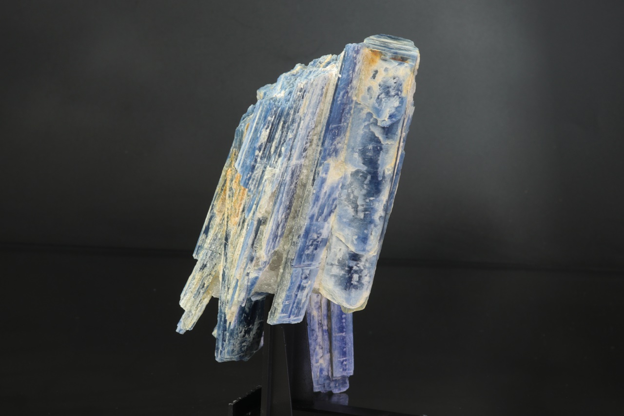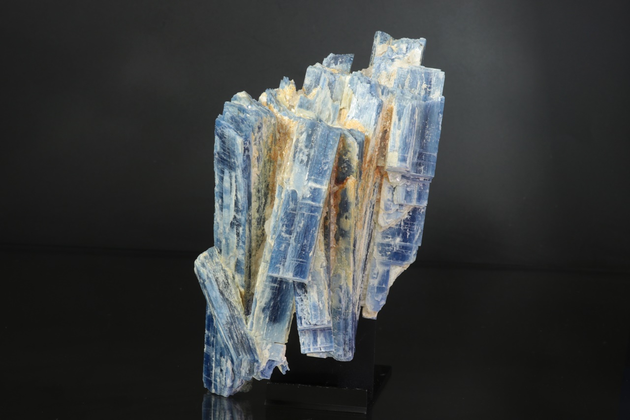 Velký vzorek mocných lištovitých krystalů sytě modrého kyanitu v bílém křemeni. Největší krystal je 19 cm dlouhý.