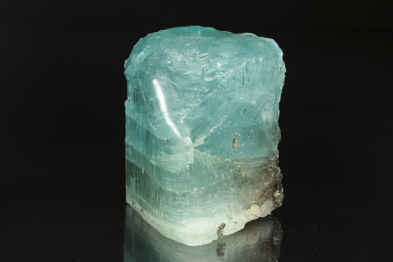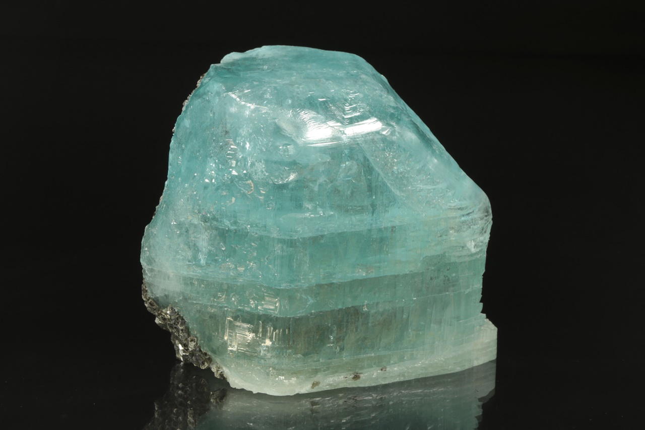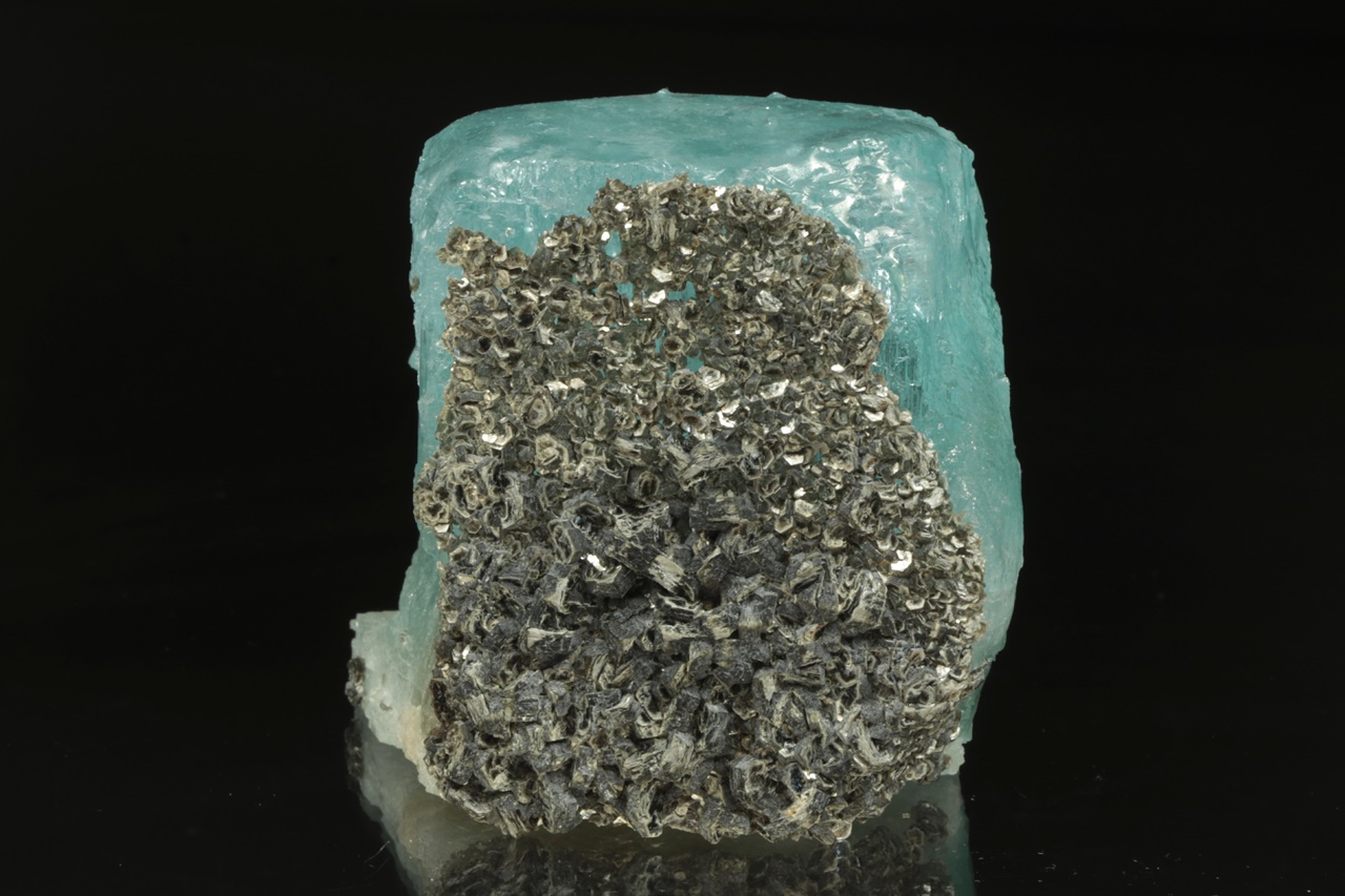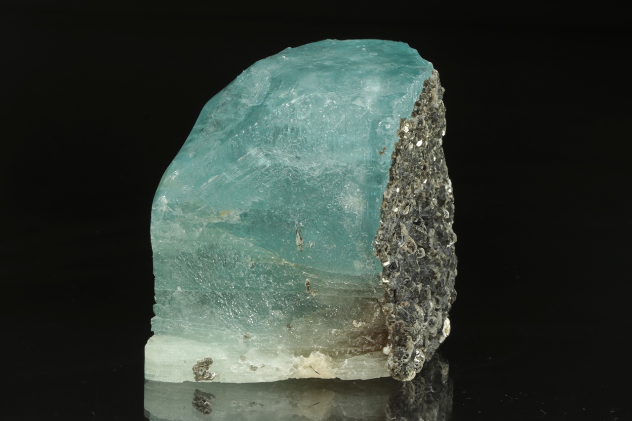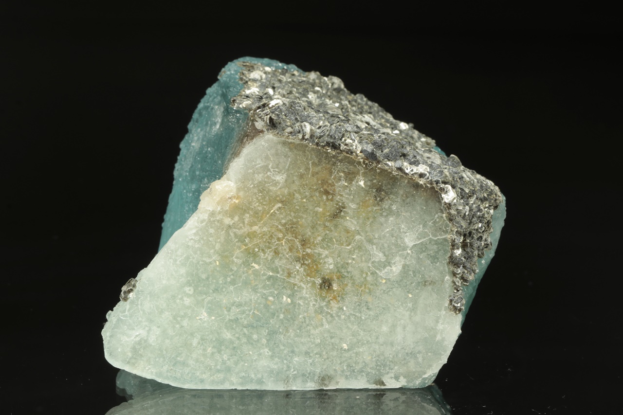 Krystal intenzivně modrého topazu z jedné strany přerostlý černým biotitem. Krystal je ze spodu uštíplý podle báze.