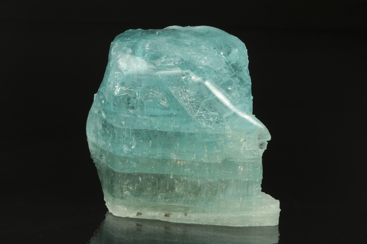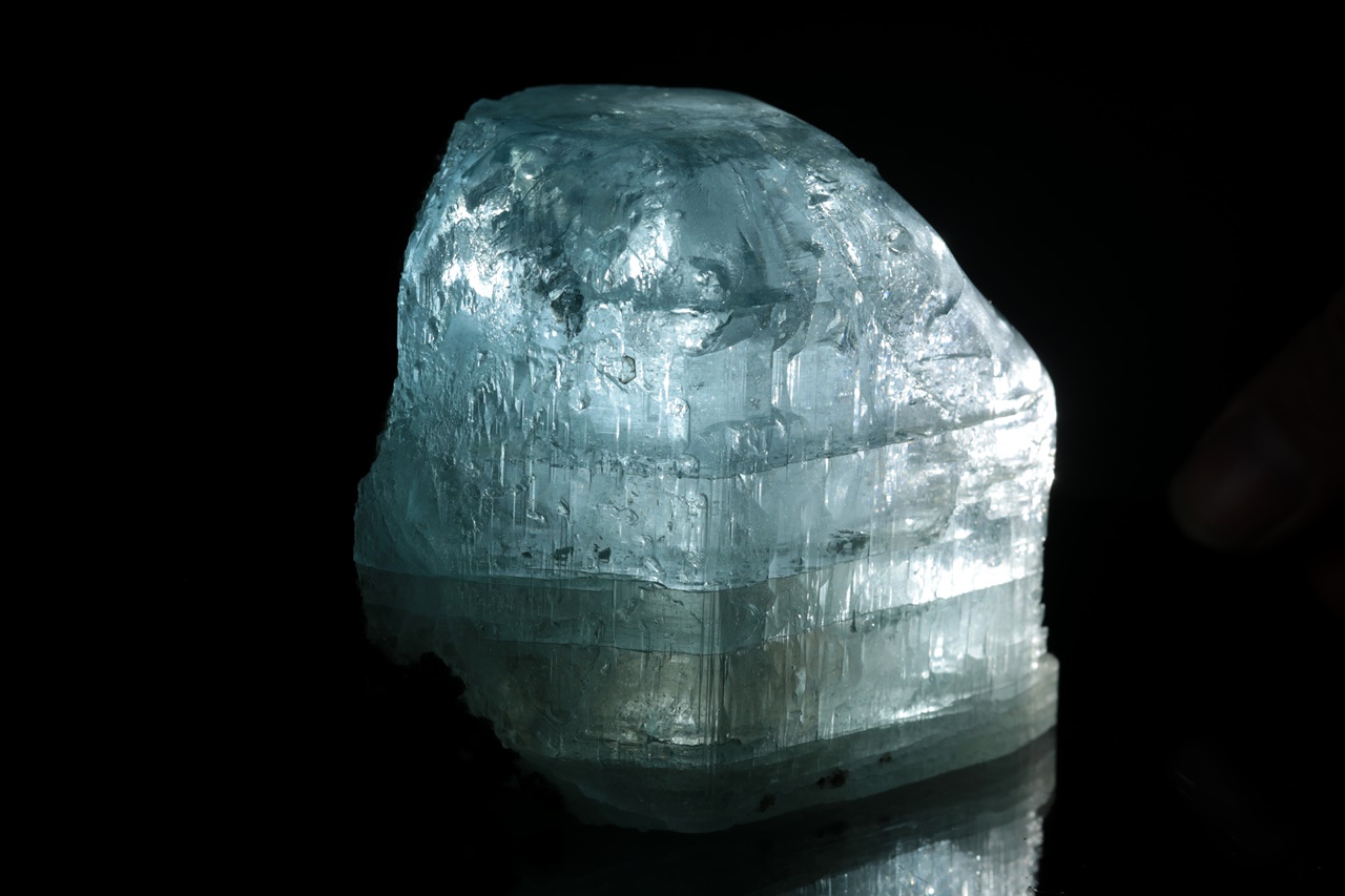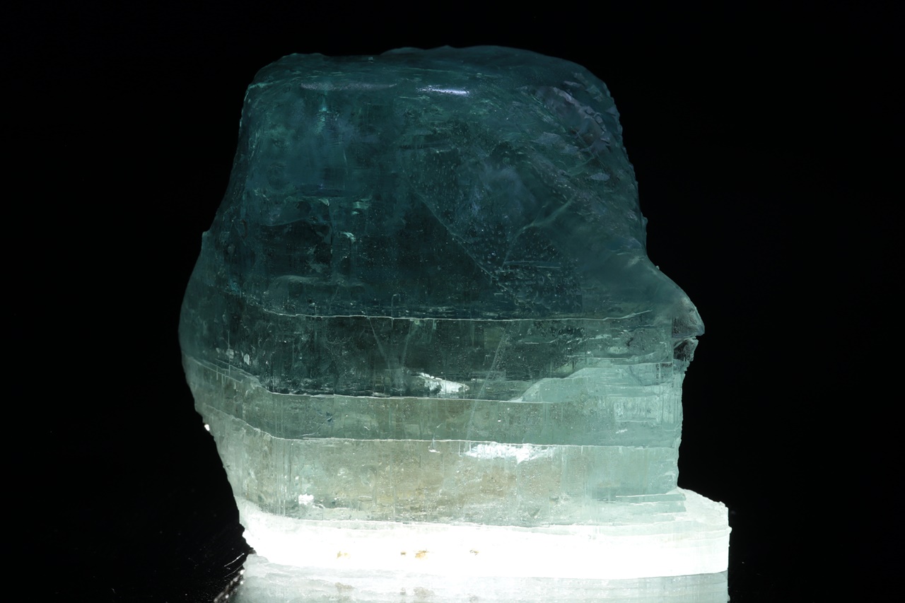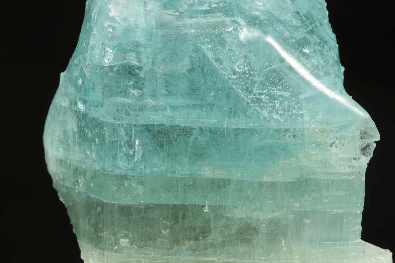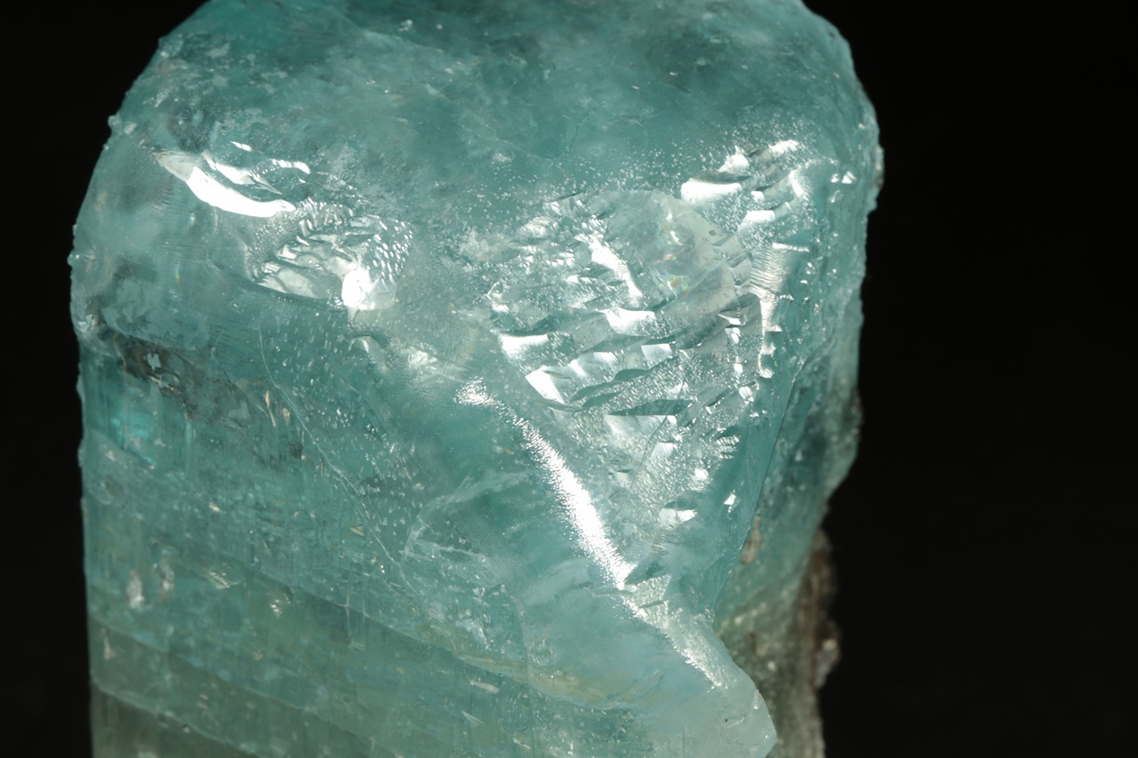 Krystal intenzivně modrého topazu z jedné strany přerostlý černým biotitem. Krystal je ze spodu uštíplý podle báze.