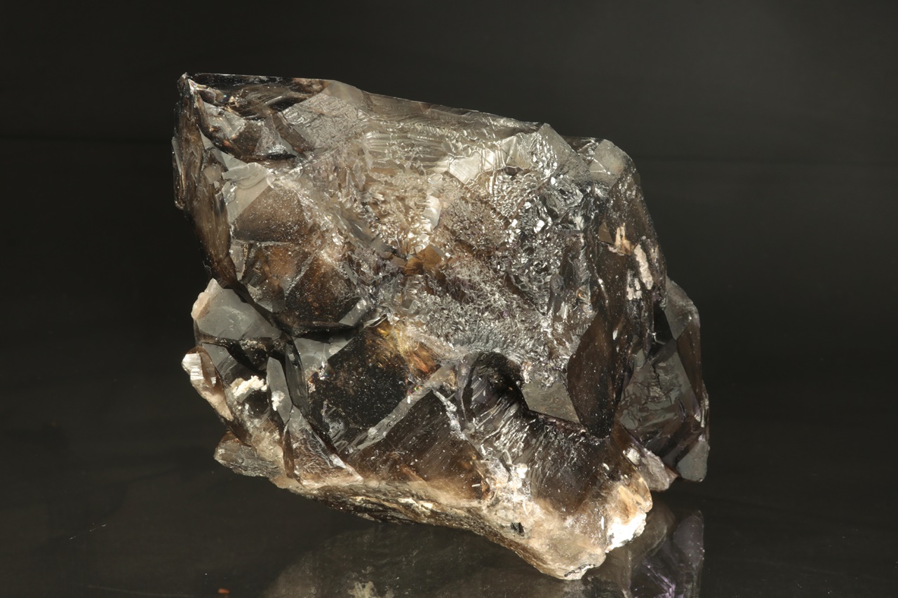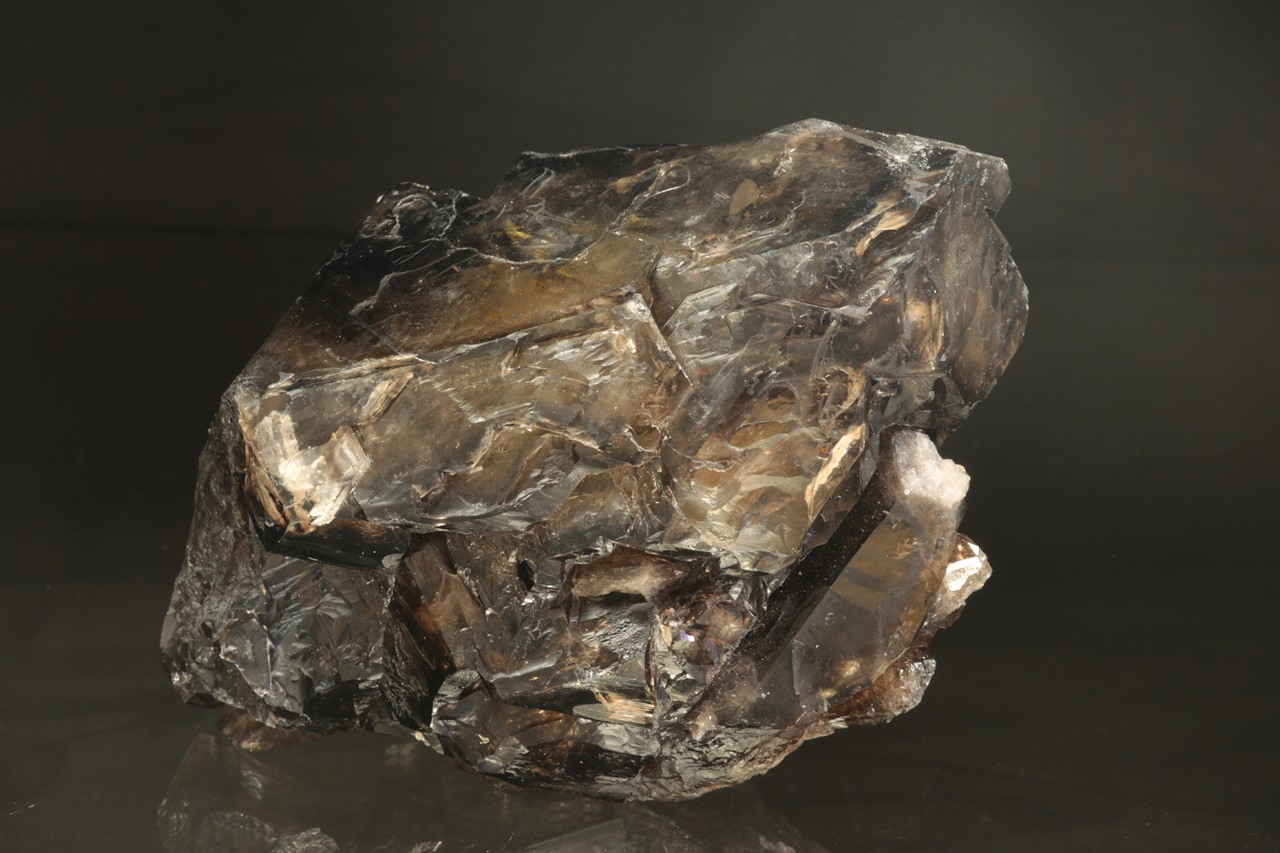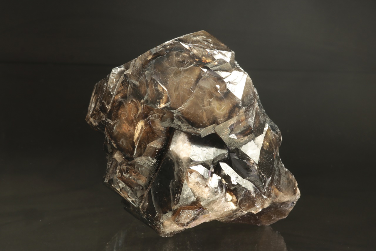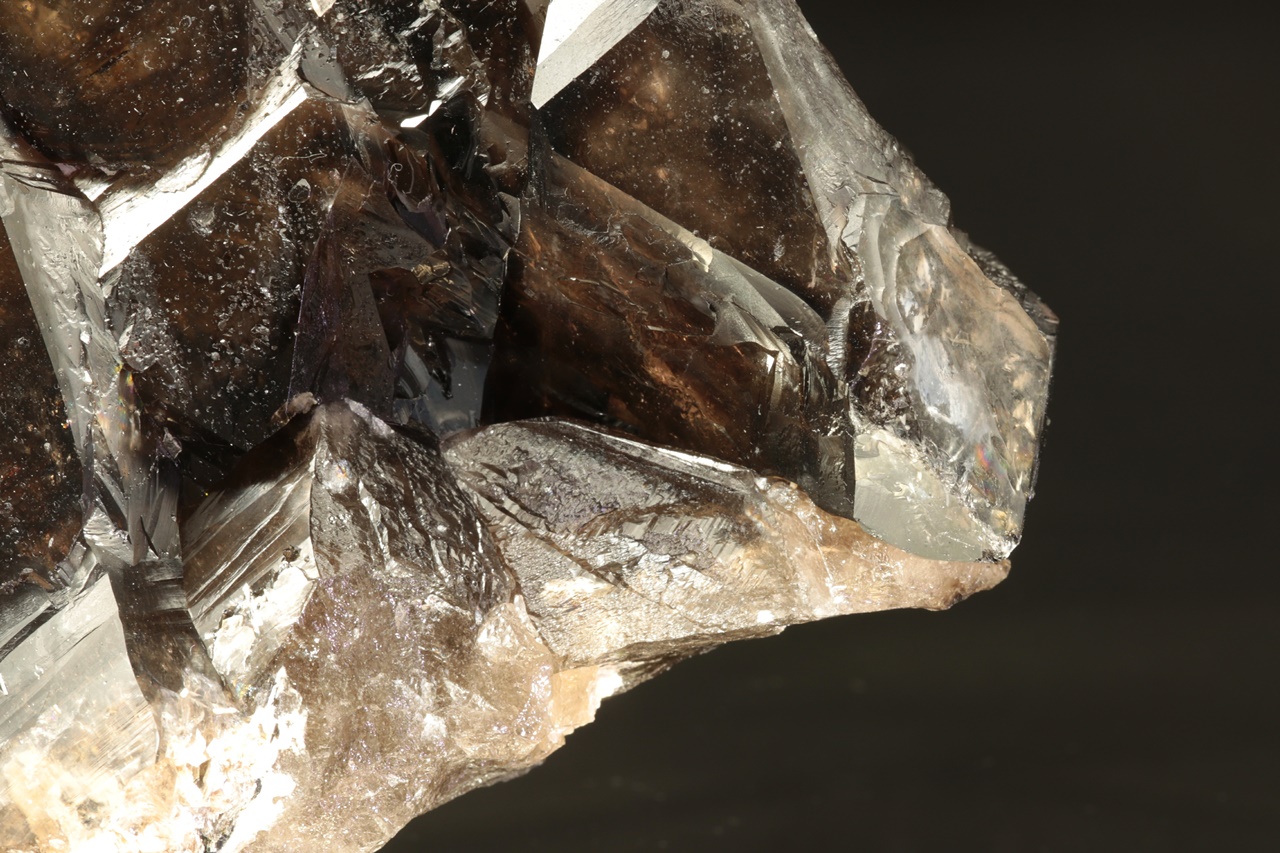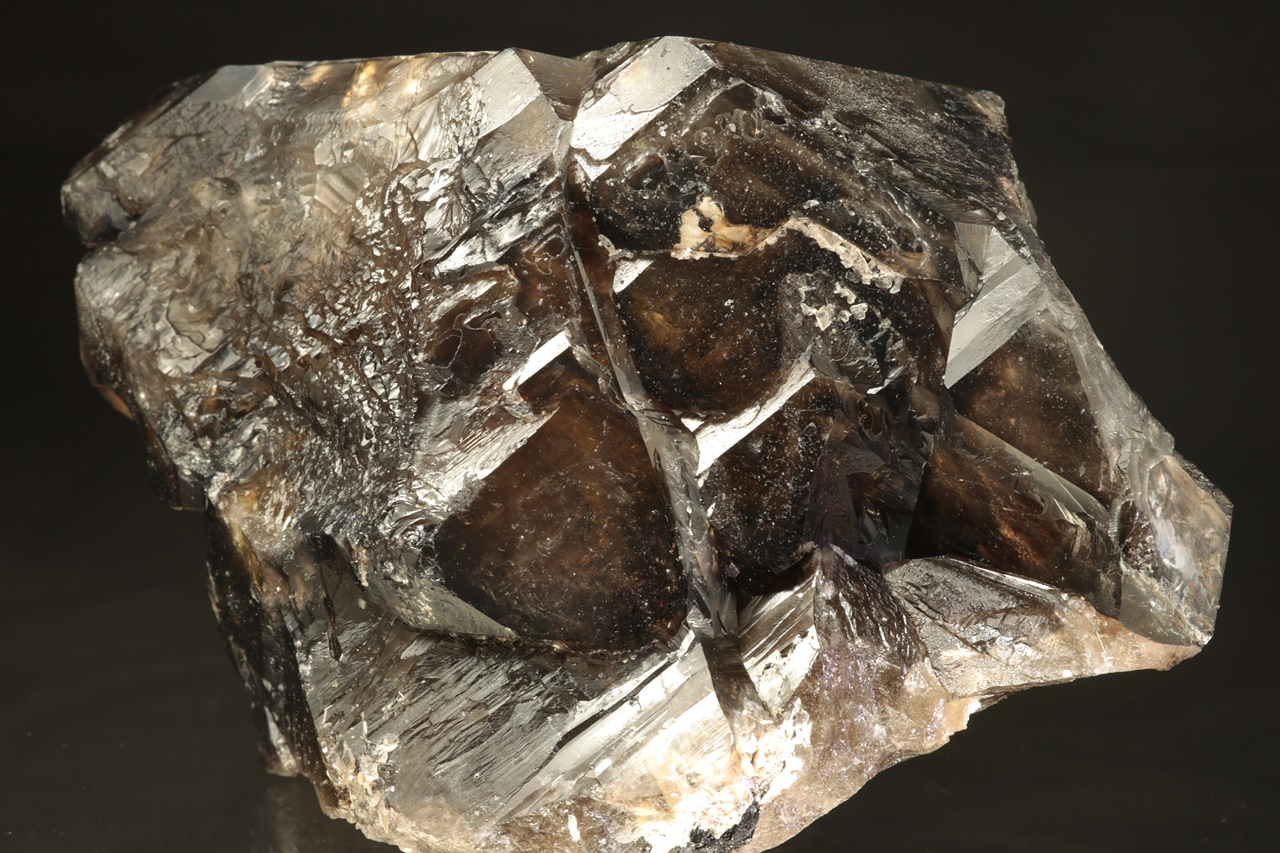 Velká hypoparalelní srotlice krystalů tmavé záhnědy. Srostlice je na několi místech přírodně dohojena.