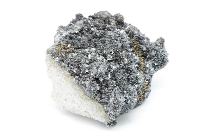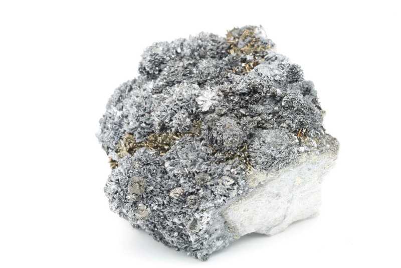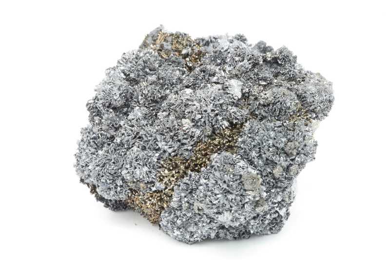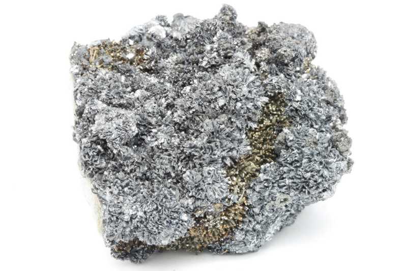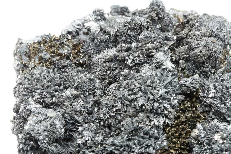Museum specimen of crystallized mineral of antimony, tin, iron and lead — franckeite from Bolivia. Collection specimen of unusually large (up to 5 mm) foliated crystals of the uncommon franckeite, a complex sulfosalt, from its Bolivian type locality.