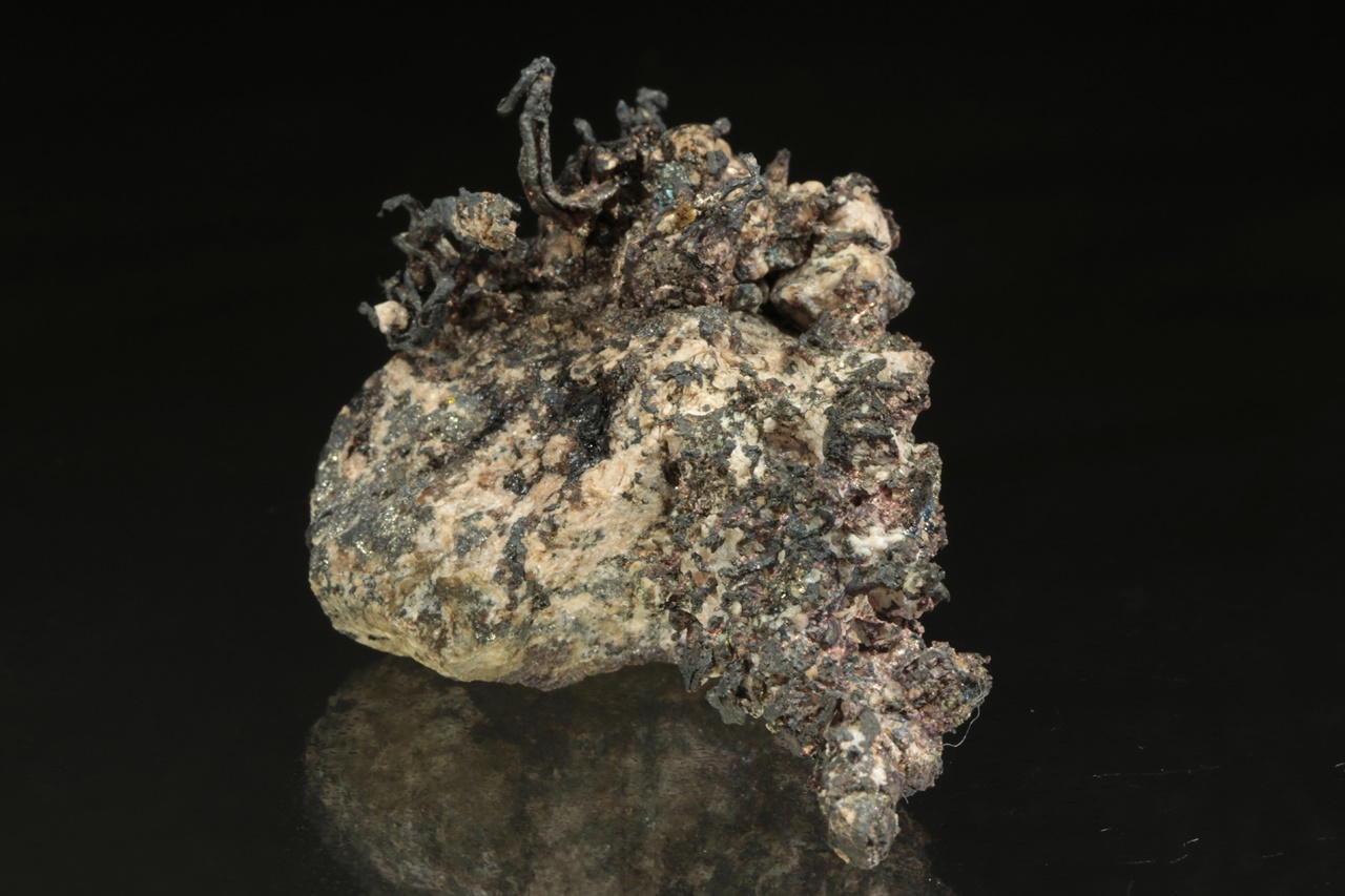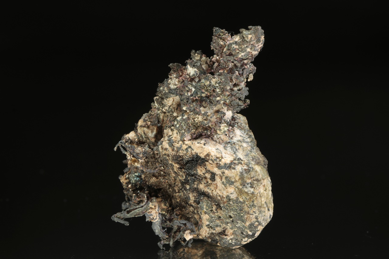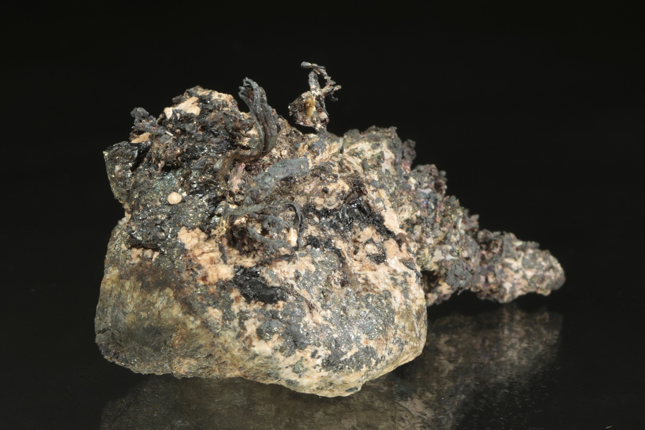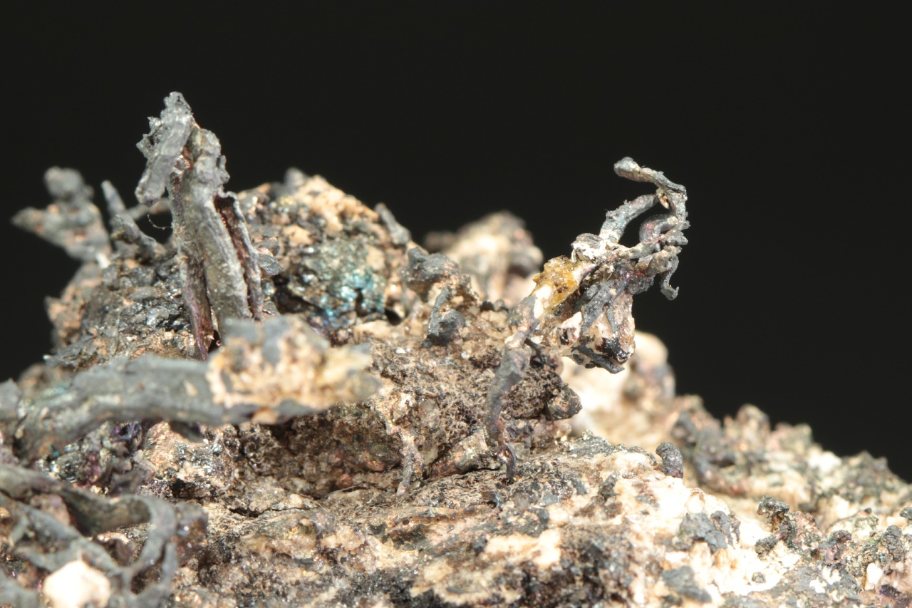 Vzorek stříbra ze známé peruánské lokality narostlého na podložce. Stříbro v jedné části vzorku tvoří bohatě narostlé dráty až lokny velké až 1,5 cm velké, v druhé pak mohutný keřík velký 3 cm.