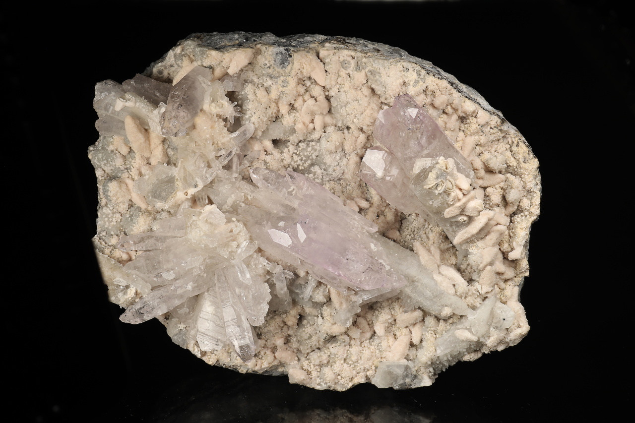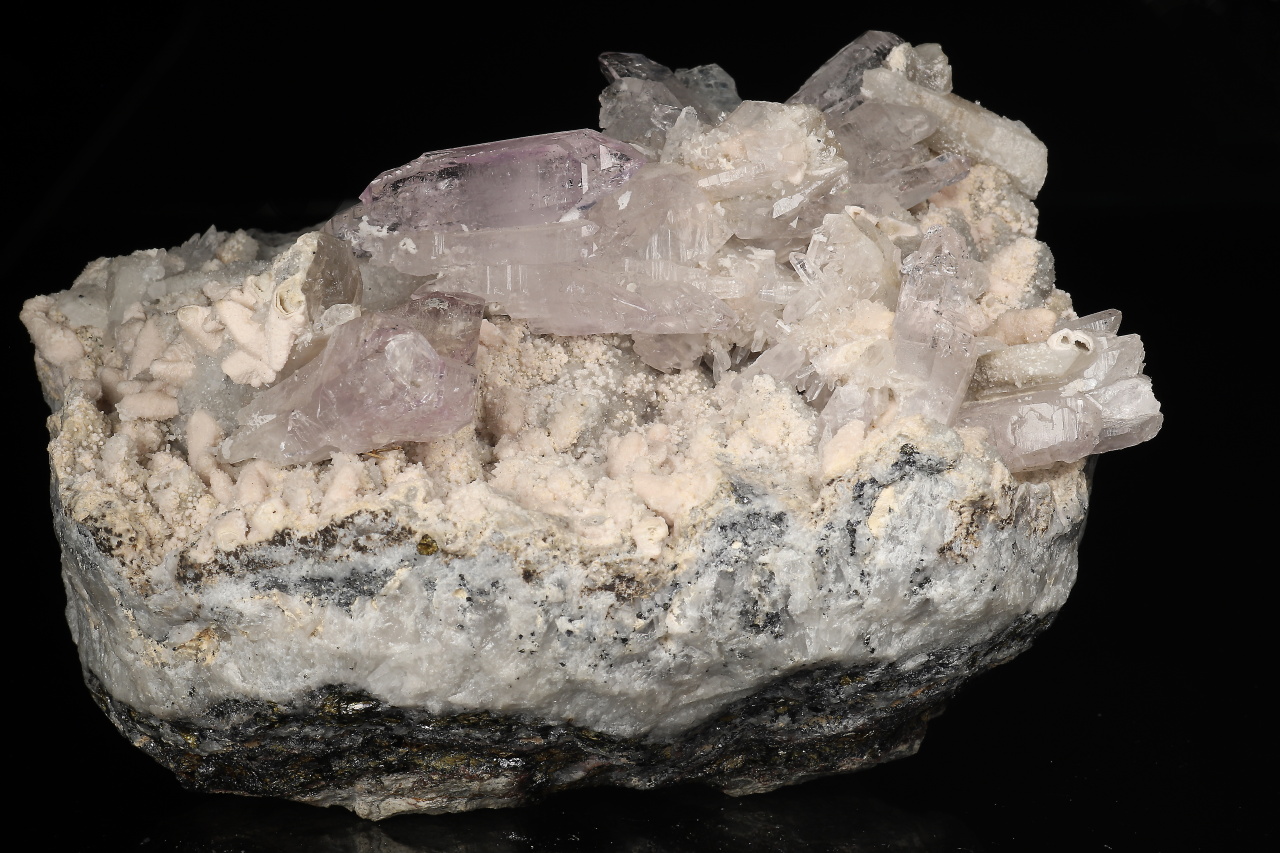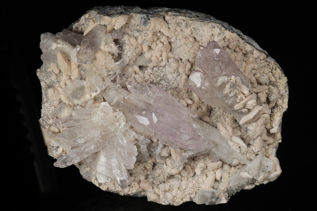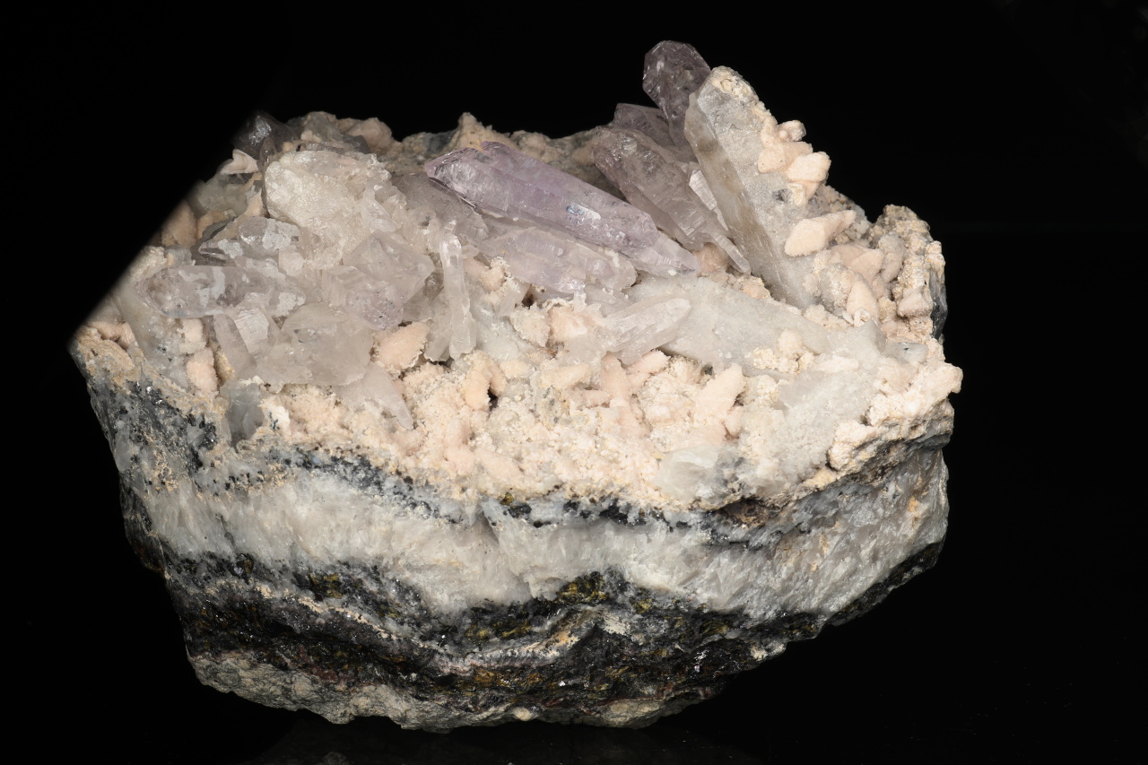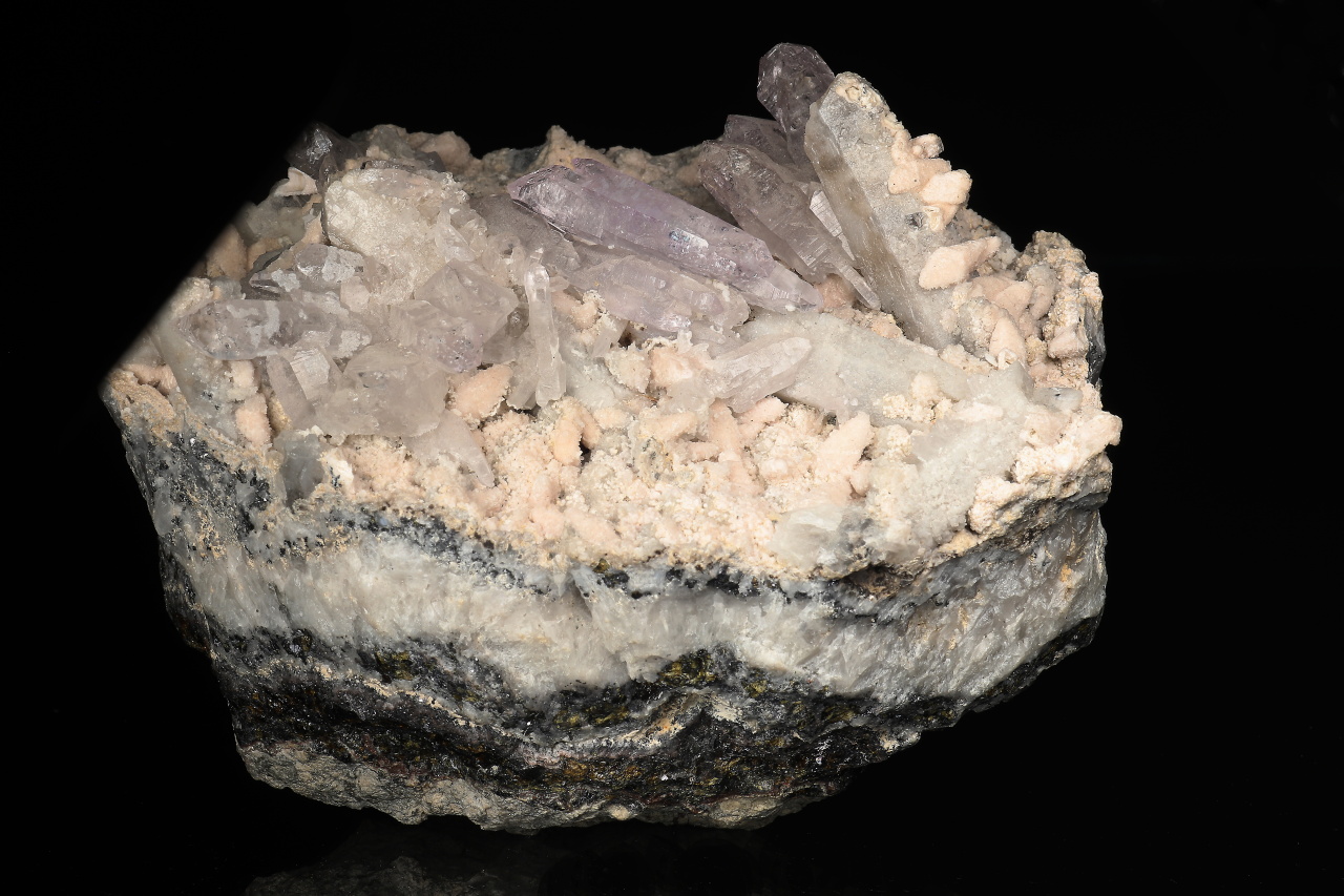 An aesthetic large specimen of pinkish dolomite crystals with light amethyst scepter crystals, so-called “pigeon eggs”. The specimen is composed of clear double-terminated quartz crystals with a white younger crust, onto the apexes of which adhere transparent light purple double-terminated amethyst crystals. These crystals are accompanied by pinkish dolomite. These minerals grow on a massive galena-sphalerite vein. A historical, larger, very elegant specimen from Banská Štiavnica.