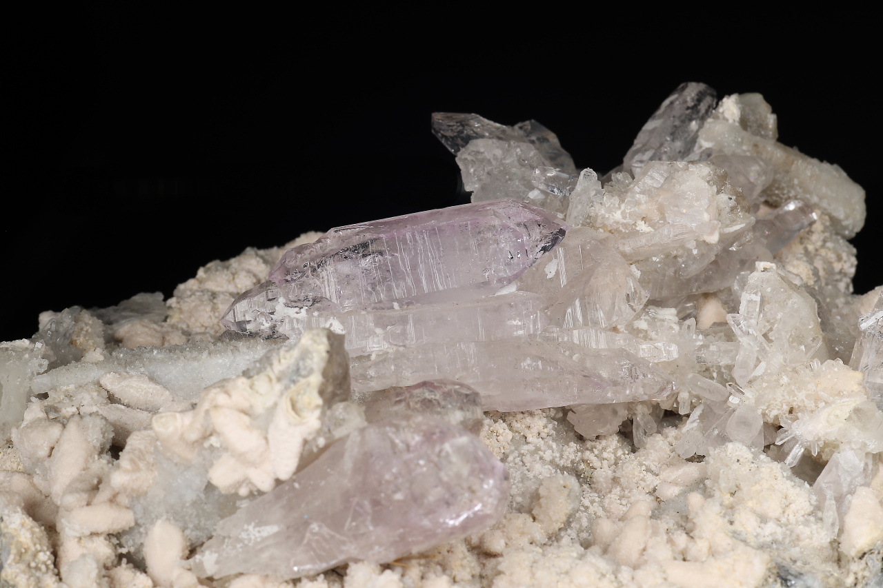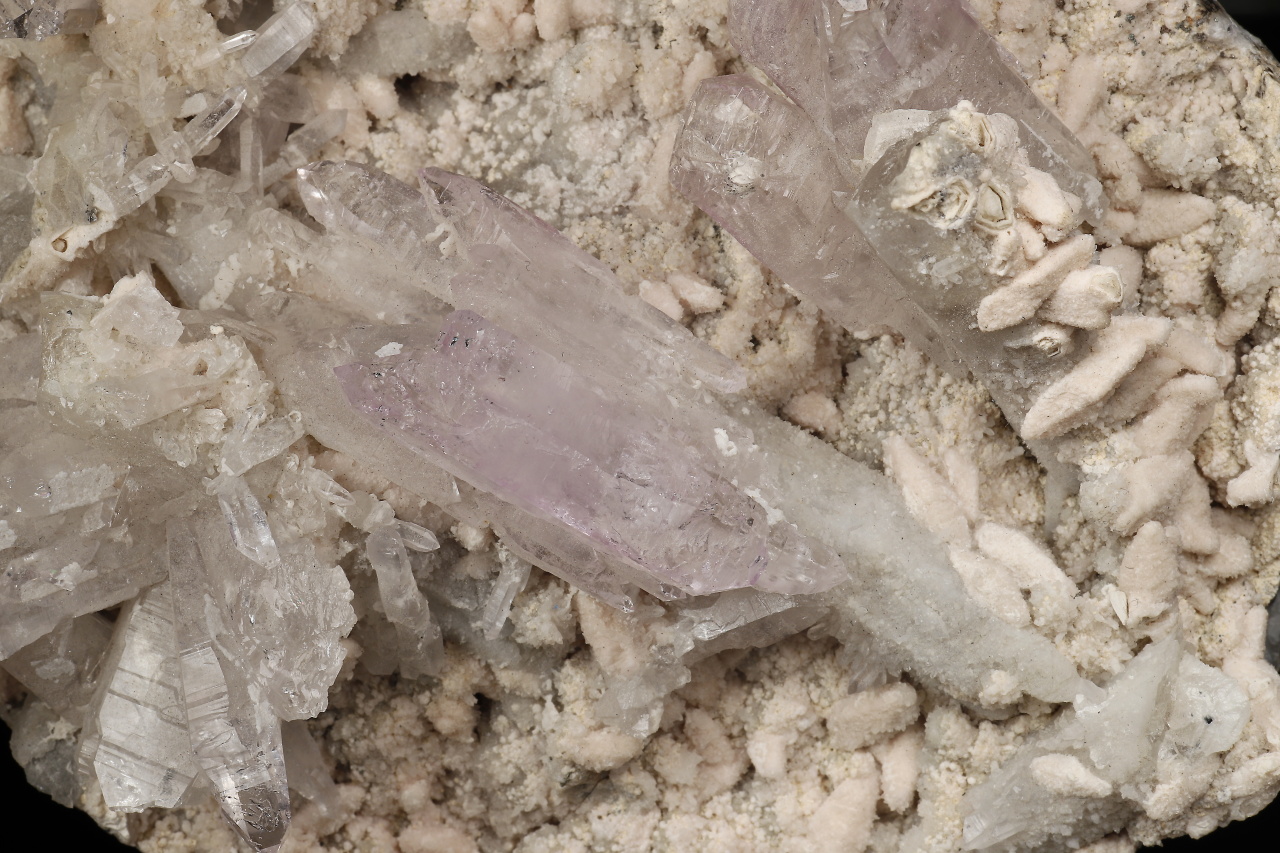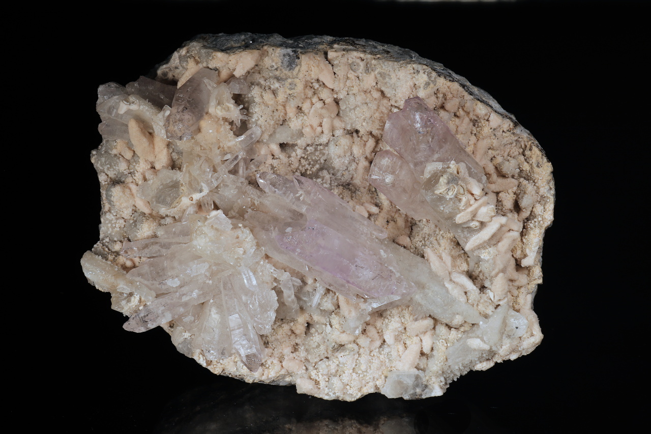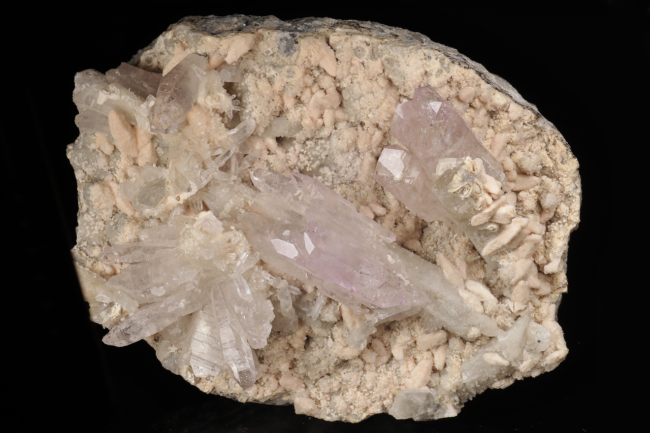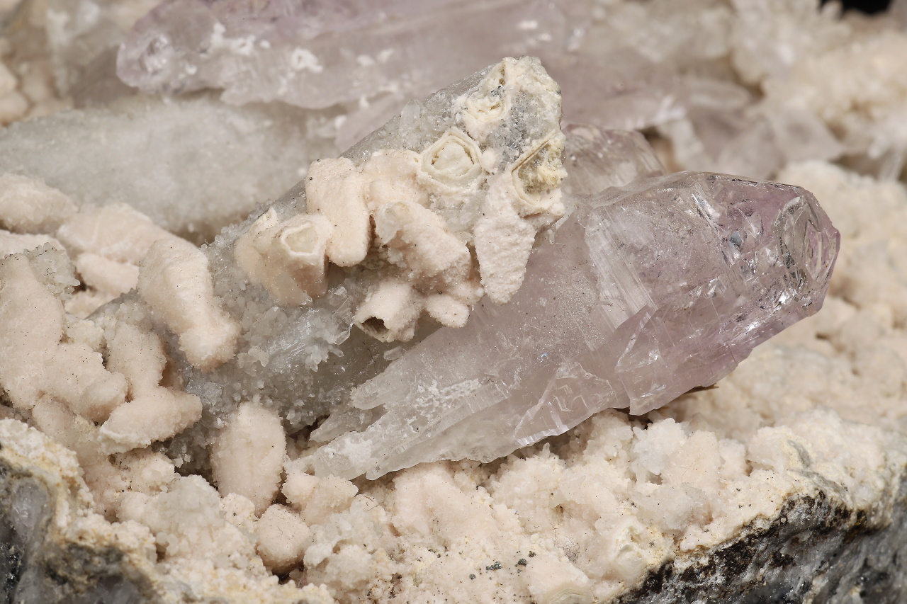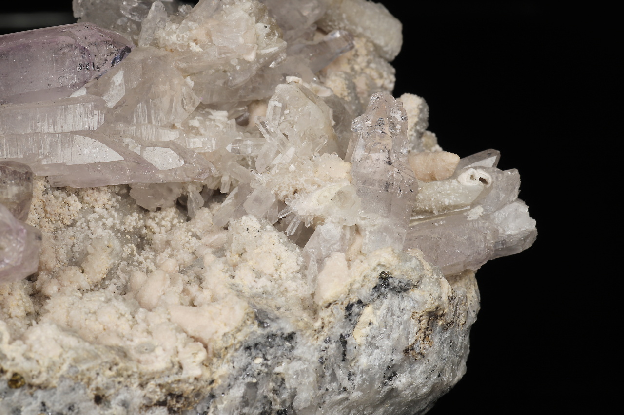 An aesthetic large specimen of pinkish dolomite crystals with light amethyst scepter crystals, so-called “pigeon eggs”. The specimen is composed of clear double-terminated quartz crystals with a white younger crust, onto the apexes of which adhere transparent light purple double-terminated amethyst crystals. These crystals are accompanied by pinkish dolomite. These minerals grow on a massive galena-sphalerite vein. A historical, larger, very elegant specimen from Banská Štiavnica.