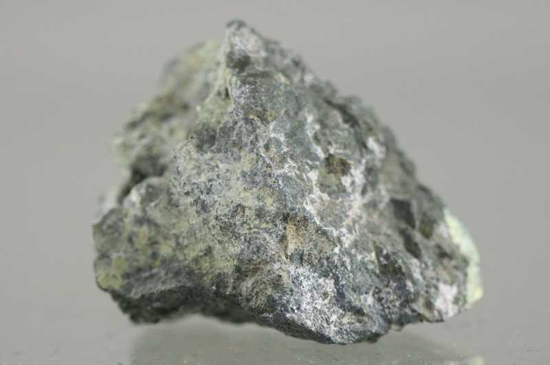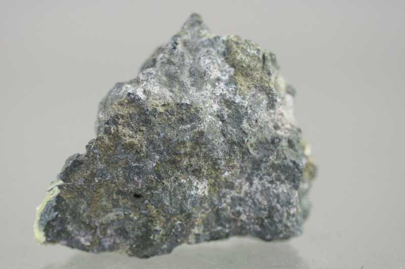 Bismuth native with skutterudite from the Jáchymov locality. A specimen of massive skutterudite together with metallic shiny grains of native bismuth.