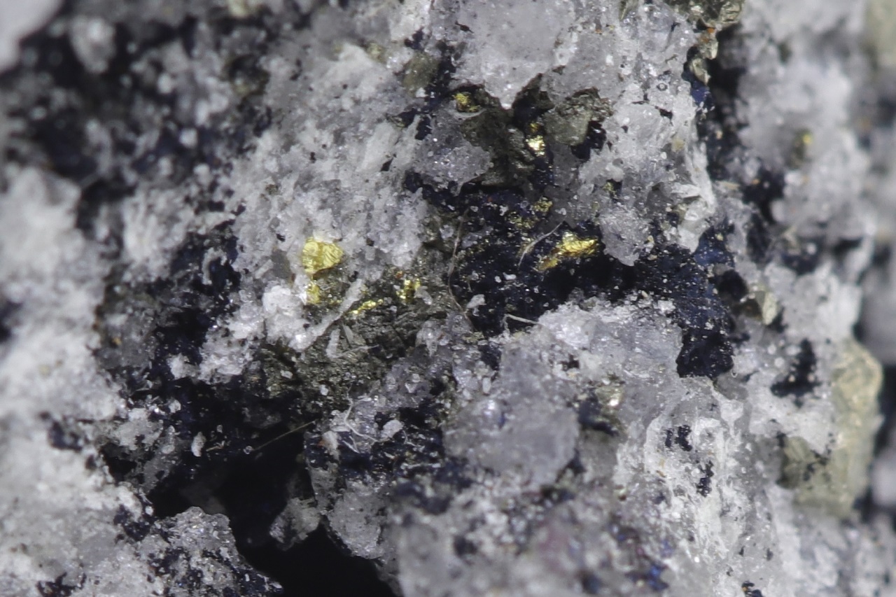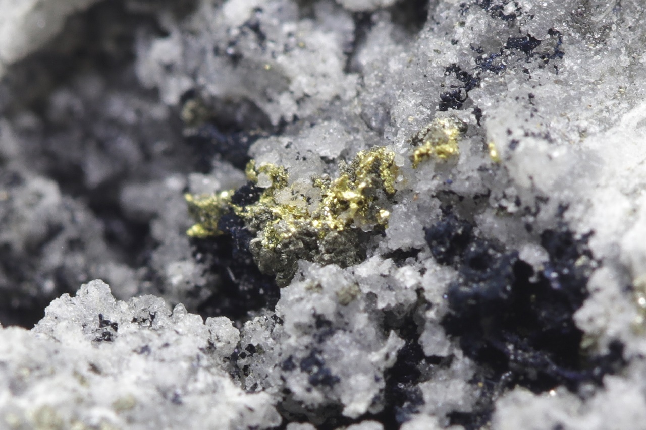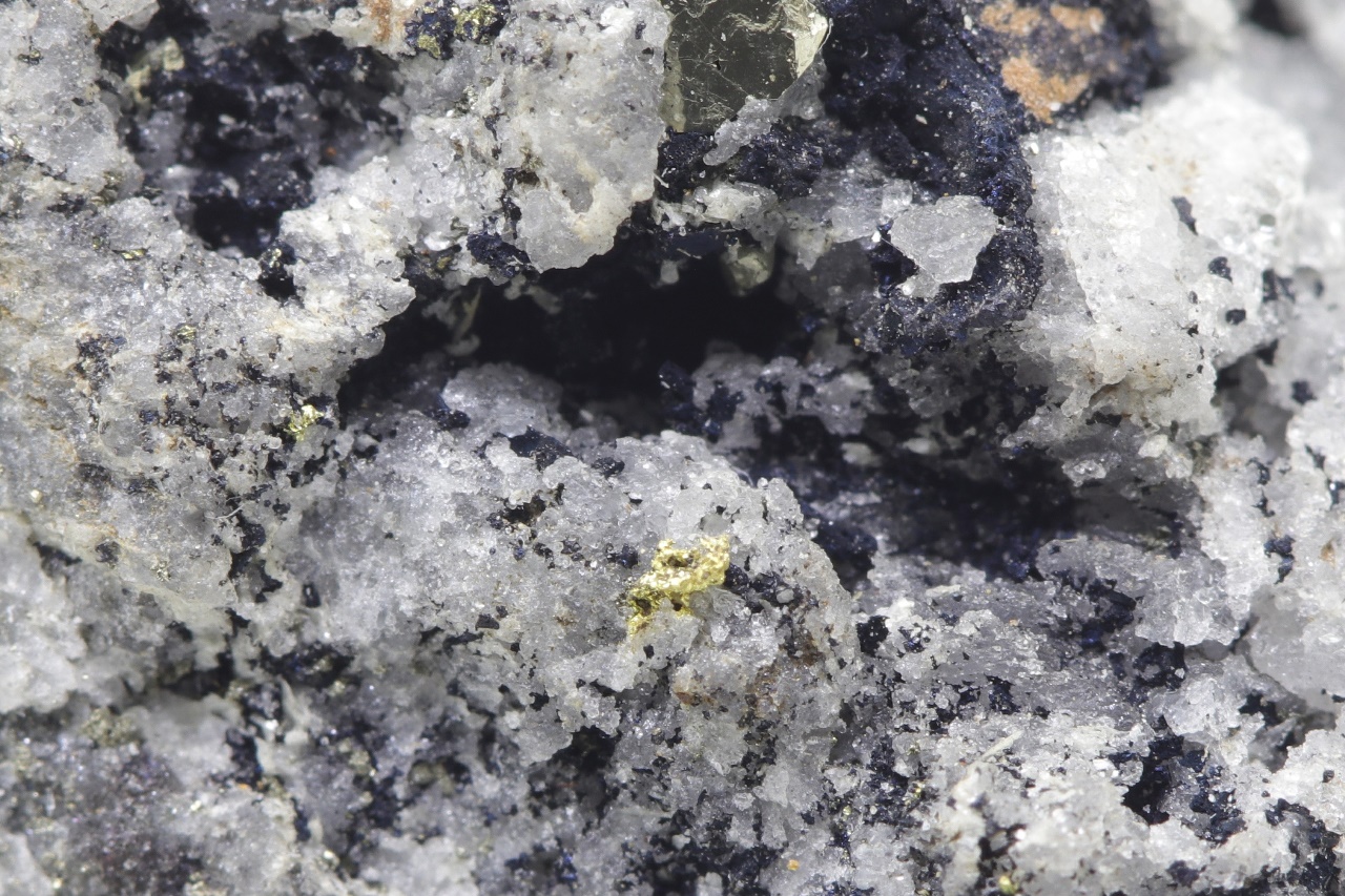 Shrub-like clusters and crystals of native gold in a quartz vein with pyrite. The size of the largest shrub is 5 mm.