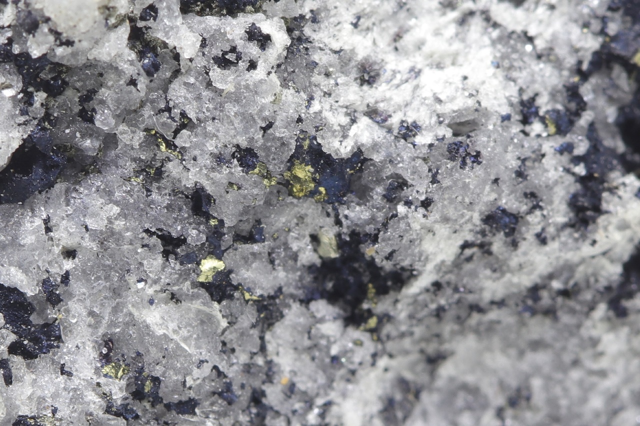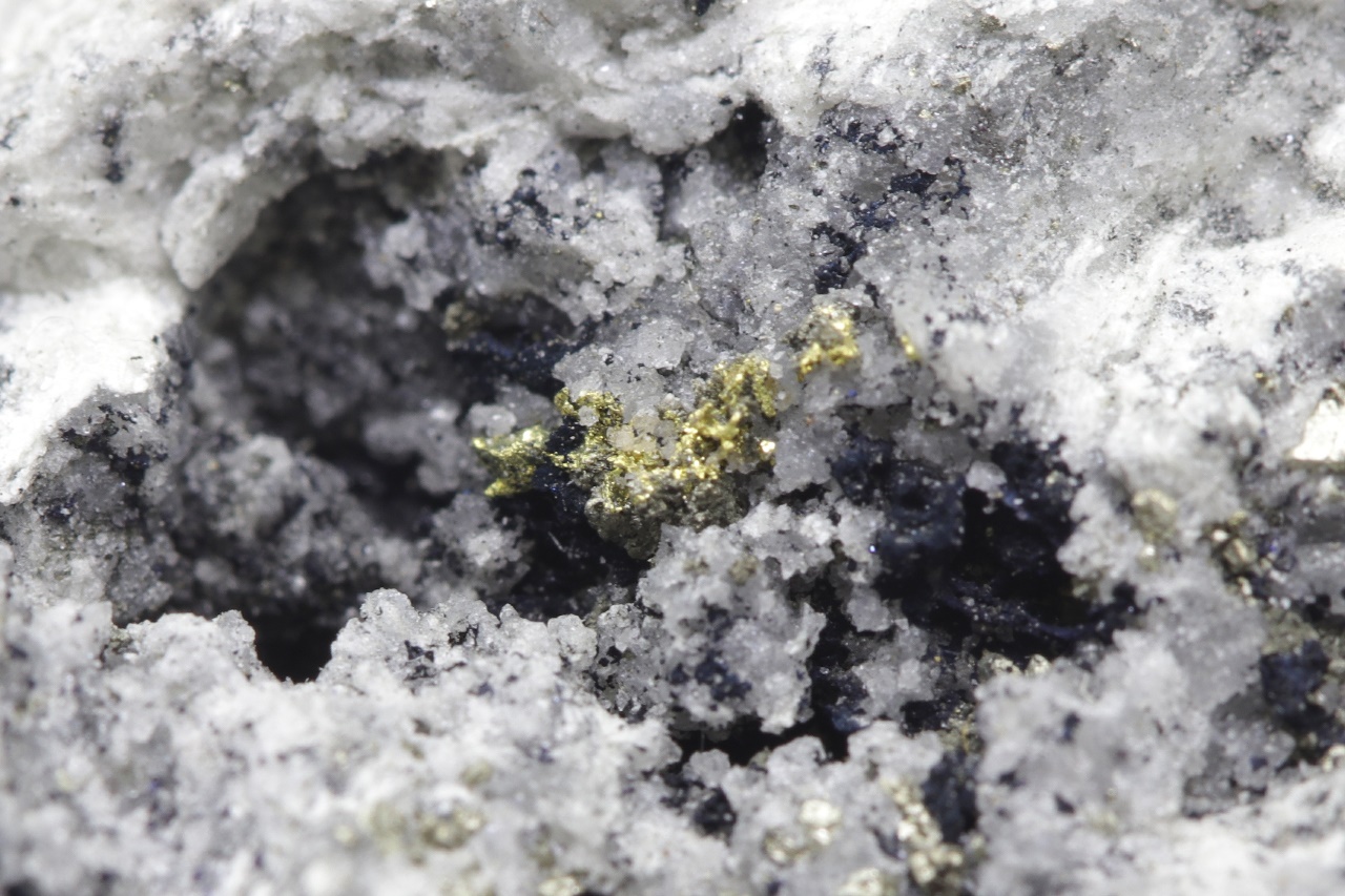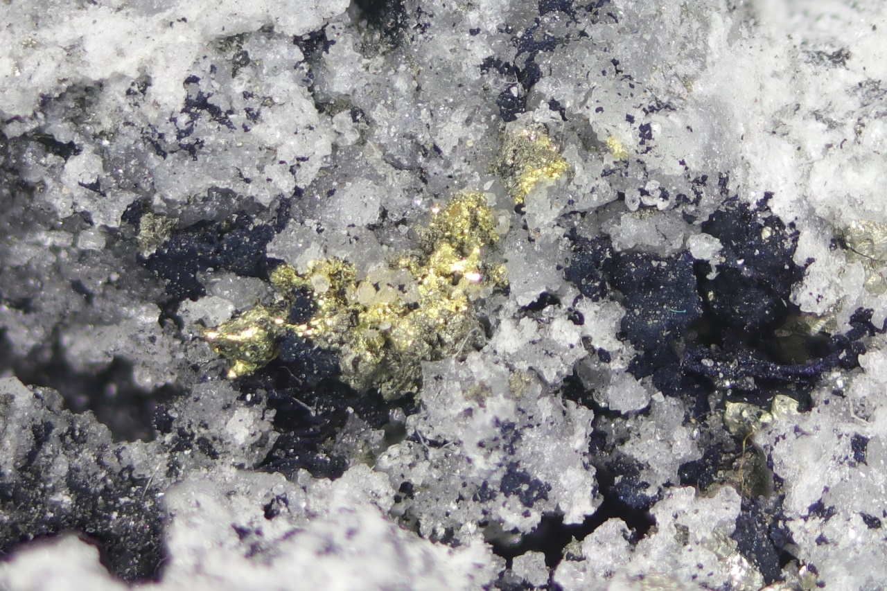 Shrub-like clusters and crystals of native gold in a quartz vein with pyrite. The size of the largest shrub is 5 mm.